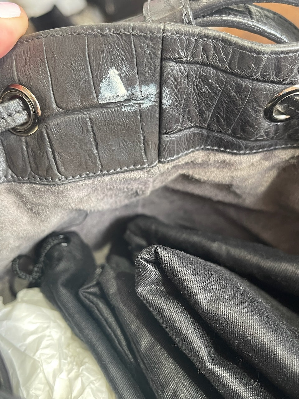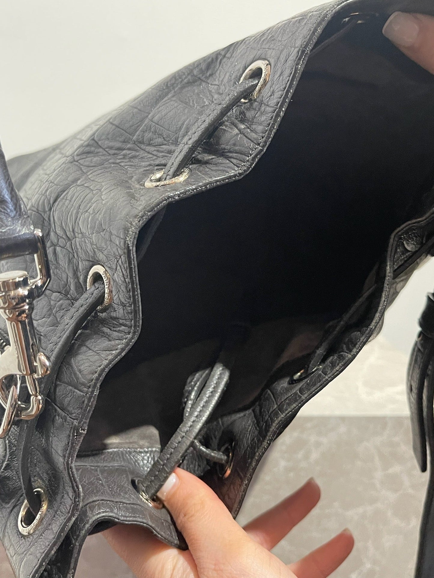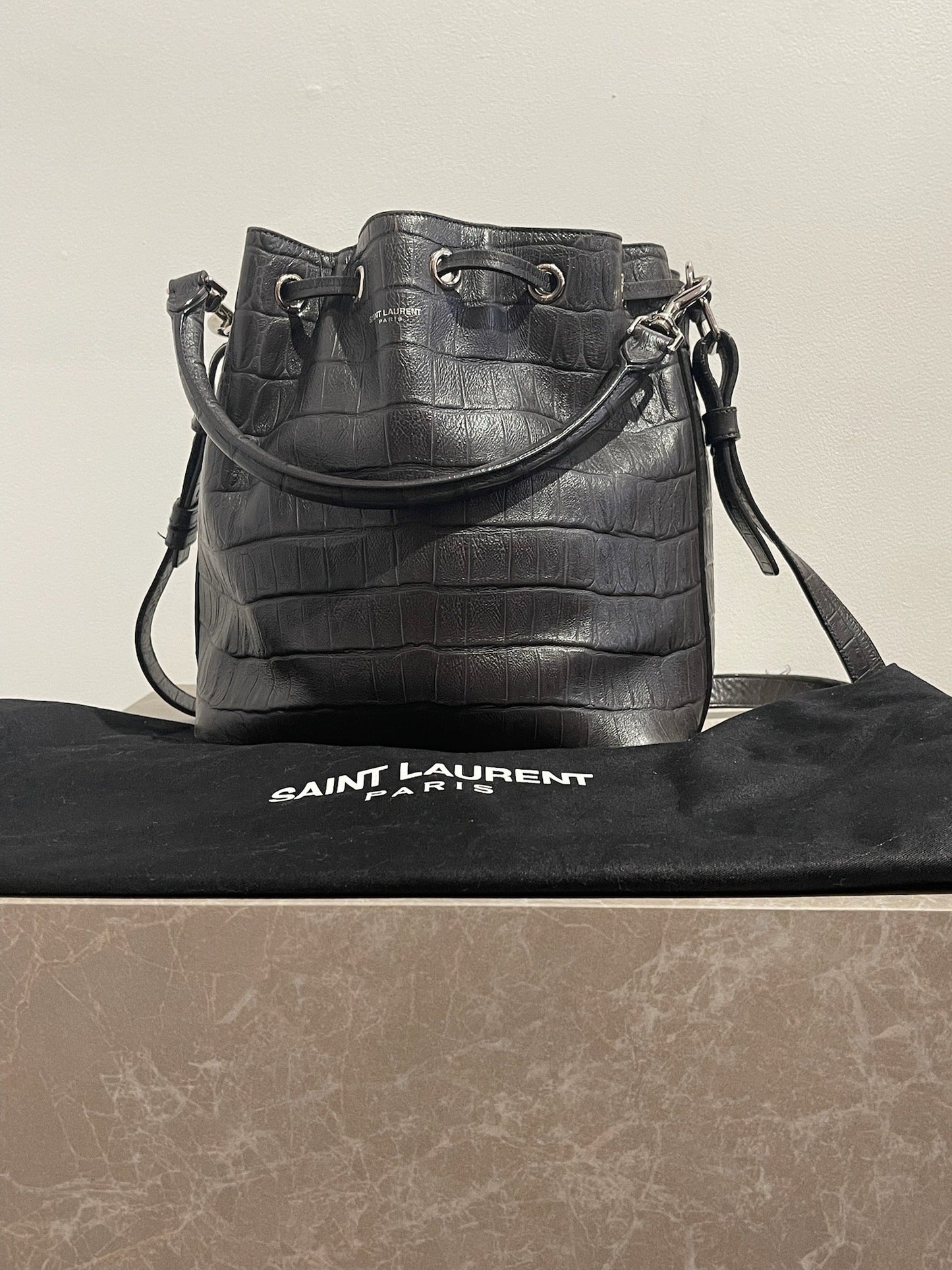 Sac seau en cuir embossé serpent gris avec petite anse sur le dessus pour un porté main et bandoulière ajustable et amovible pour un porté crossbody. Fermeture à lien. Poche latérale zippée.