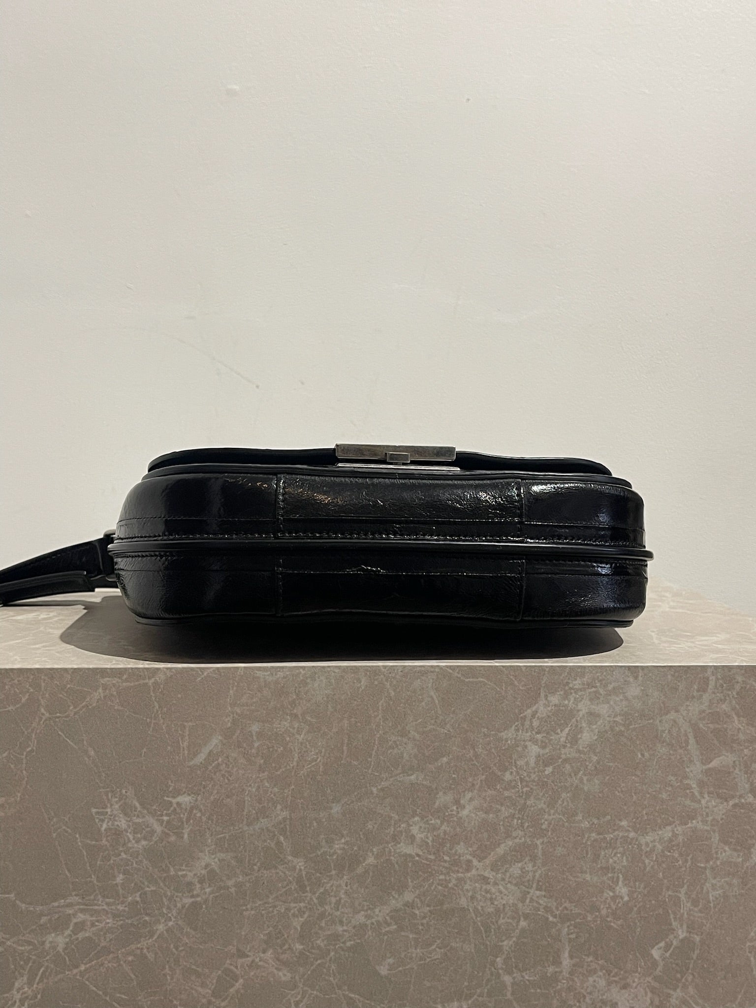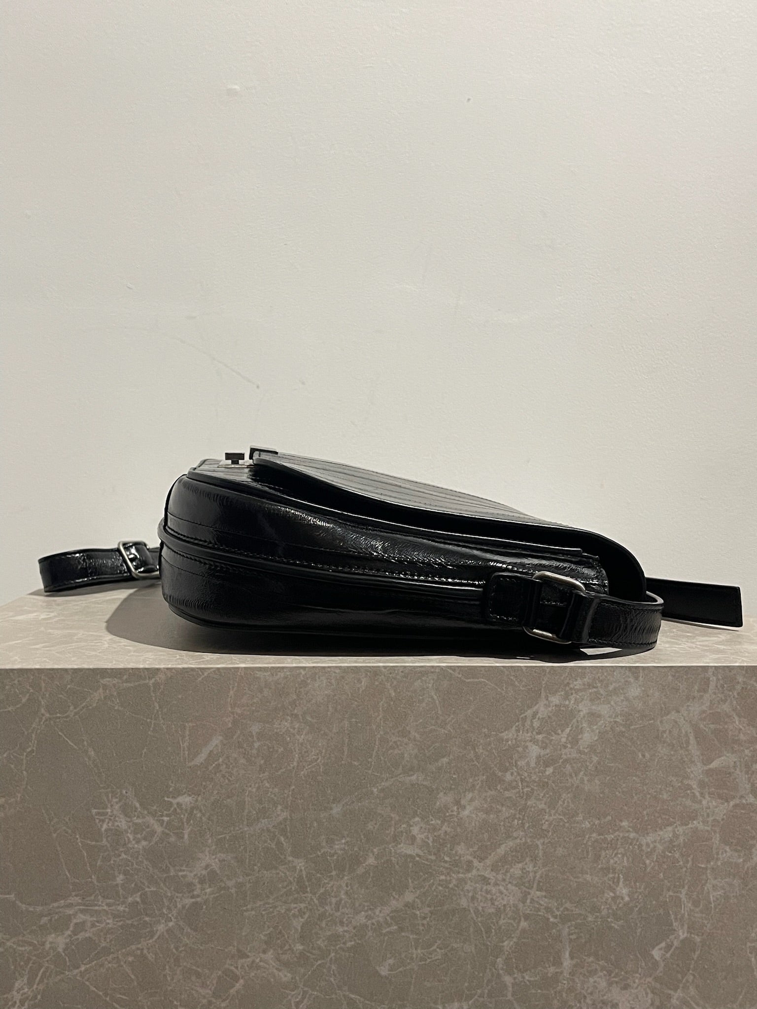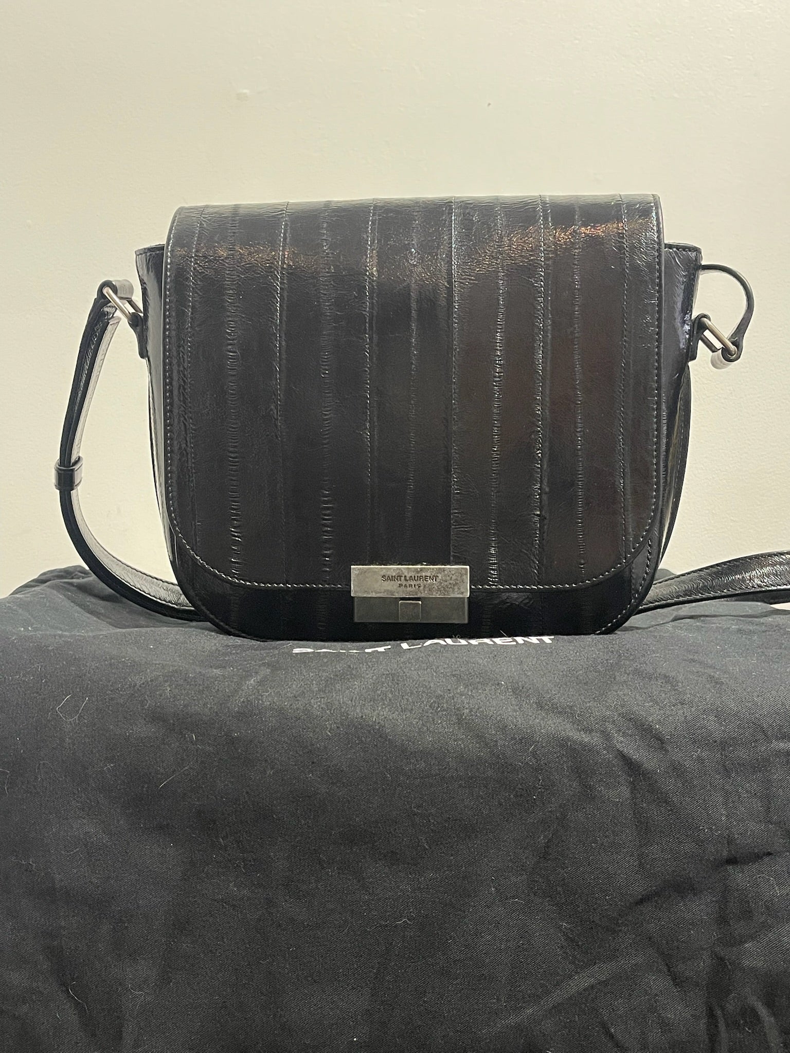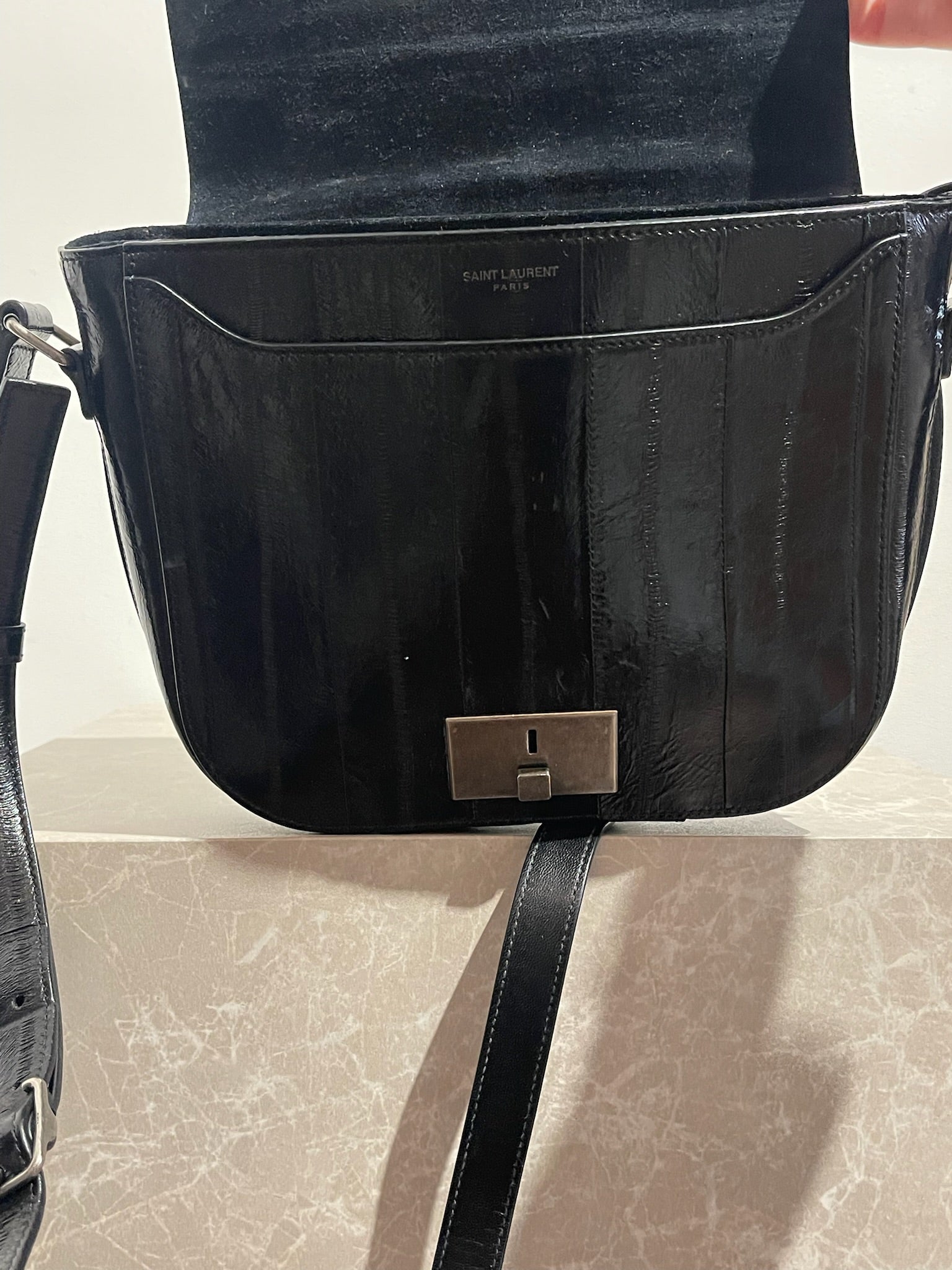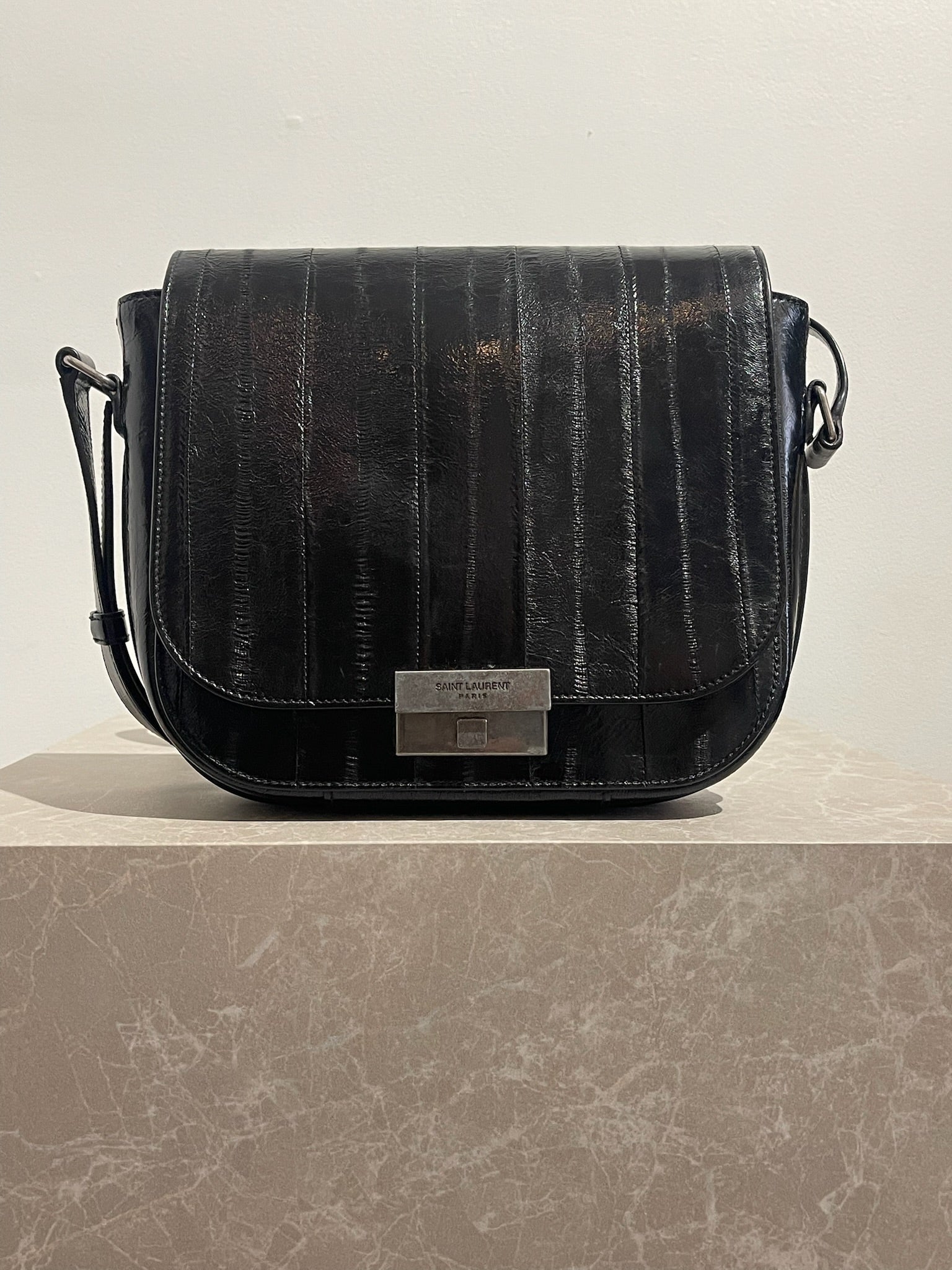 Sac en cuir d’anguille noir avec fermeture à rabat et fermoir à clip signé Saint Laurent et bandoulière ajustable. Poche intérieure plate. Bijouterie argenté.