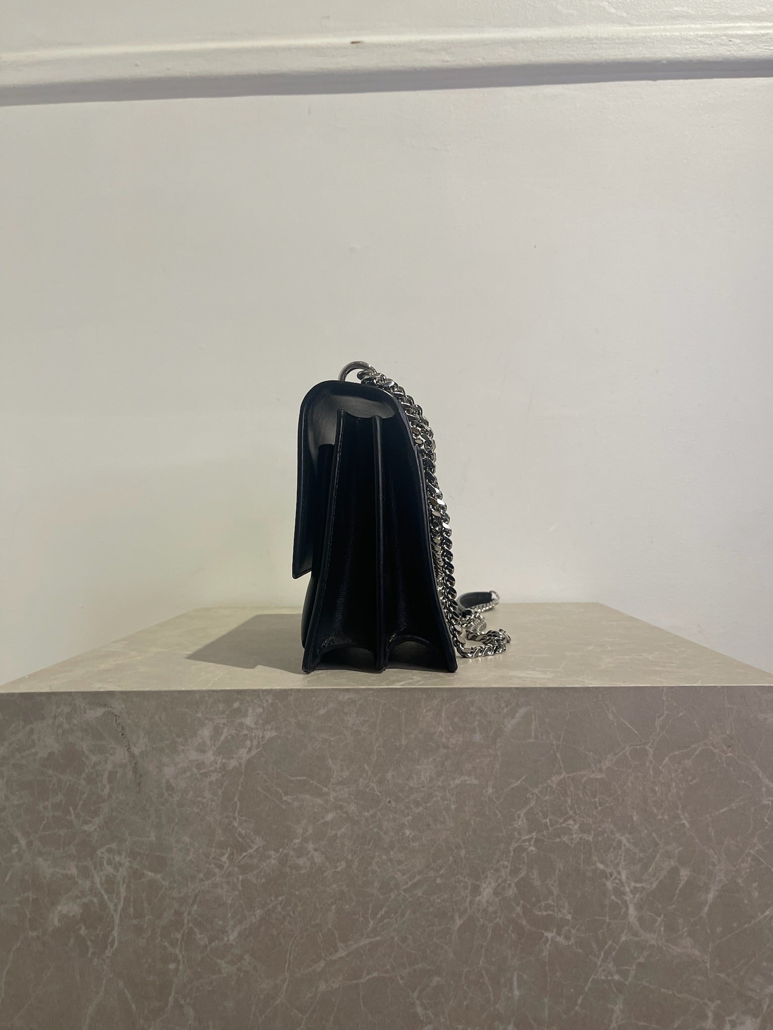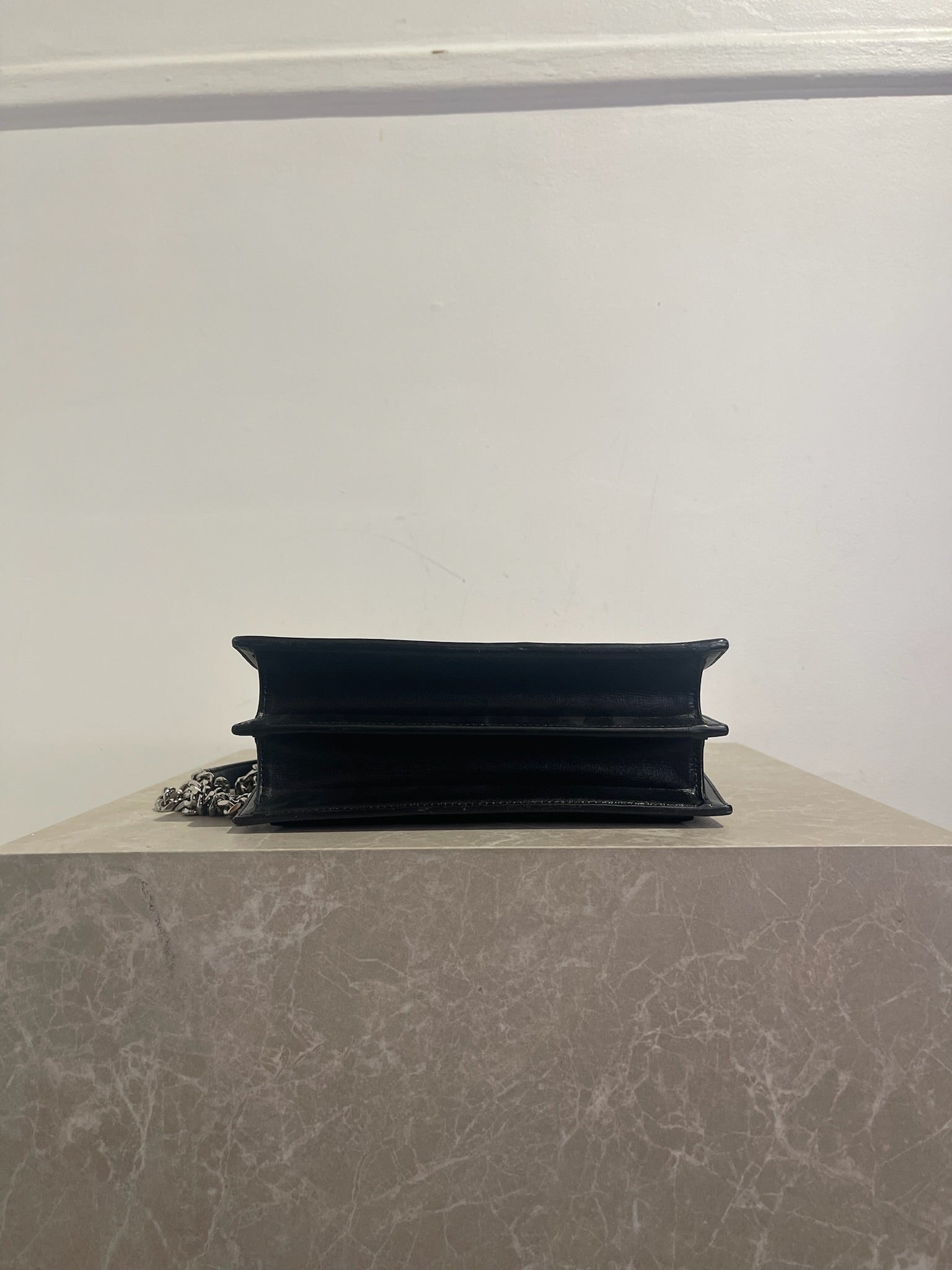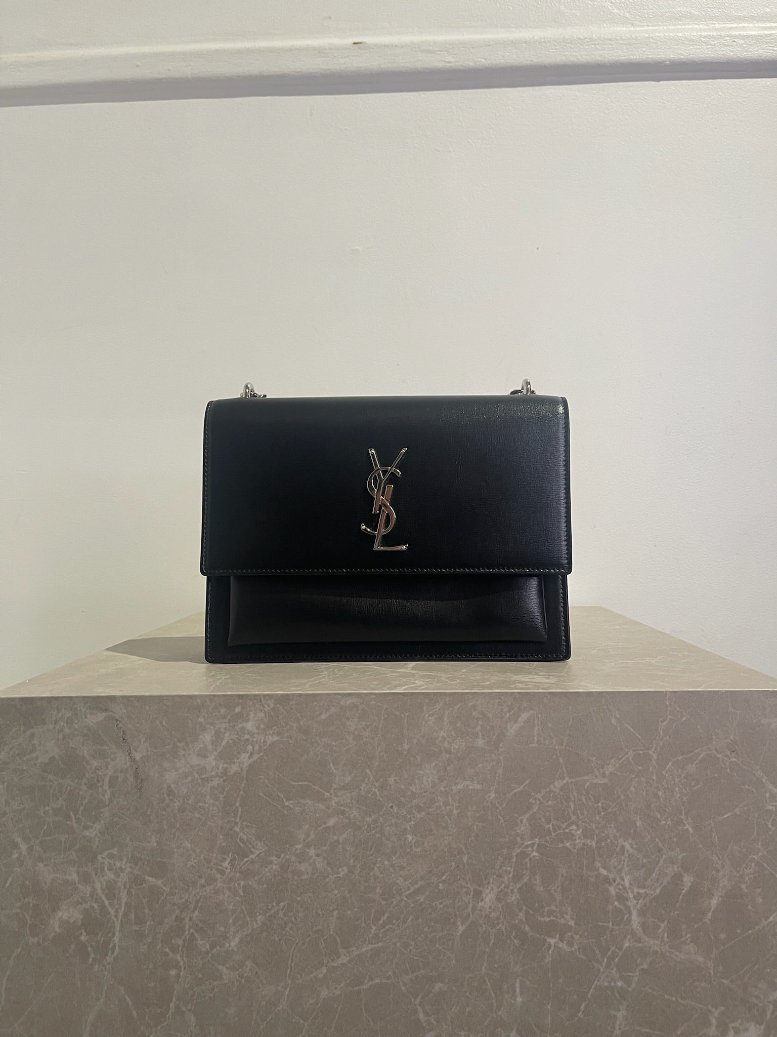 Sac en cuir de lisse noir avec fermeture à rabat ornée du logo YSL en métal argenté. Bandoulière en chaine et cuir coulissante pour un porté épaule ou crossbody. Poche intérieure à l'avant et poches plates.