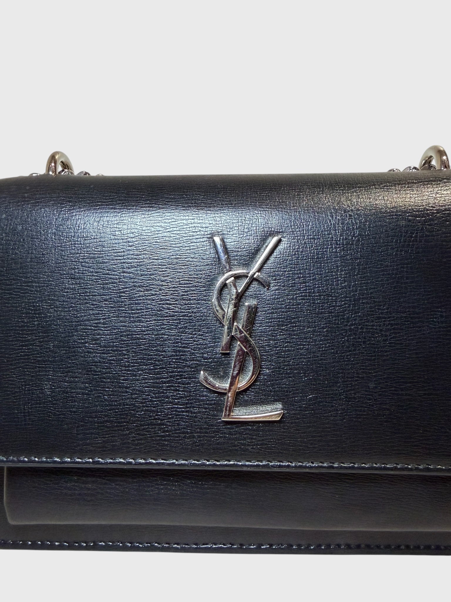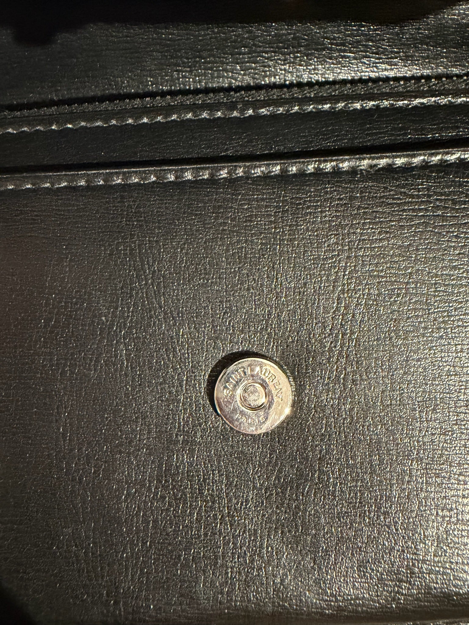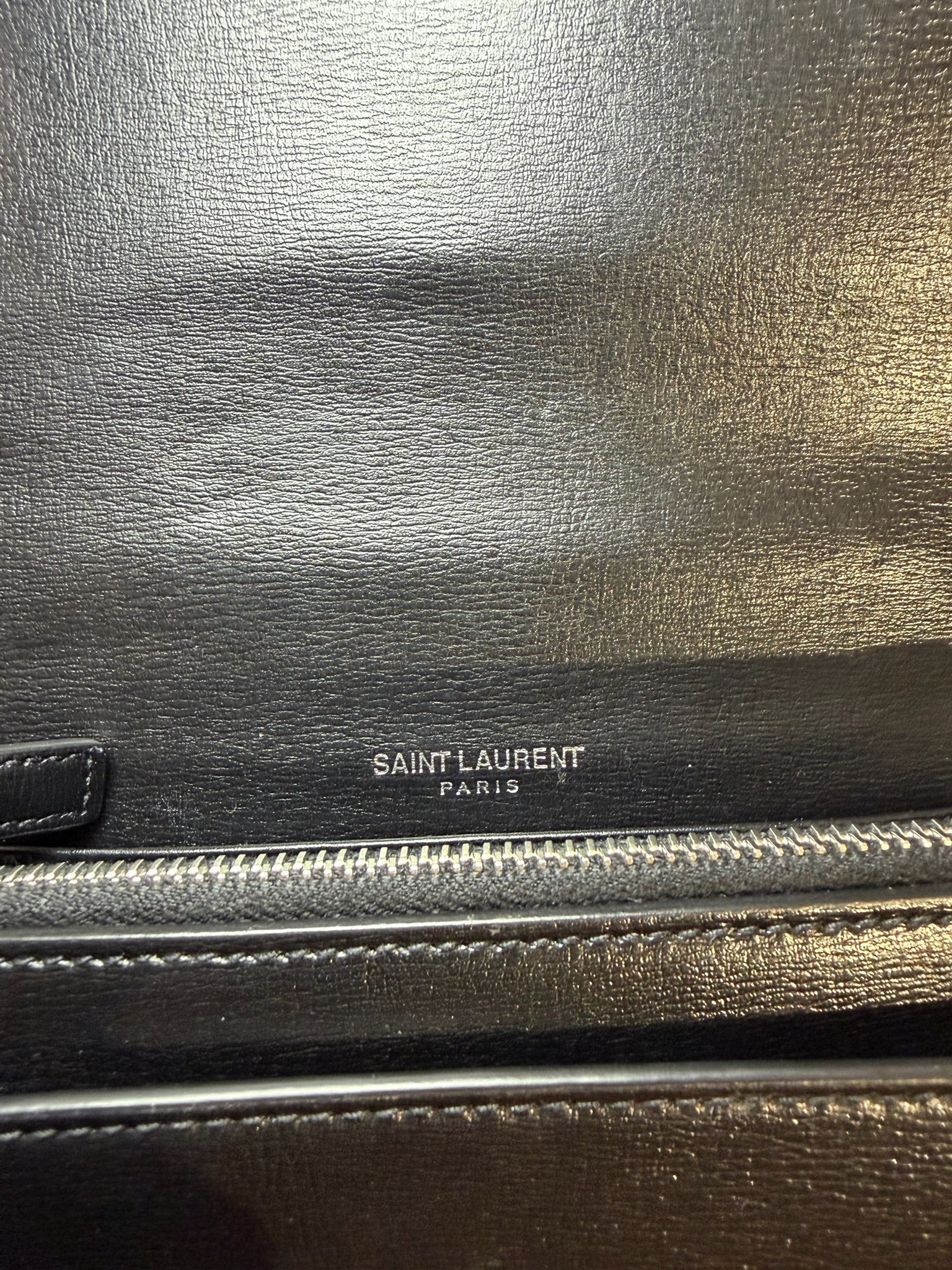 Sac en cuir lisse noir avec fermeture à rabat ornée du logo YSL en métal argenté. Bandoulière en chaine coulissante et rendort en cuir pour un porté épaule ou crossbody. Poche intérieure à l'avant, compartiments pour cartes et poche zippée.