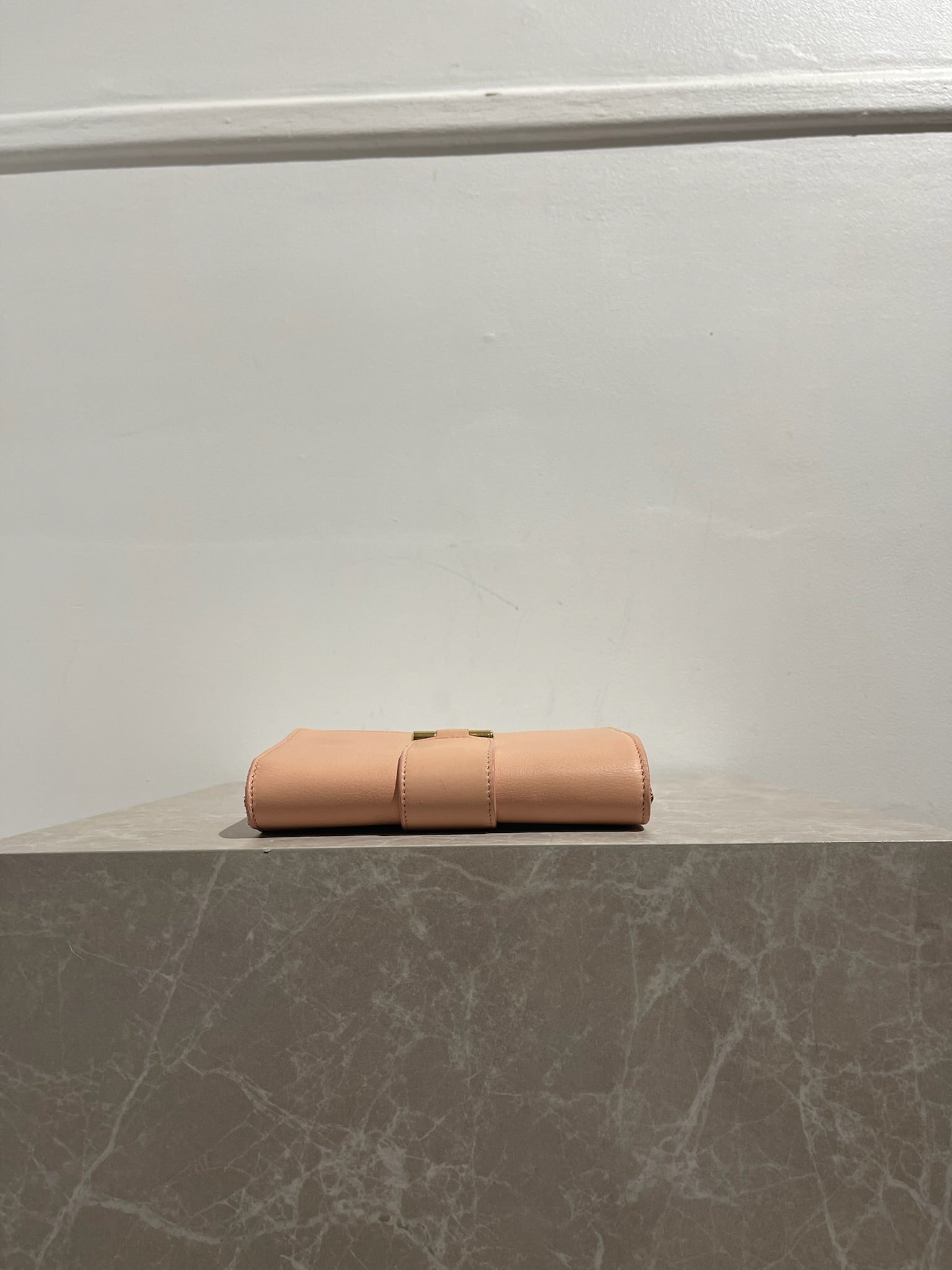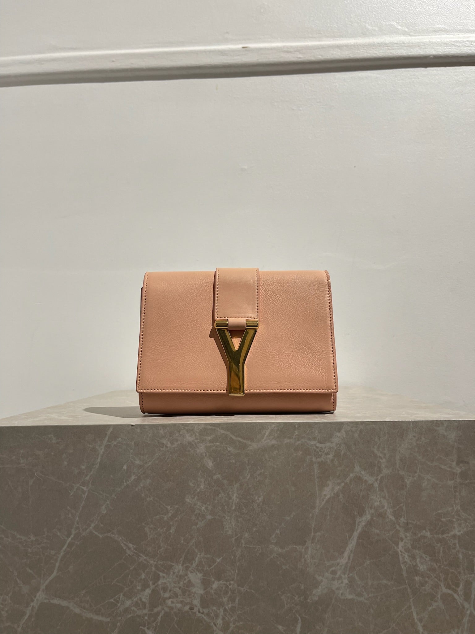 Sac en cuir rose poudré avec fermeture à rabat ornée du logo Y en métal doré et bandoulière chaine amovible. Possibilité de le porter à l'épaule ou en crossbody. Deux compartiments internes et petite poche plate.