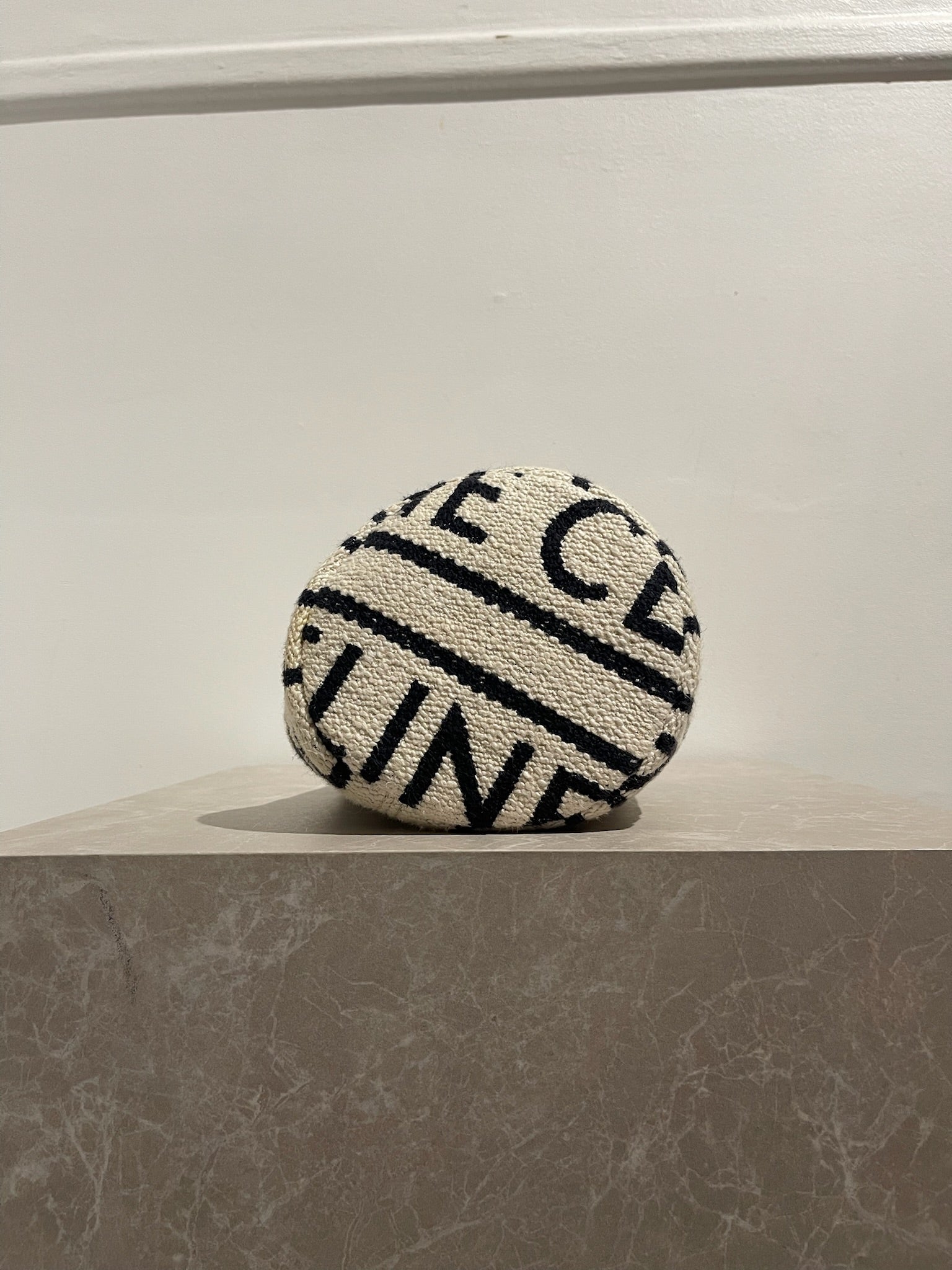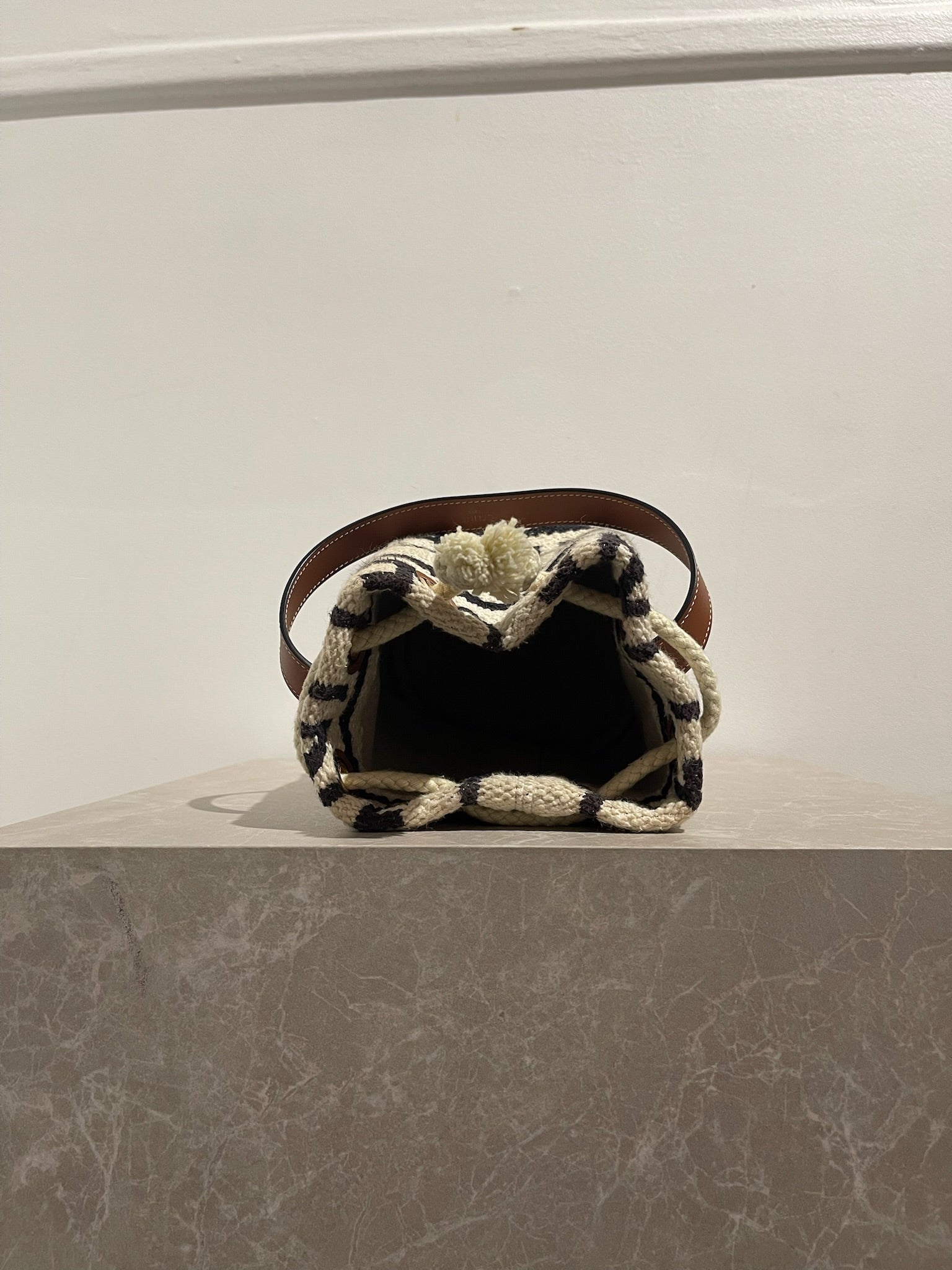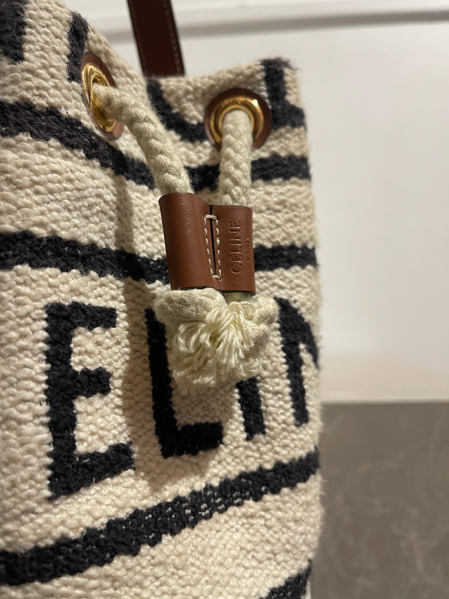 Sac seau en toile blanc cassé avec inscription Celine noir sur l'entièreté du sac. Anse en cuir camel sur le dessus pour un porté main. Fermeture avec lien de serrage en corde et cuir signée Celine. Finitions dorées.