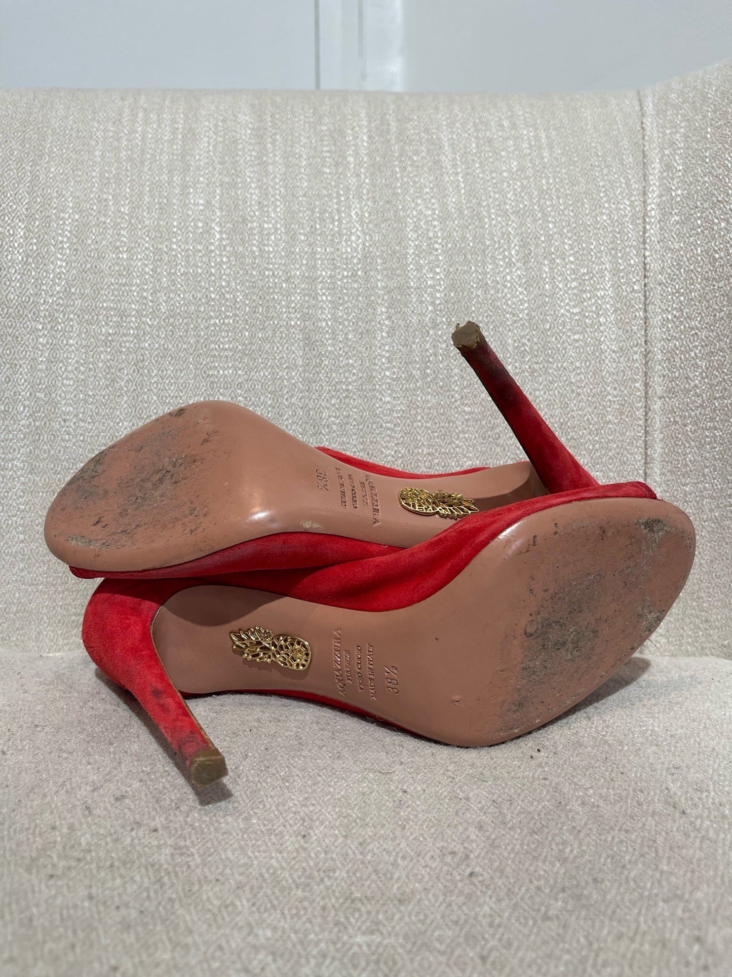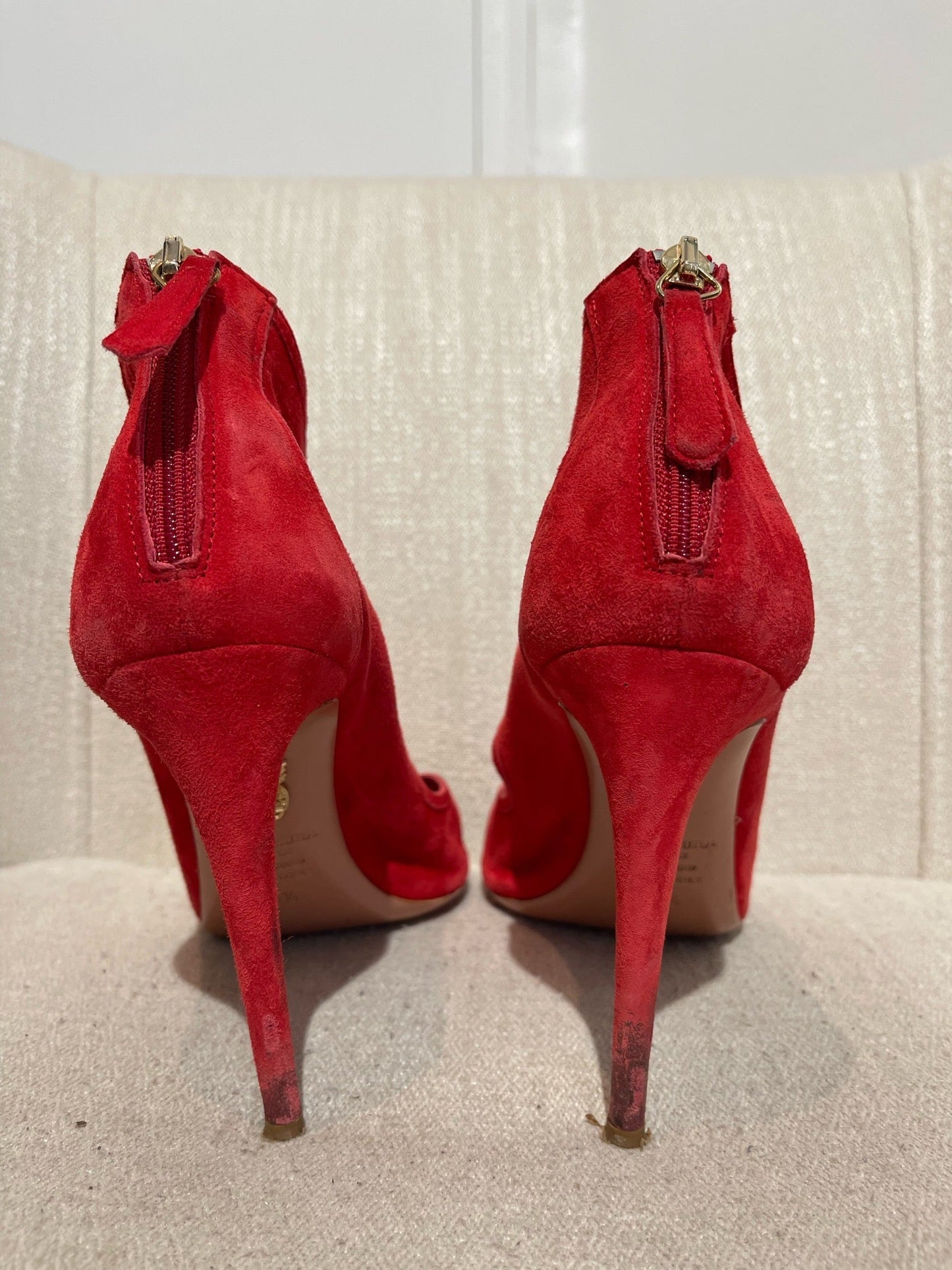 Sandales en daim rouges avec ouvertures, fermeture zip à l'arrière.