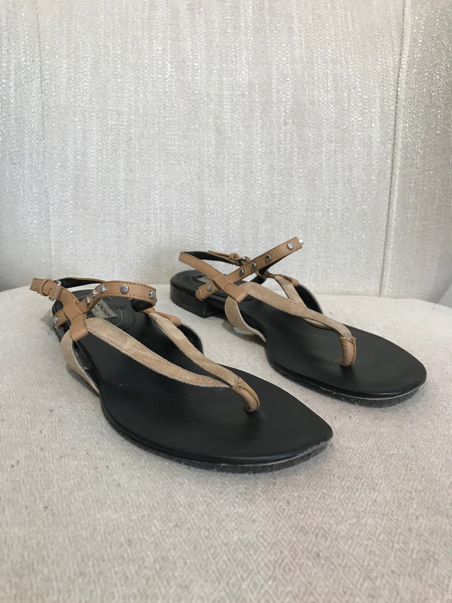 Sandales en cuir et daim beige avec petits clous en métal argenté. Boucle ajustable aux cheville.