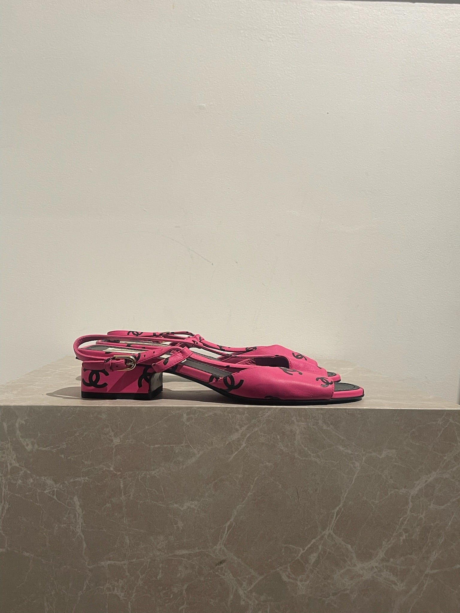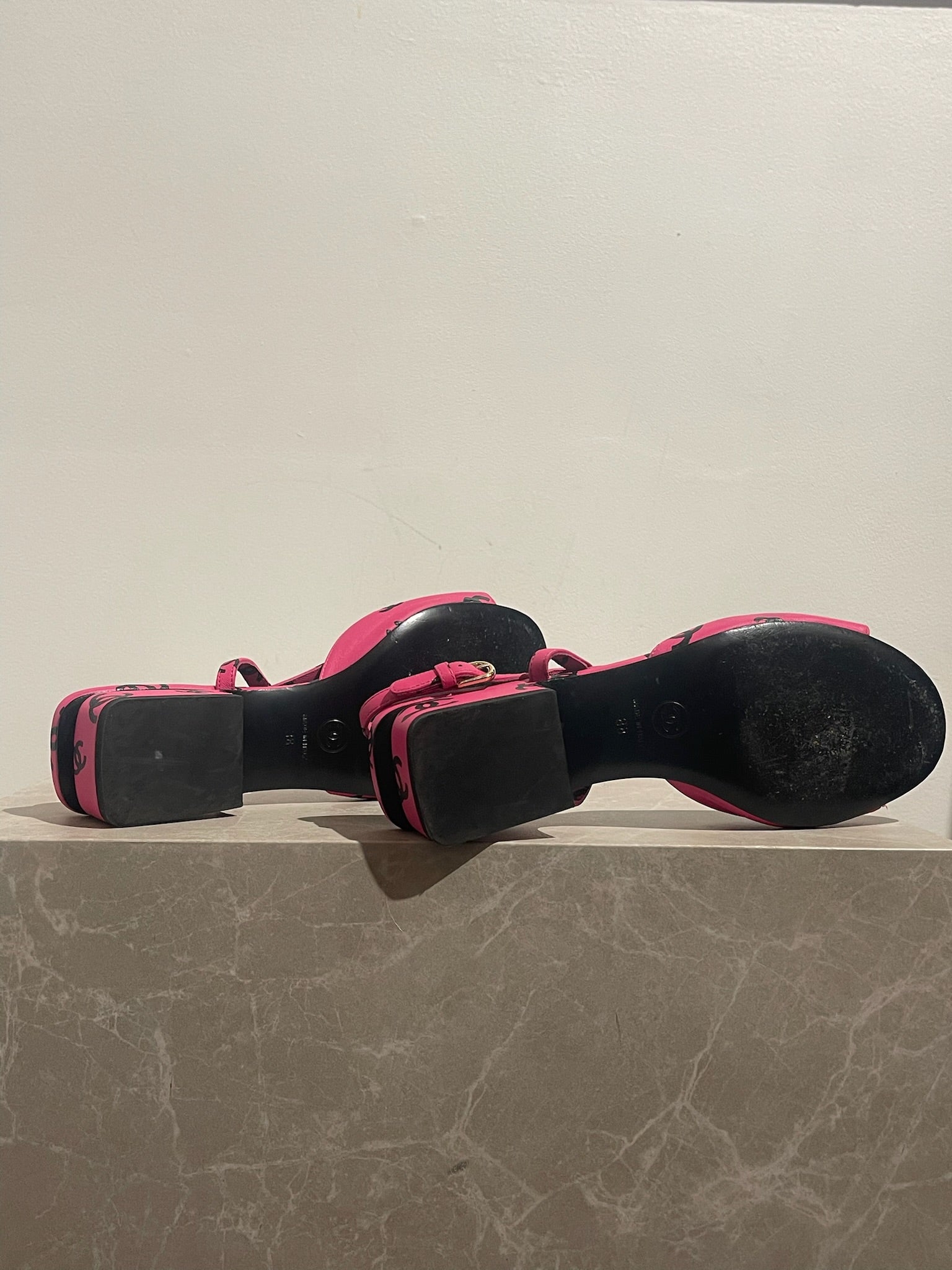 Sandales en cuir rose avec logo CC en noirs, bouts ouverts. Talons carrés. Fermeture avec boucle réglable à l'arrière.