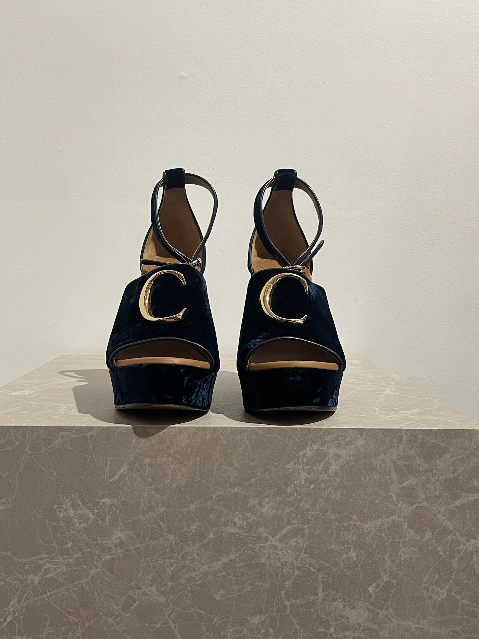 Sandales à talons en velours bleu nuit ornées d'un C à l'avant. Bouts ouverts et boucle ajustable à la cheville.