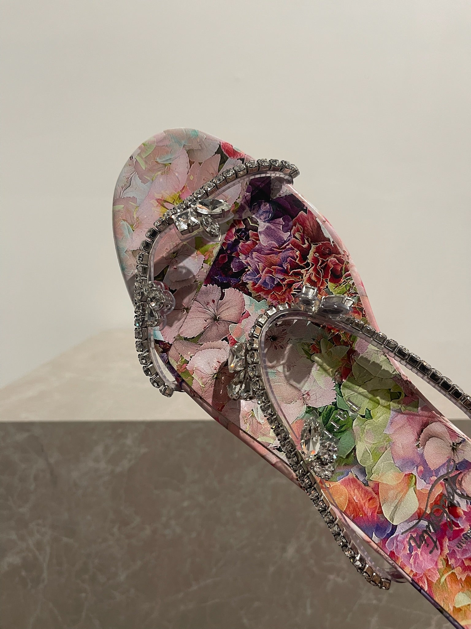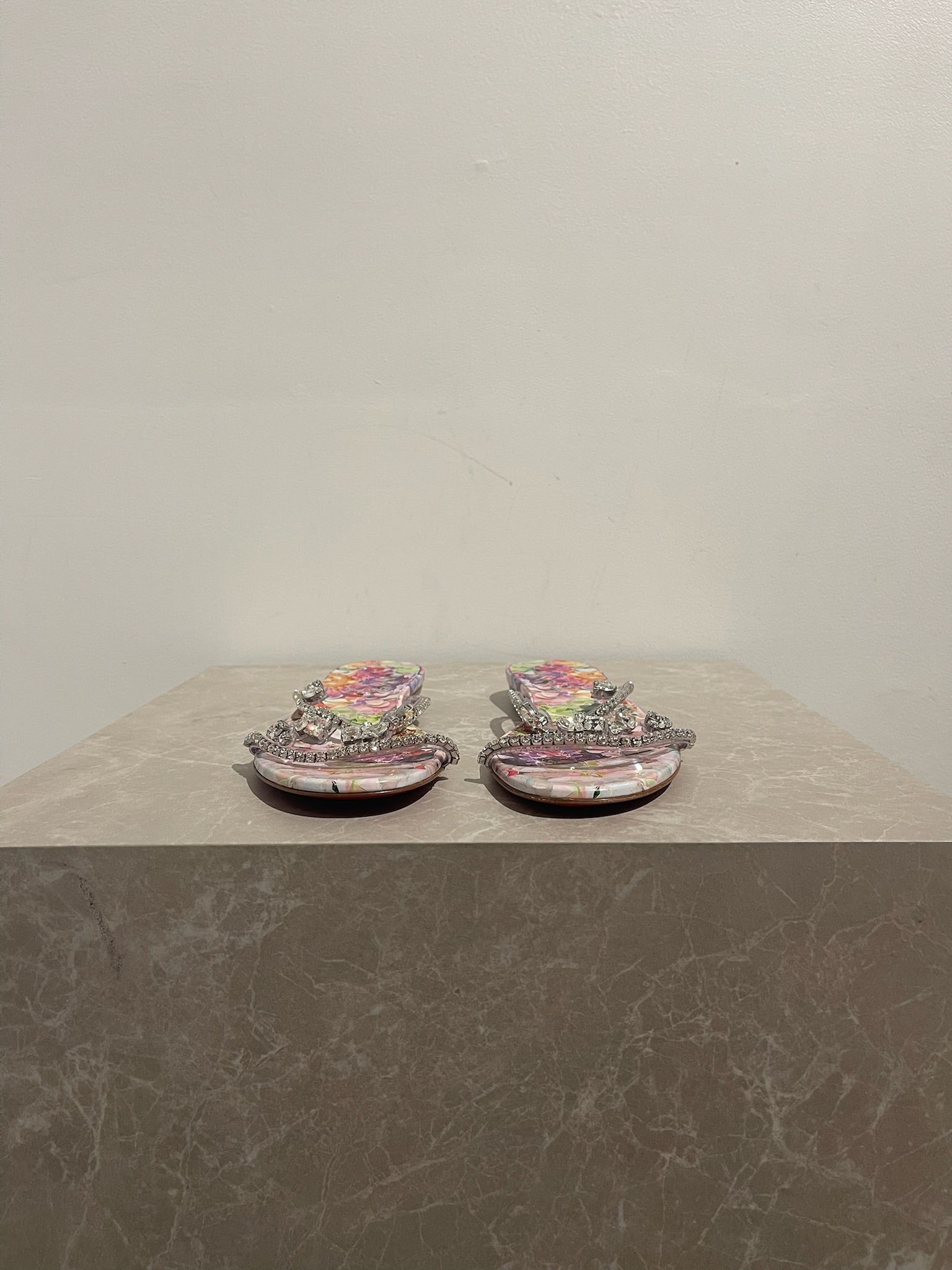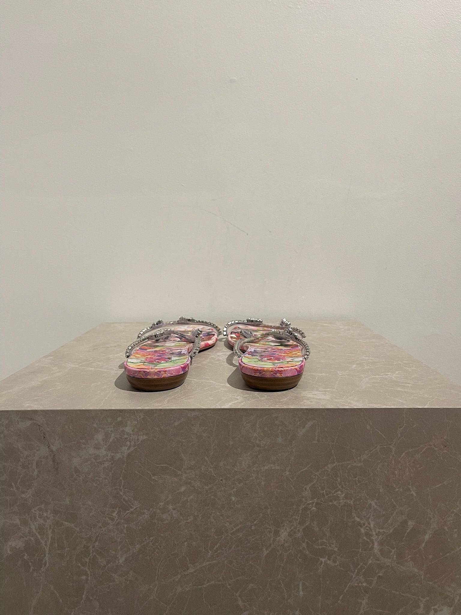Sandales plates avec semelles en cuir ornées d'un imprimé fleuri et brides en PVC transparent ornées de cristaux argents.