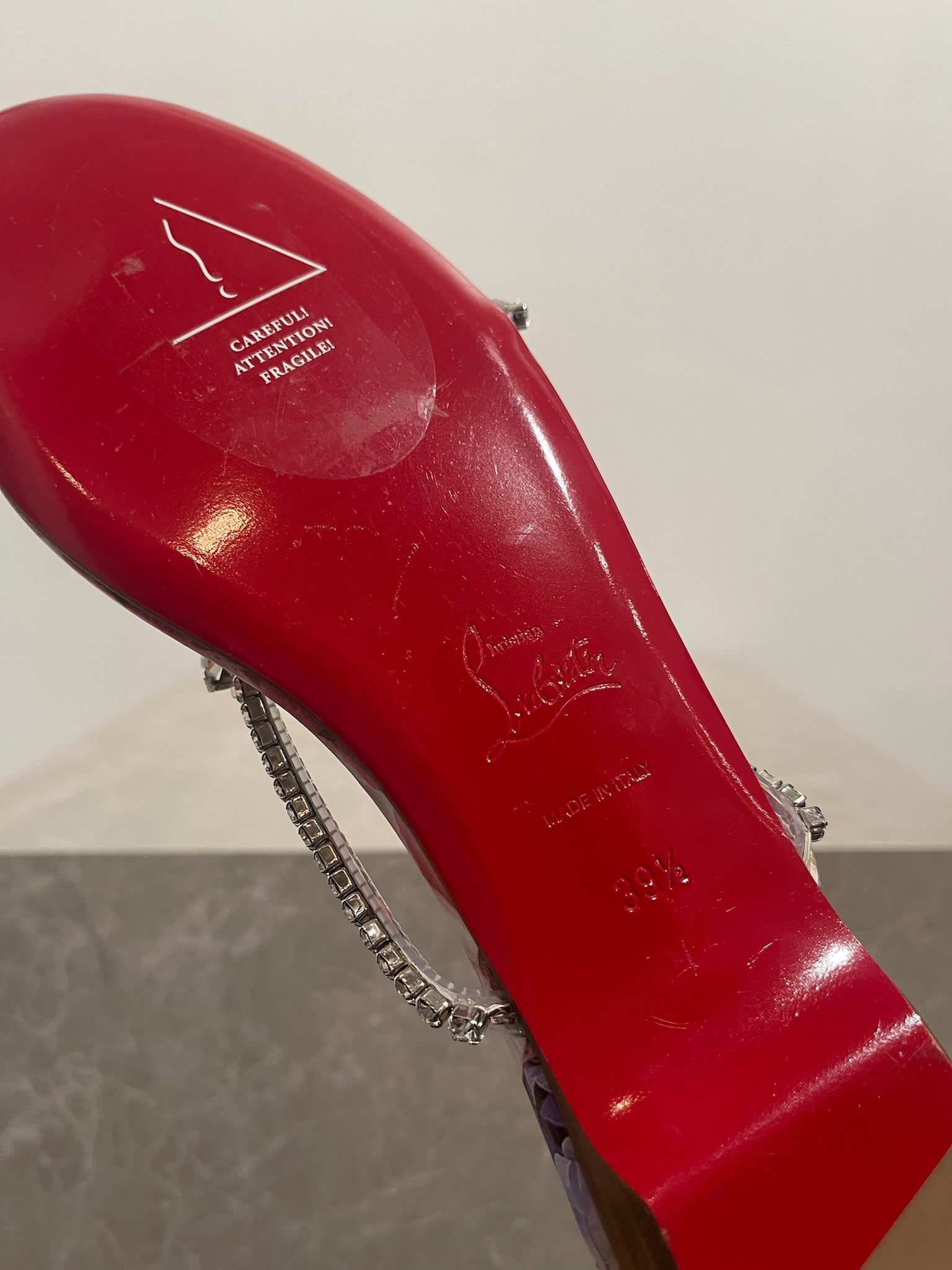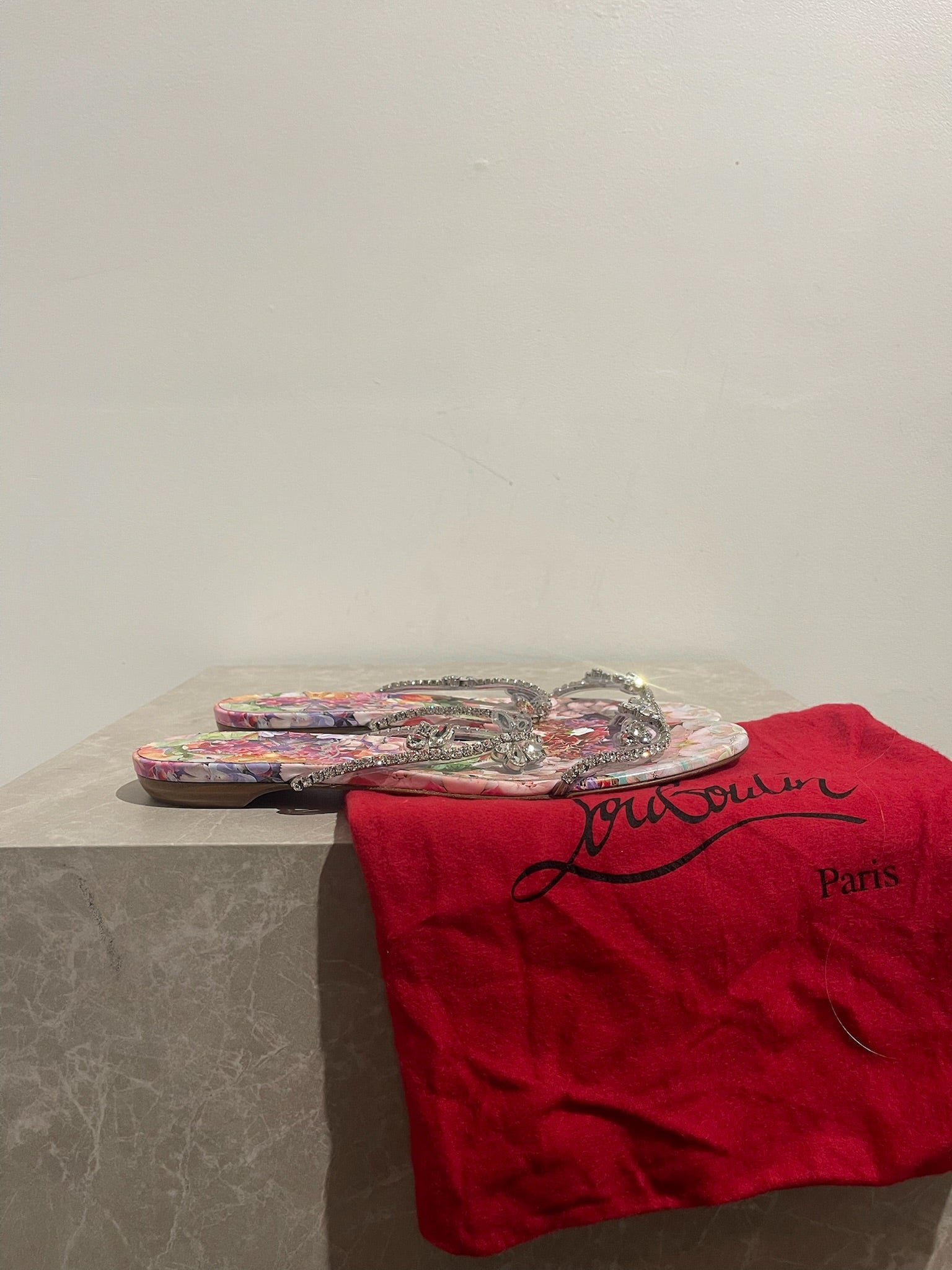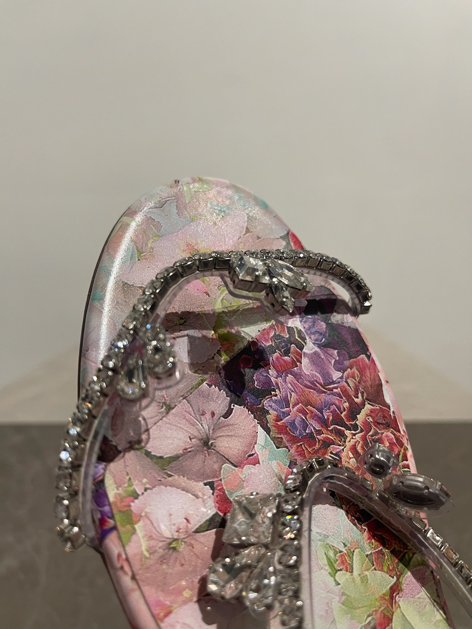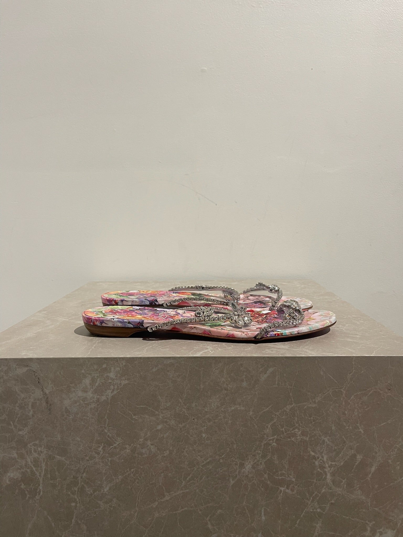 Sandales plates avec semelles en cuir ornées d'un imprimé fleuri et brides en PVC transparent ornées de cristaux argents.