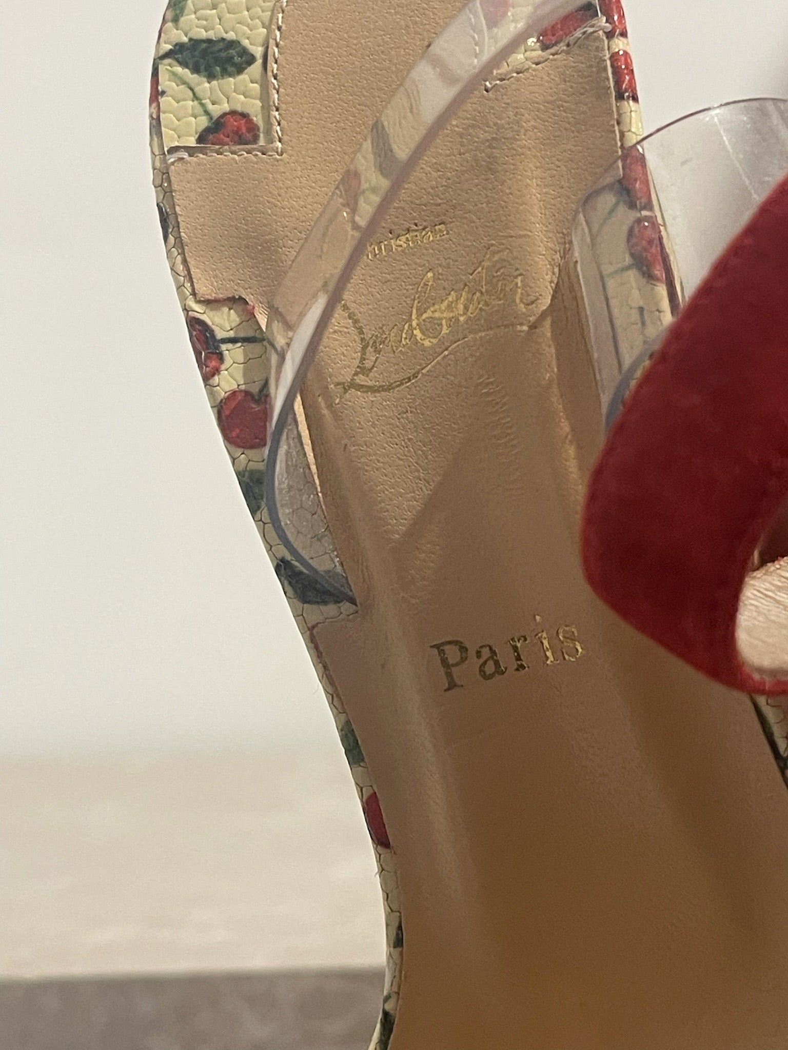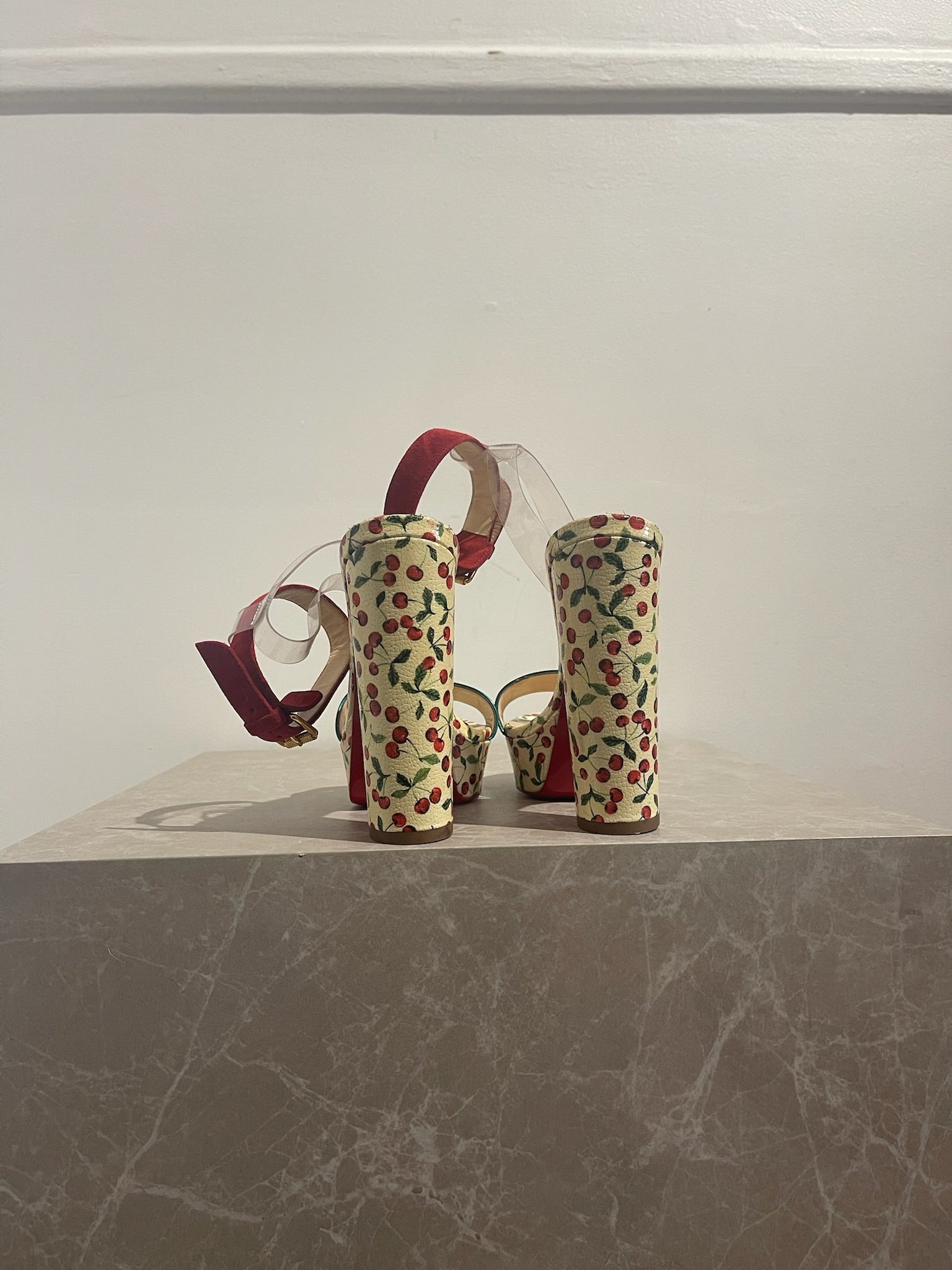 Sandales en cuir à motif cerise aux couleurs écru, vert métallisé, daim rouge et bride en PVC transparent. Boucle ajustable à la cheville.