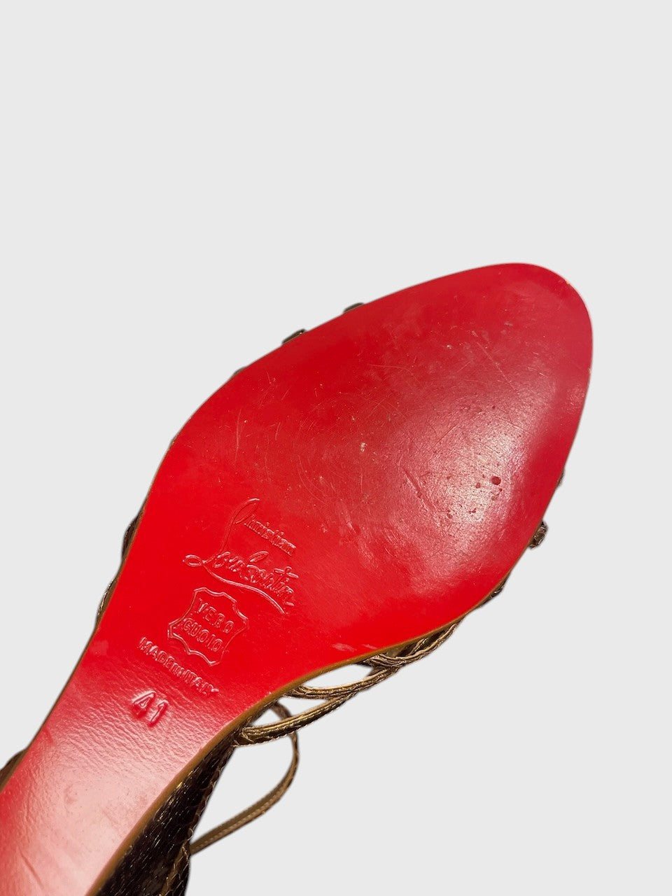 Sandales en cuir façon python mordoré avec bout ajouré, boucle ajustable à la cheville et talons géométriques compensés.