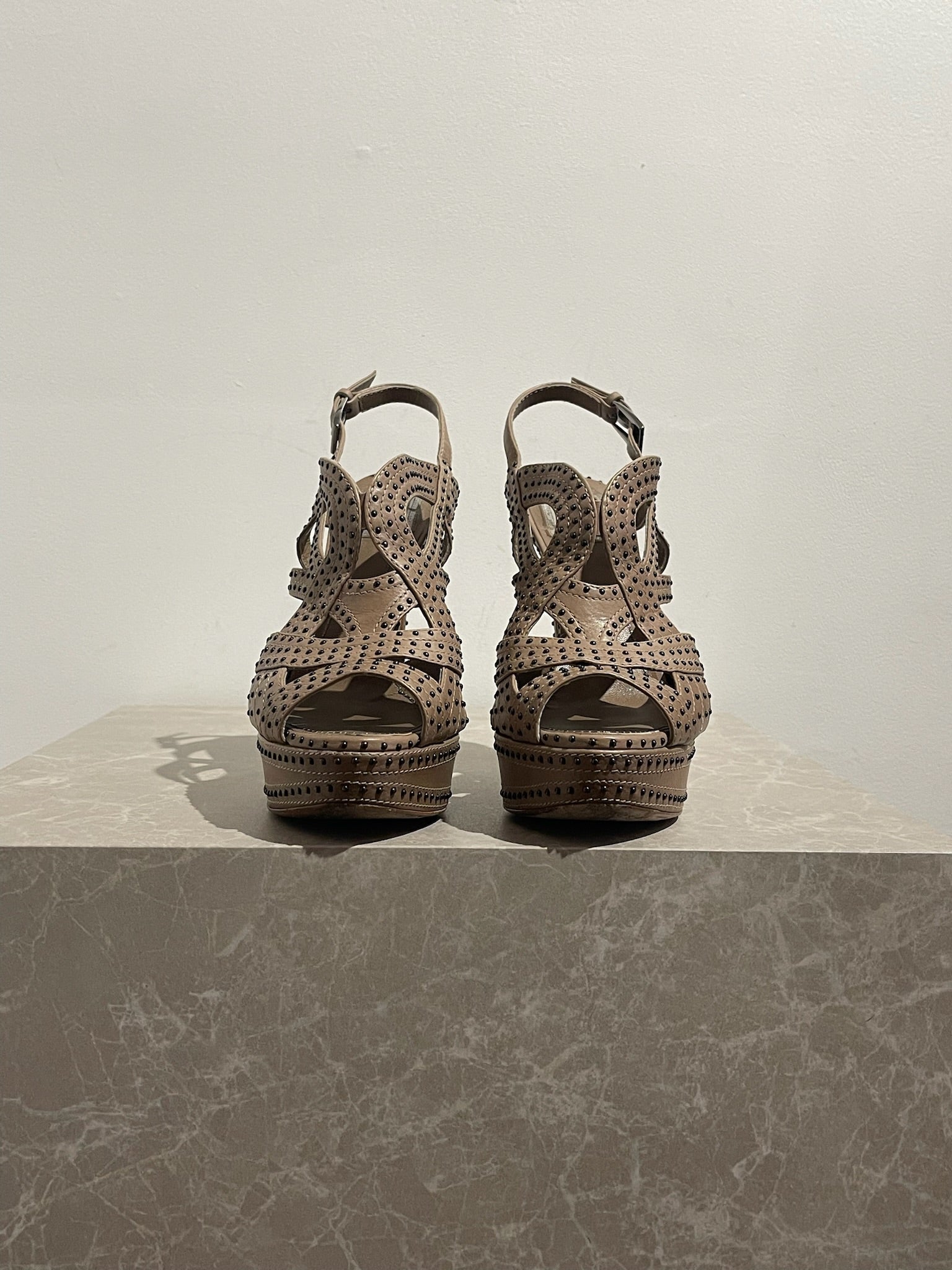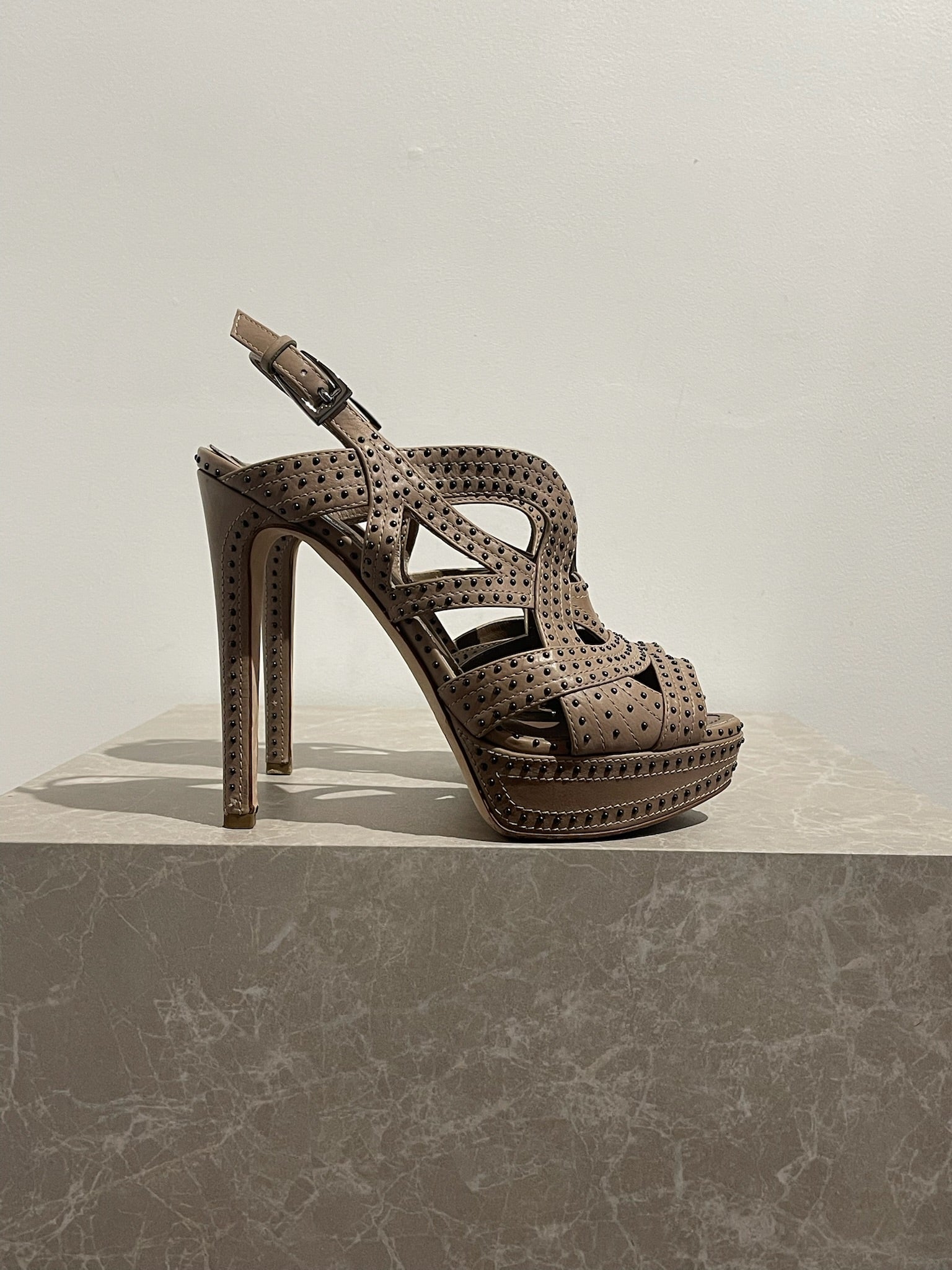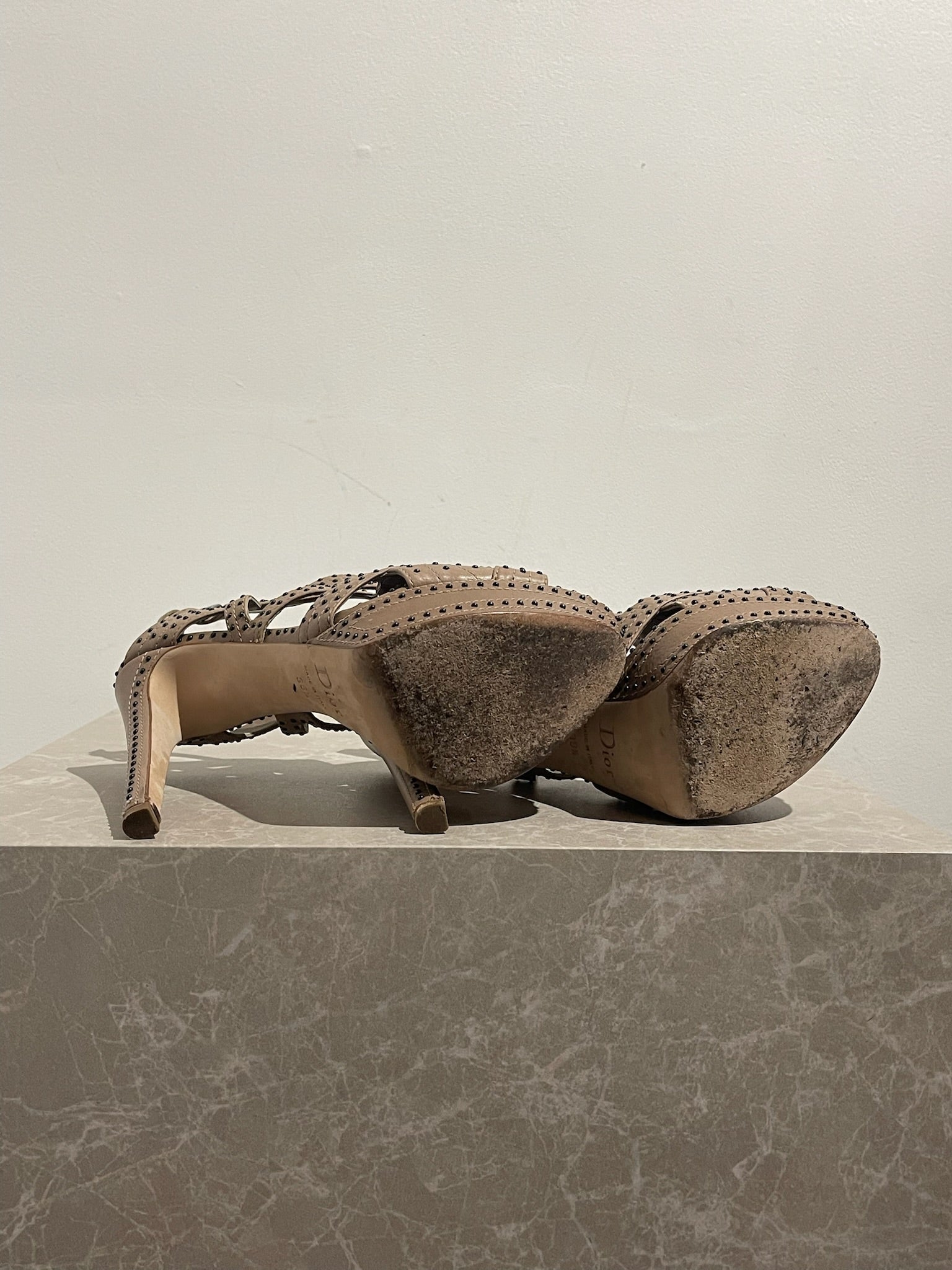 Sandales en cuir beige ornée de clous. Boucle ajustable à la cheville.