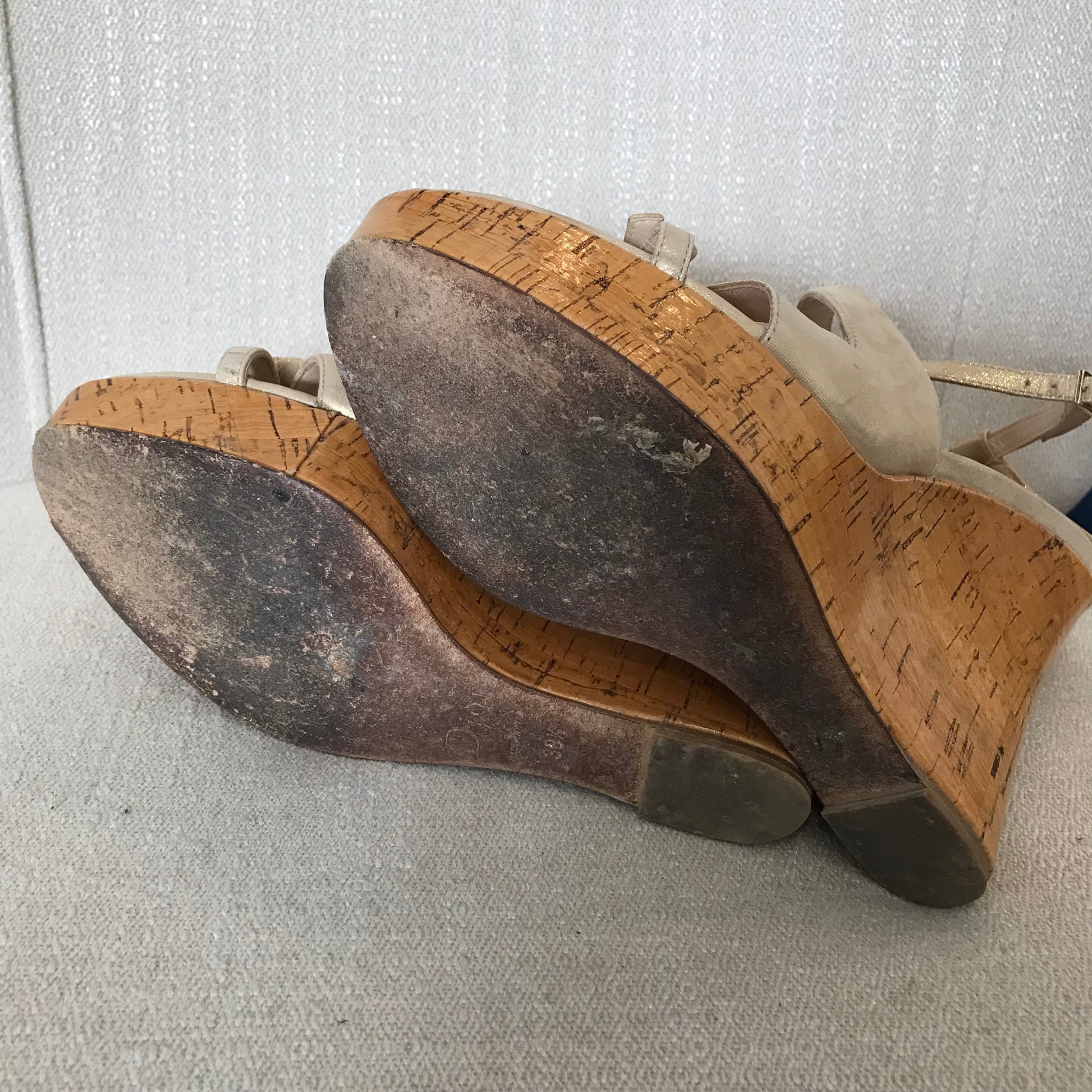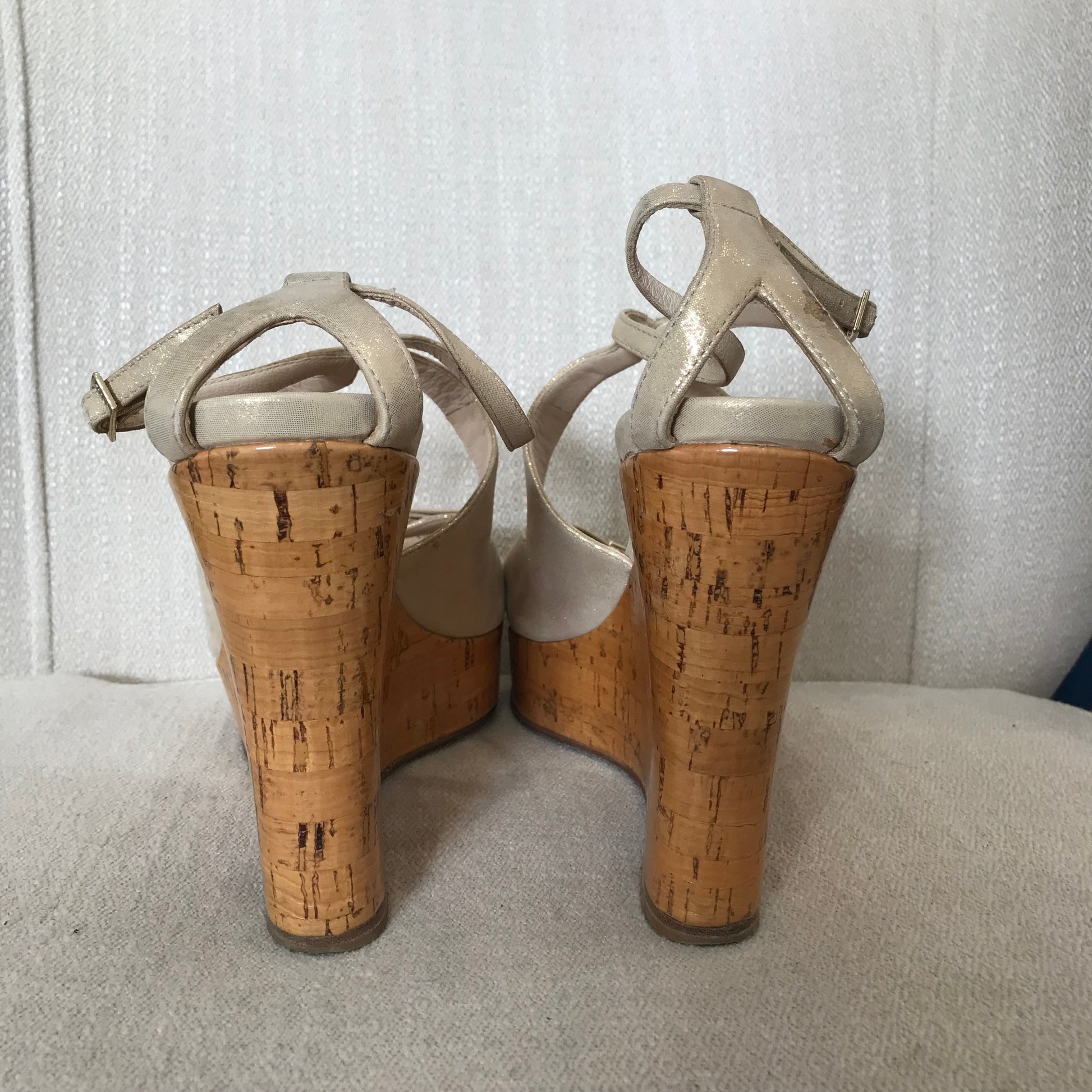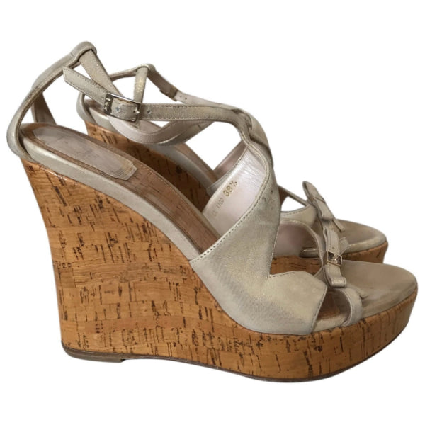 Sandales à talons compensées en cuir beige-doré avec fermeture à boucle à la cheville. Petite plaque en métal doré signé Dior.