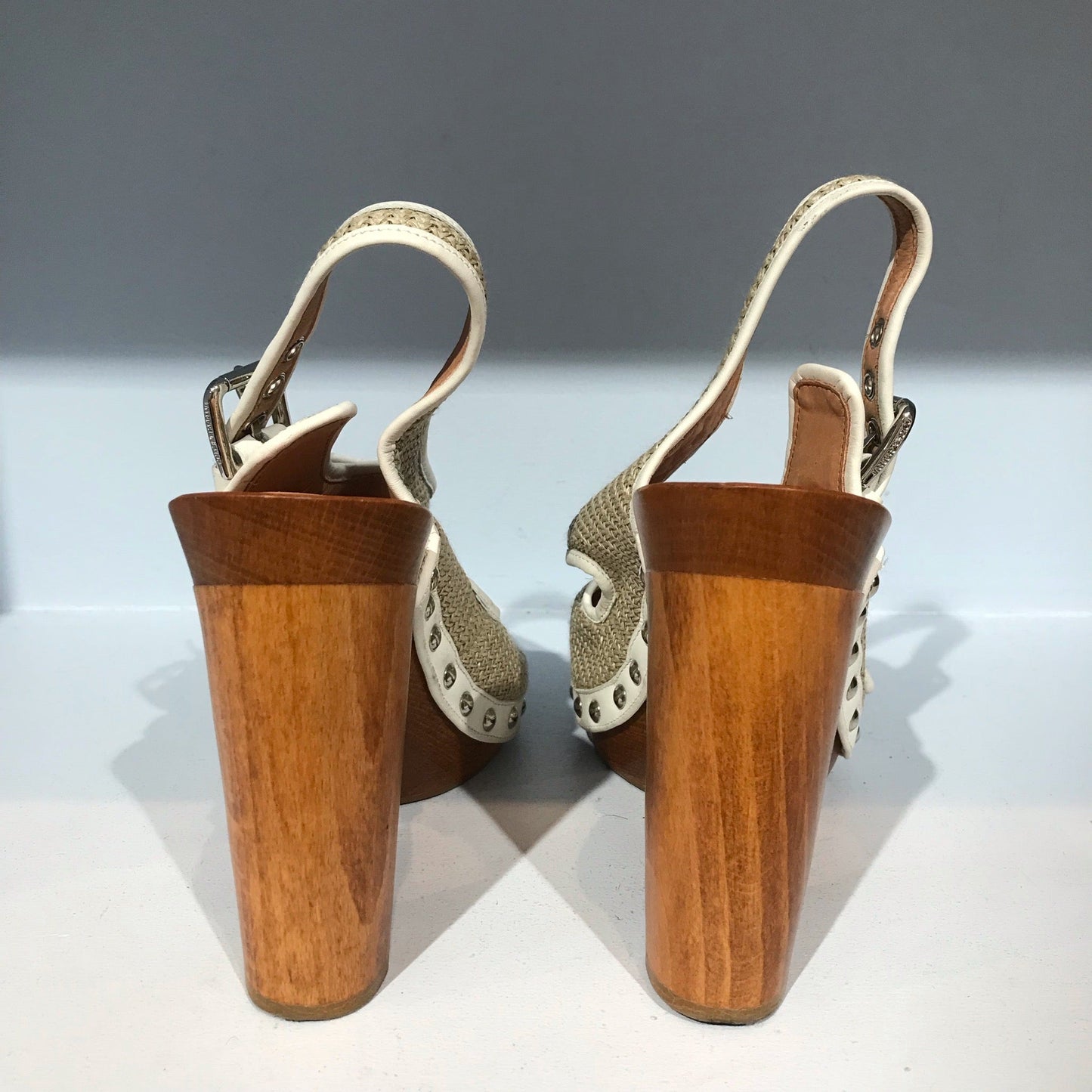 Sandales sabots en cuir blanc et raphia beige. Boucles décoratives et ajustables.