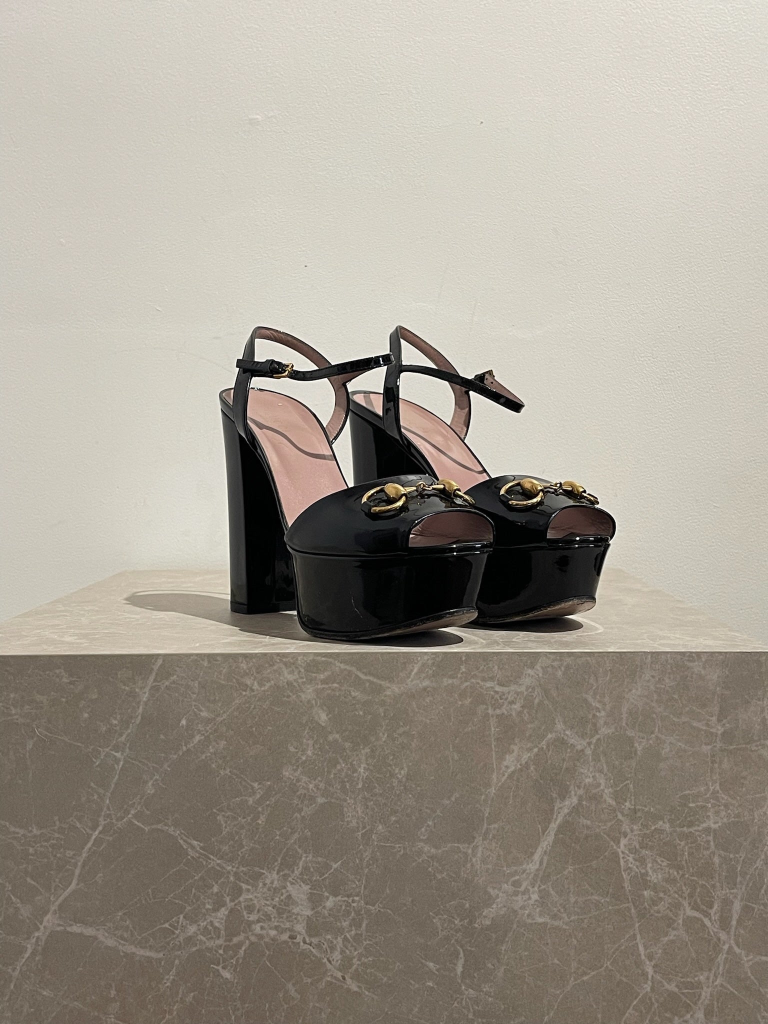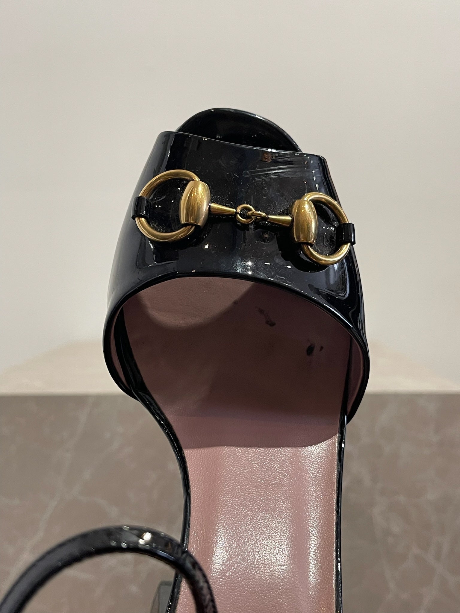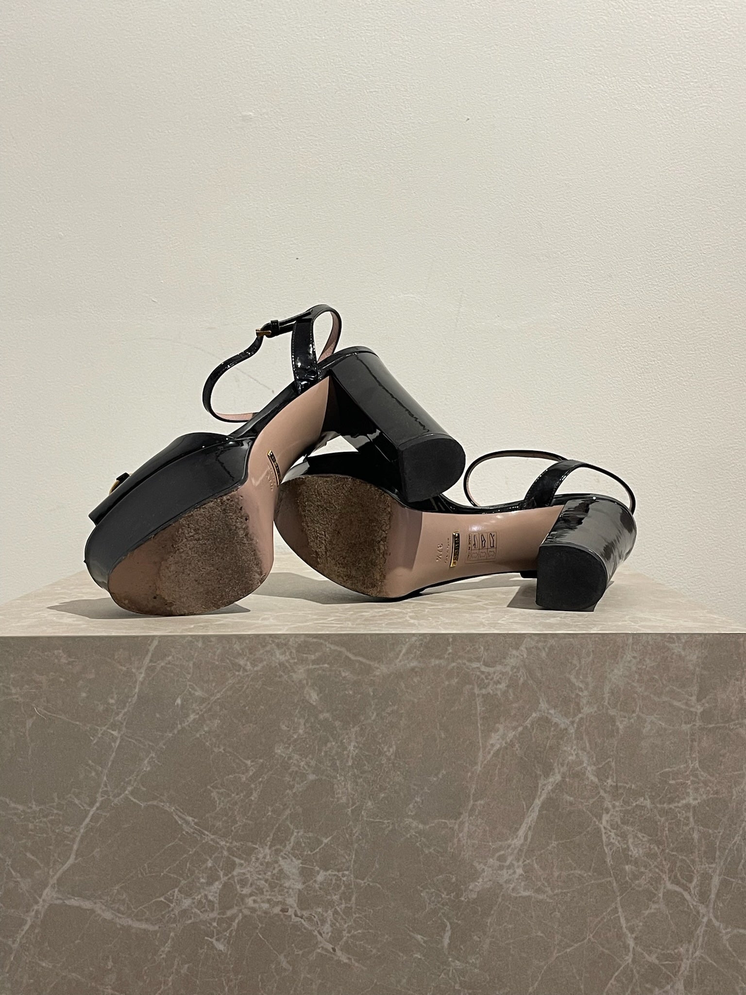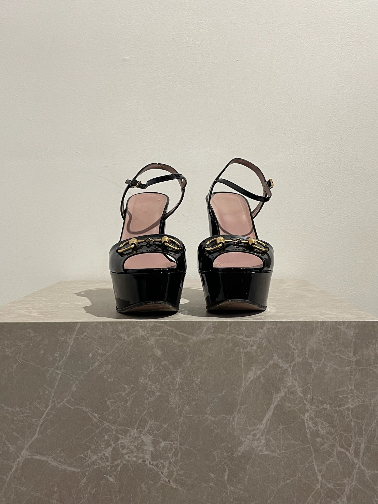 Sandales en cuir verni noir orné d'un mors en métal doré à l'avant, bouts ouverts et bride ajustable à la cheville. Talon bloc et plateforme.