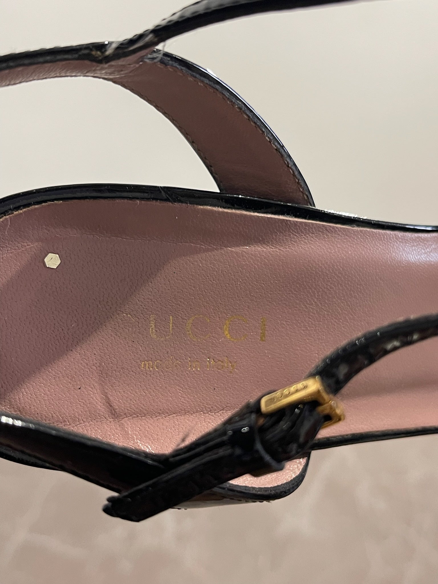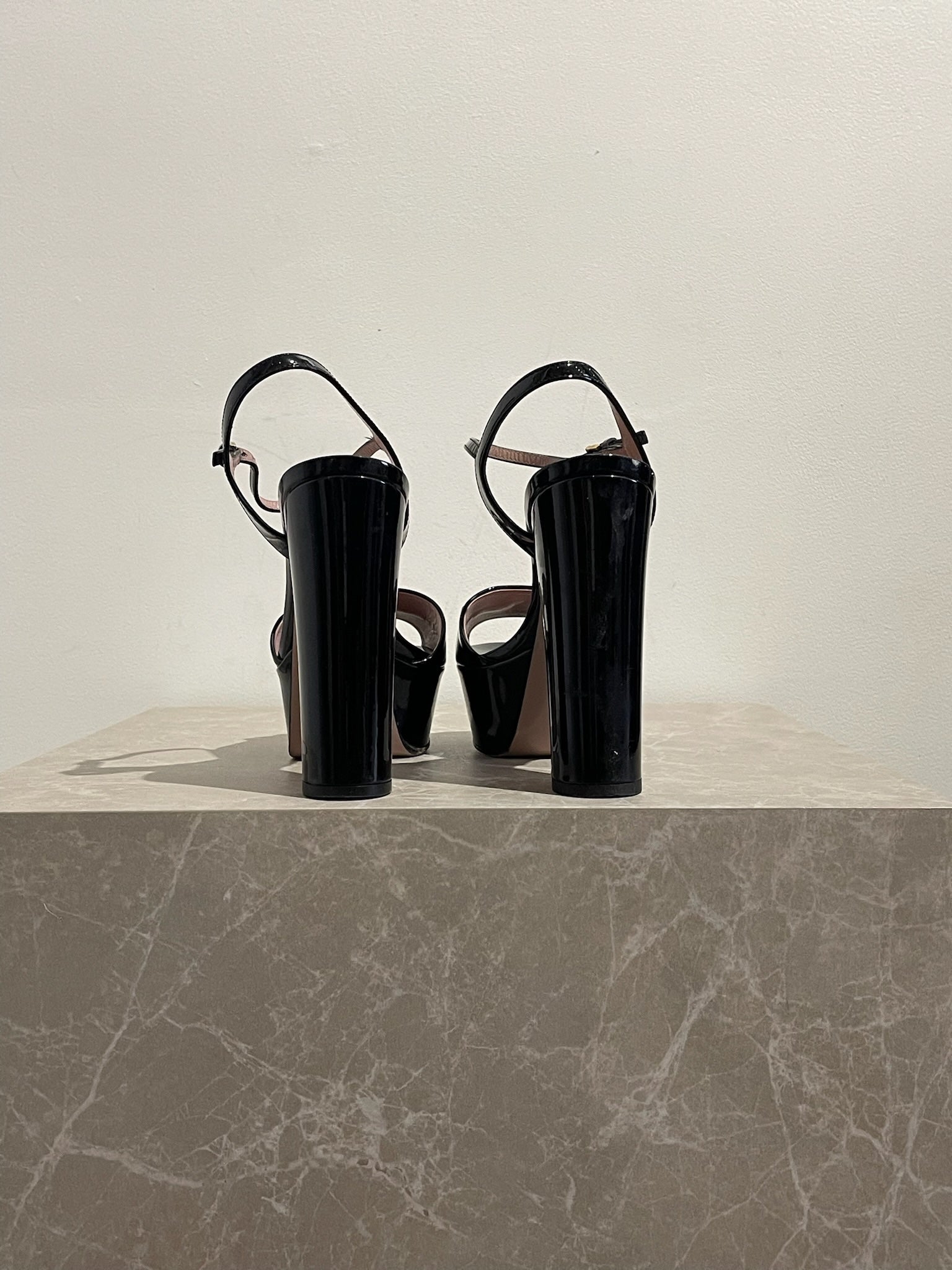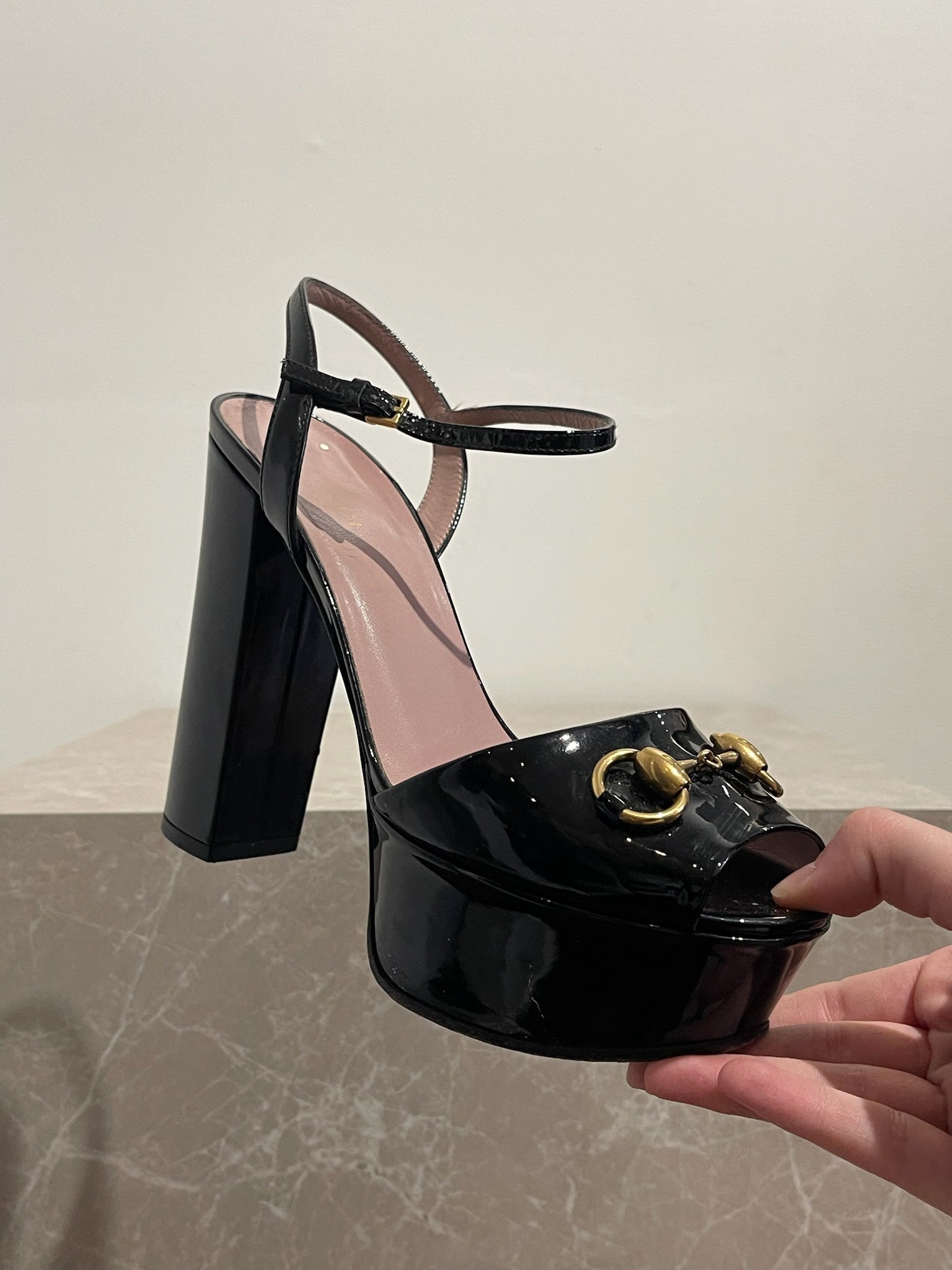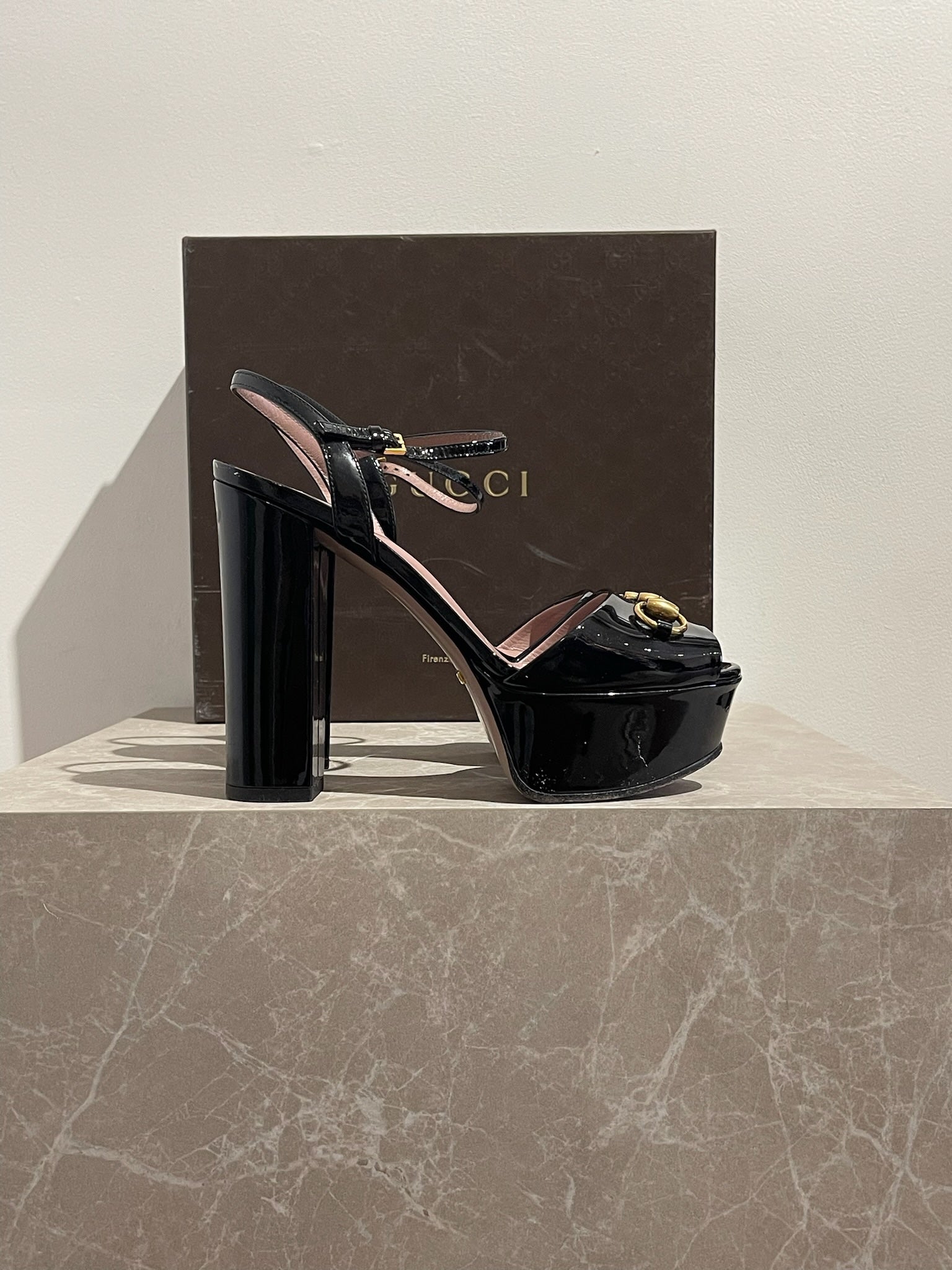 Sandales en cuir verni noir orné d'un mors en métal doré à l'avant, bouts ouverts et bride ajustable à la cheville. Talon bloc et plateforme.