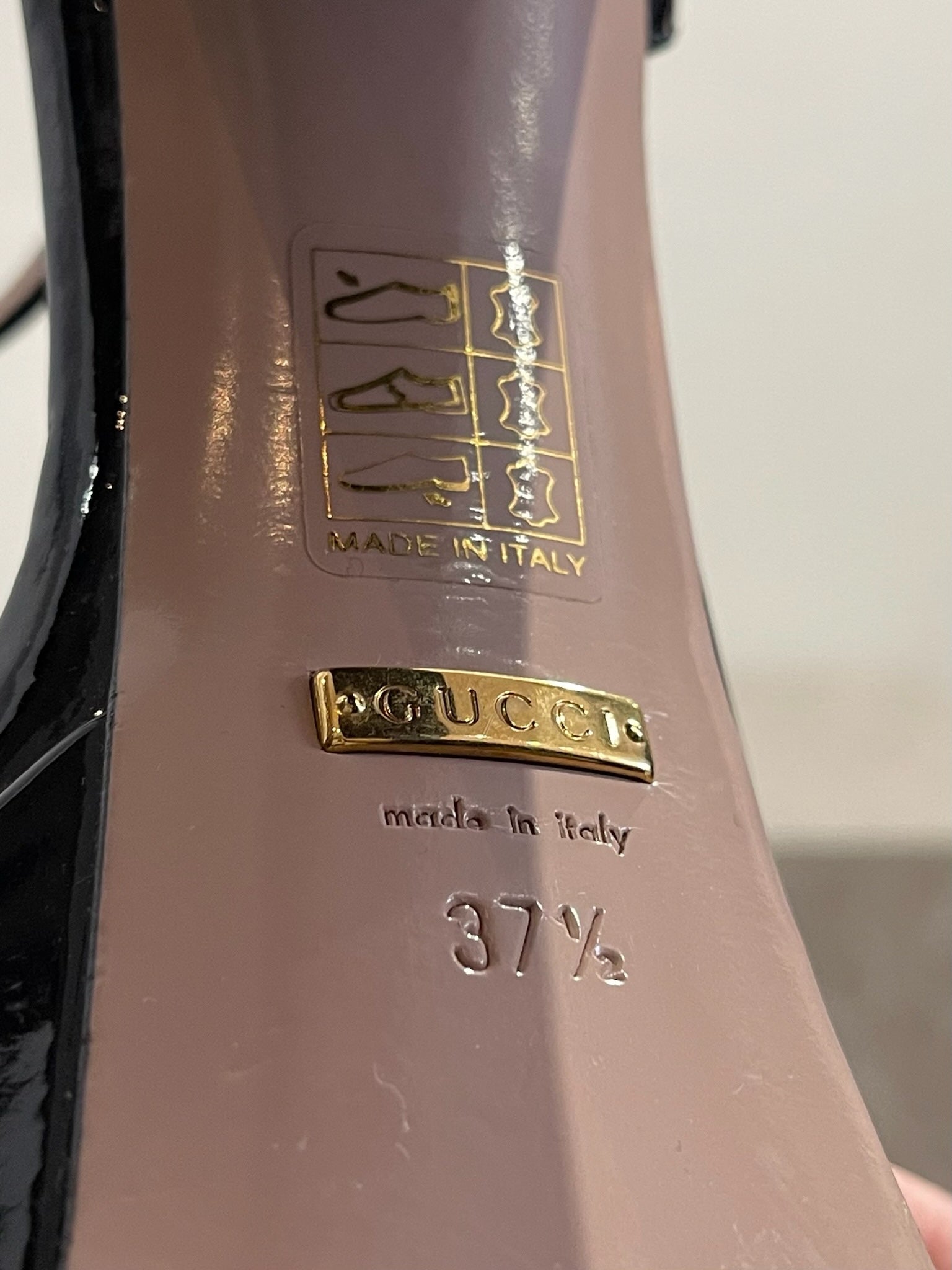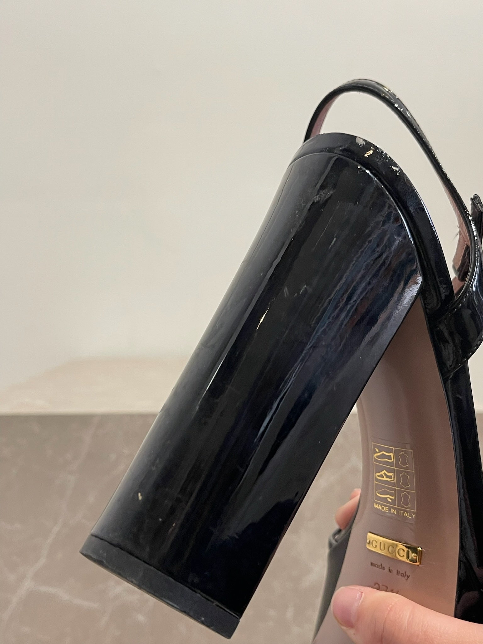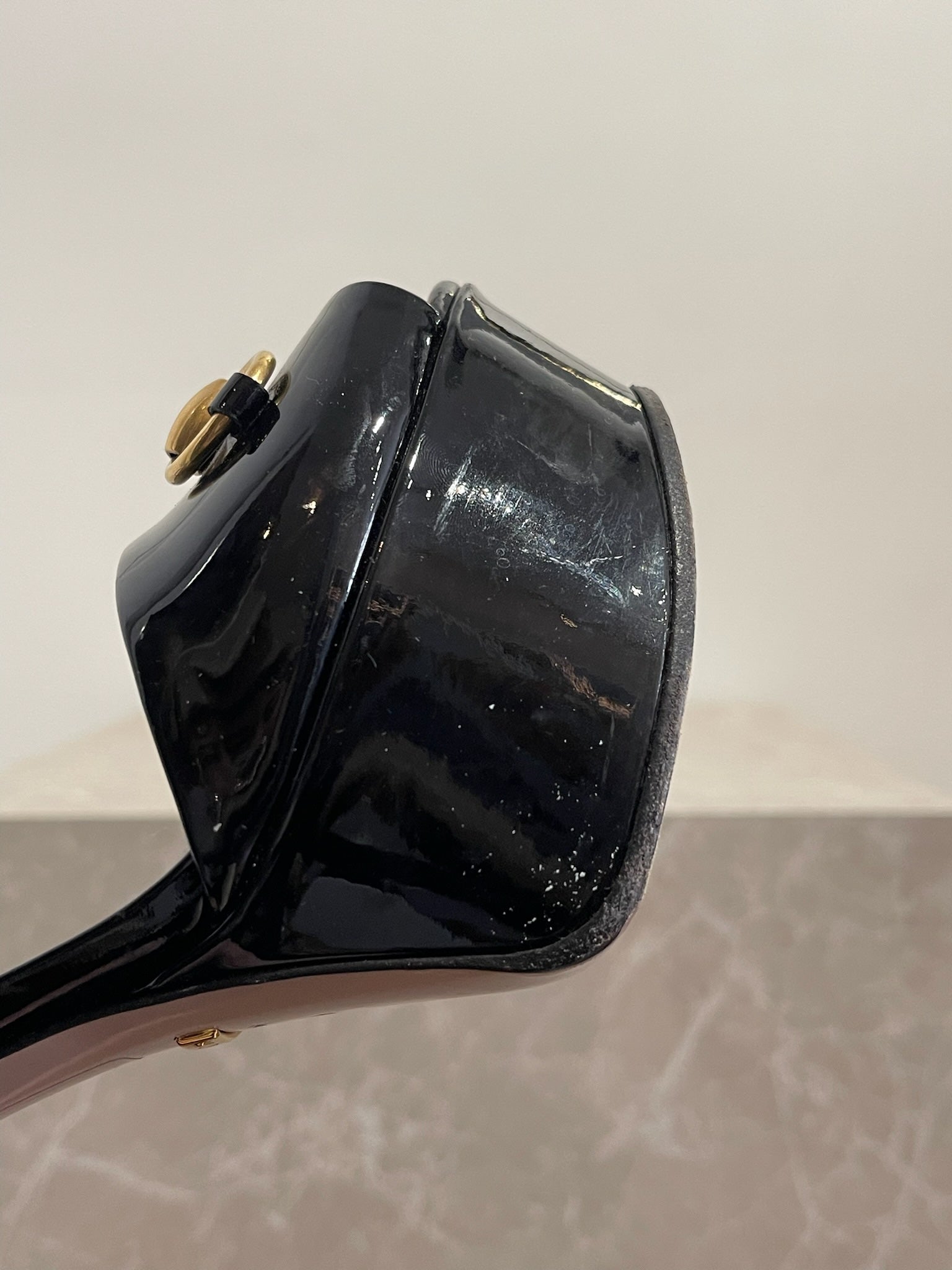 Bon état, à noter plusieurs traces sur le vernis au niveau des talons ainsi que des plateformes ( voir photos ). Vendu avec boite d'origine.