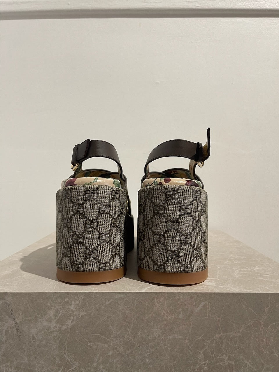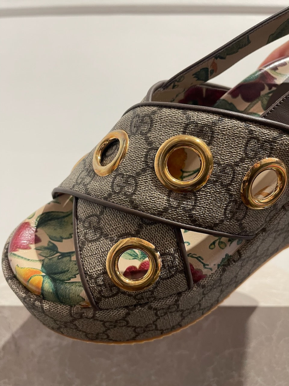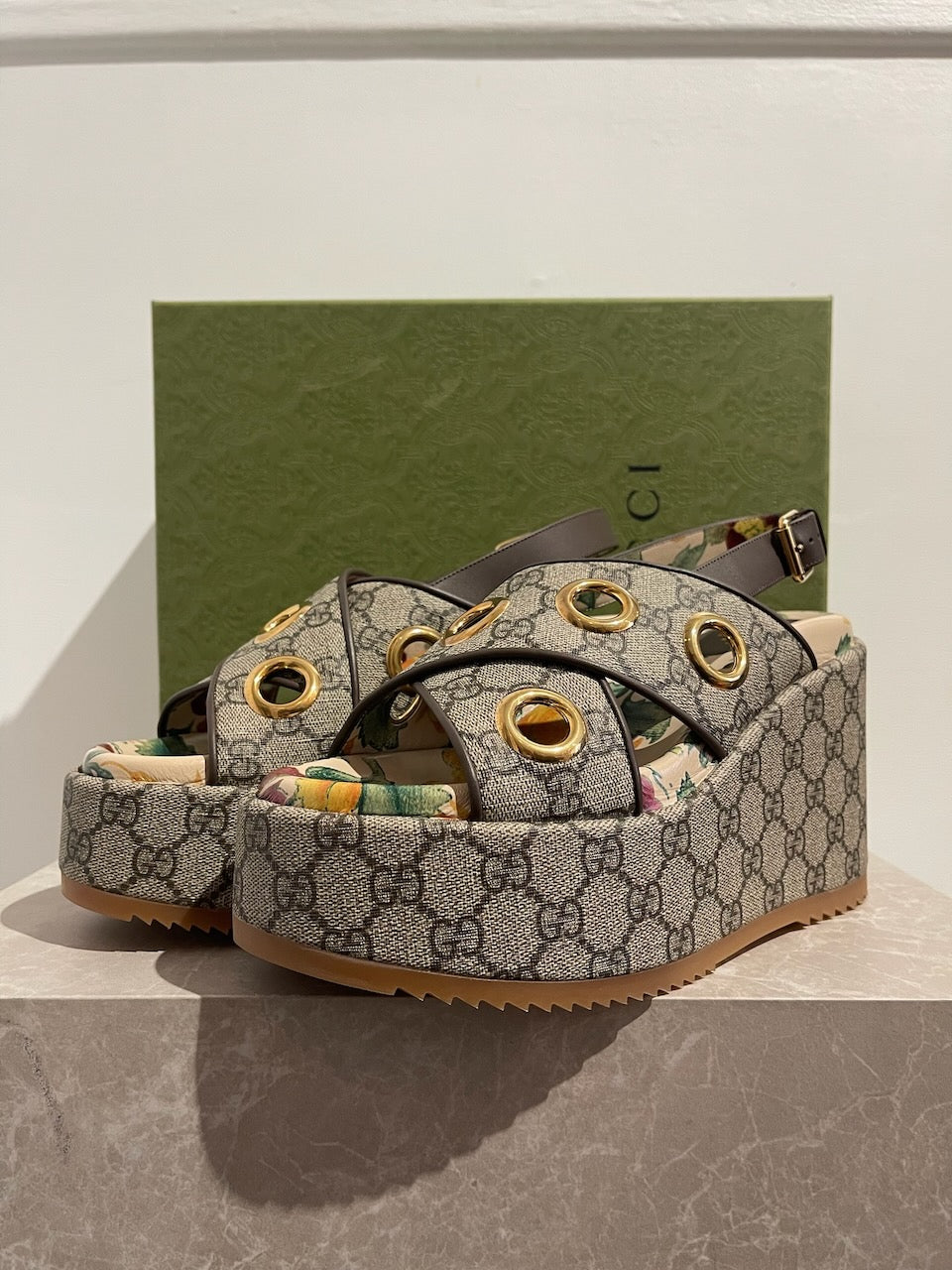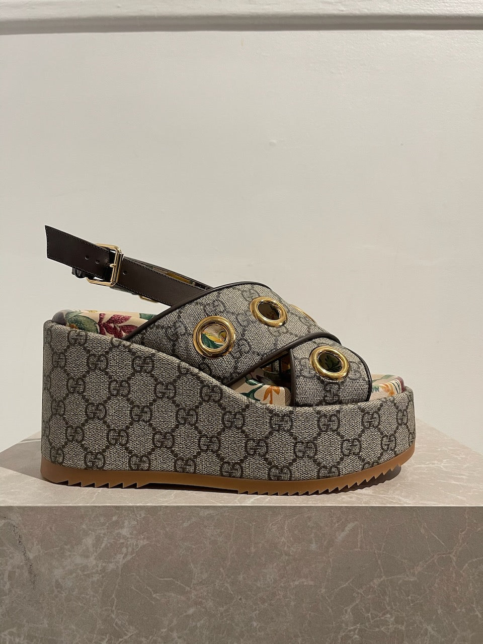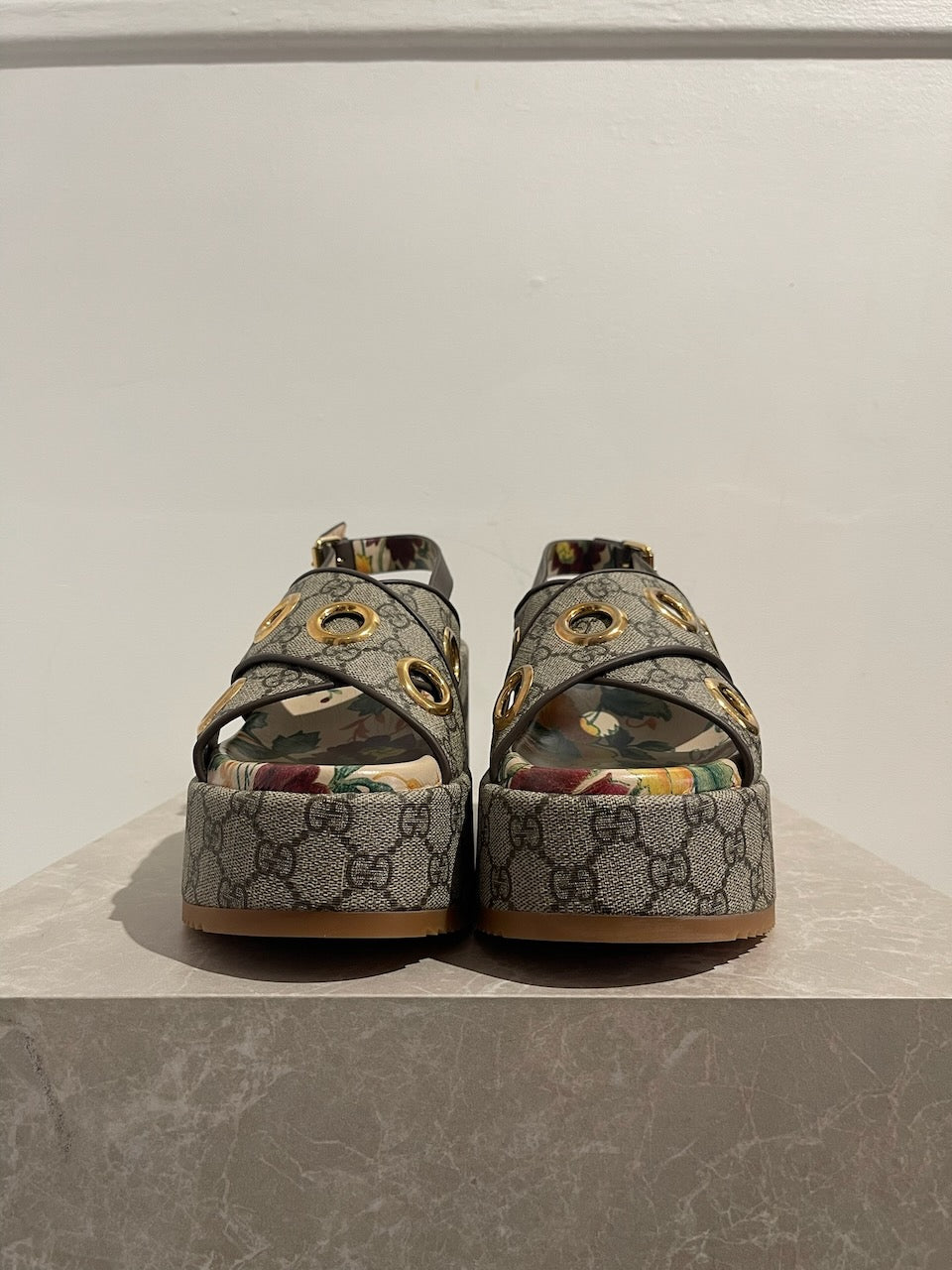 Sandales à plateforme Gucci. Confectionnées en toile supreme Gucci beige. Brides croisées sur le devant, décorées d'oeillets en métal doré. Bride ajustable à l'arrière. Semelle intérieur imprimé d'un motif fleuri et semelle exterieur en gomme.
