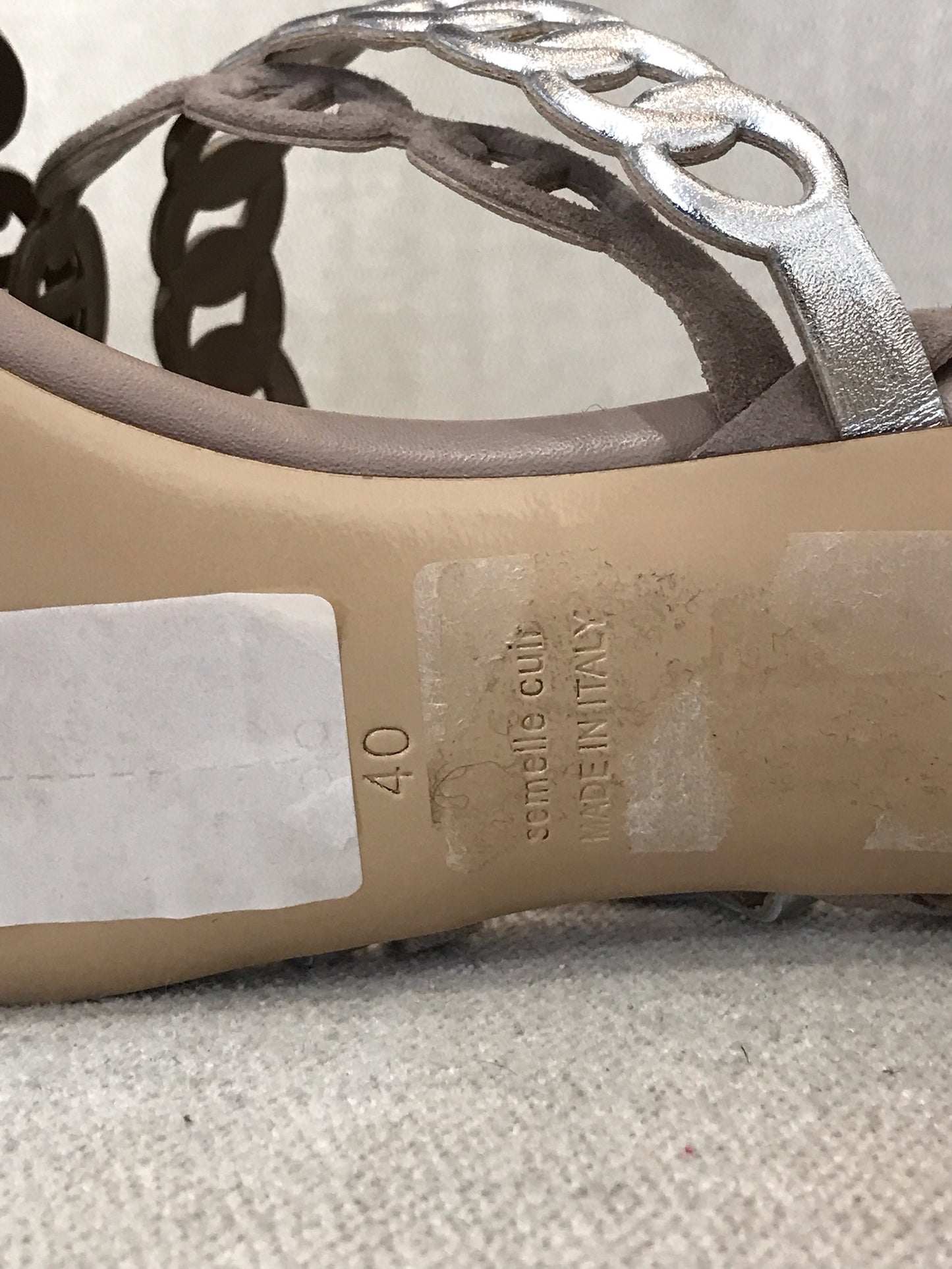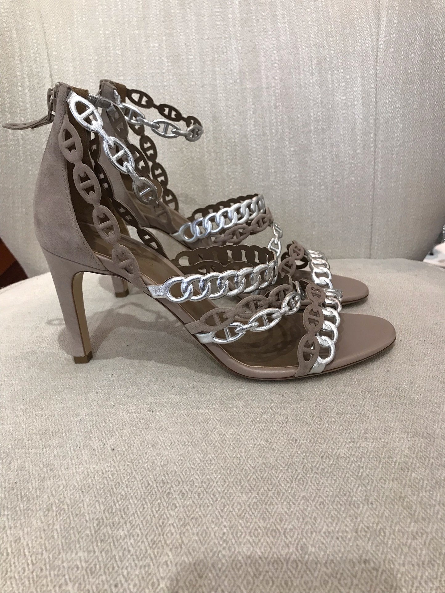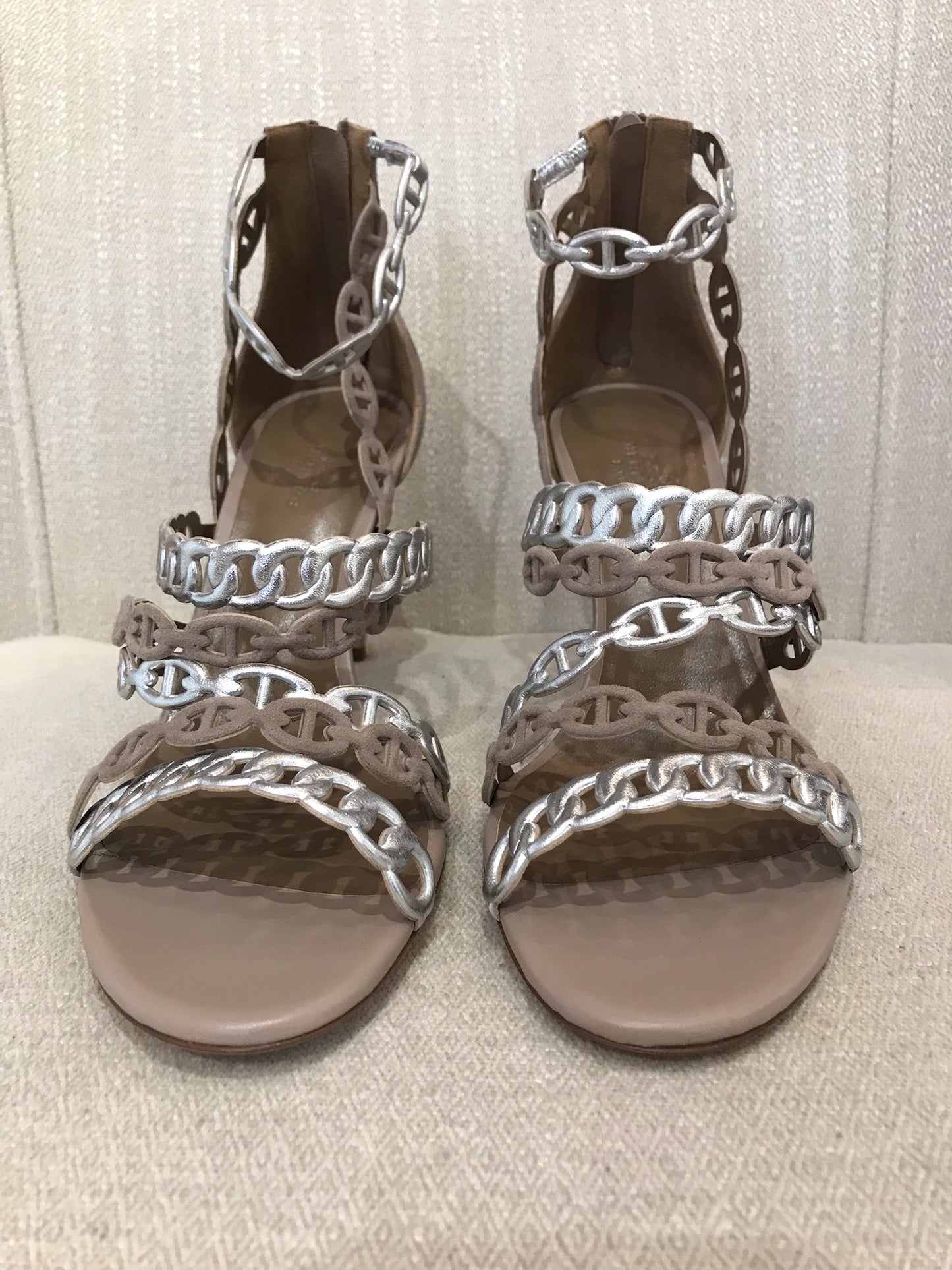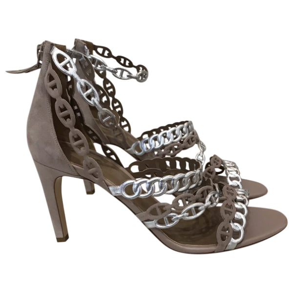 Sandales en daim beige et cuir argent à brides multiples "chaine d'ancre". Fermeture zip à l'arrière.