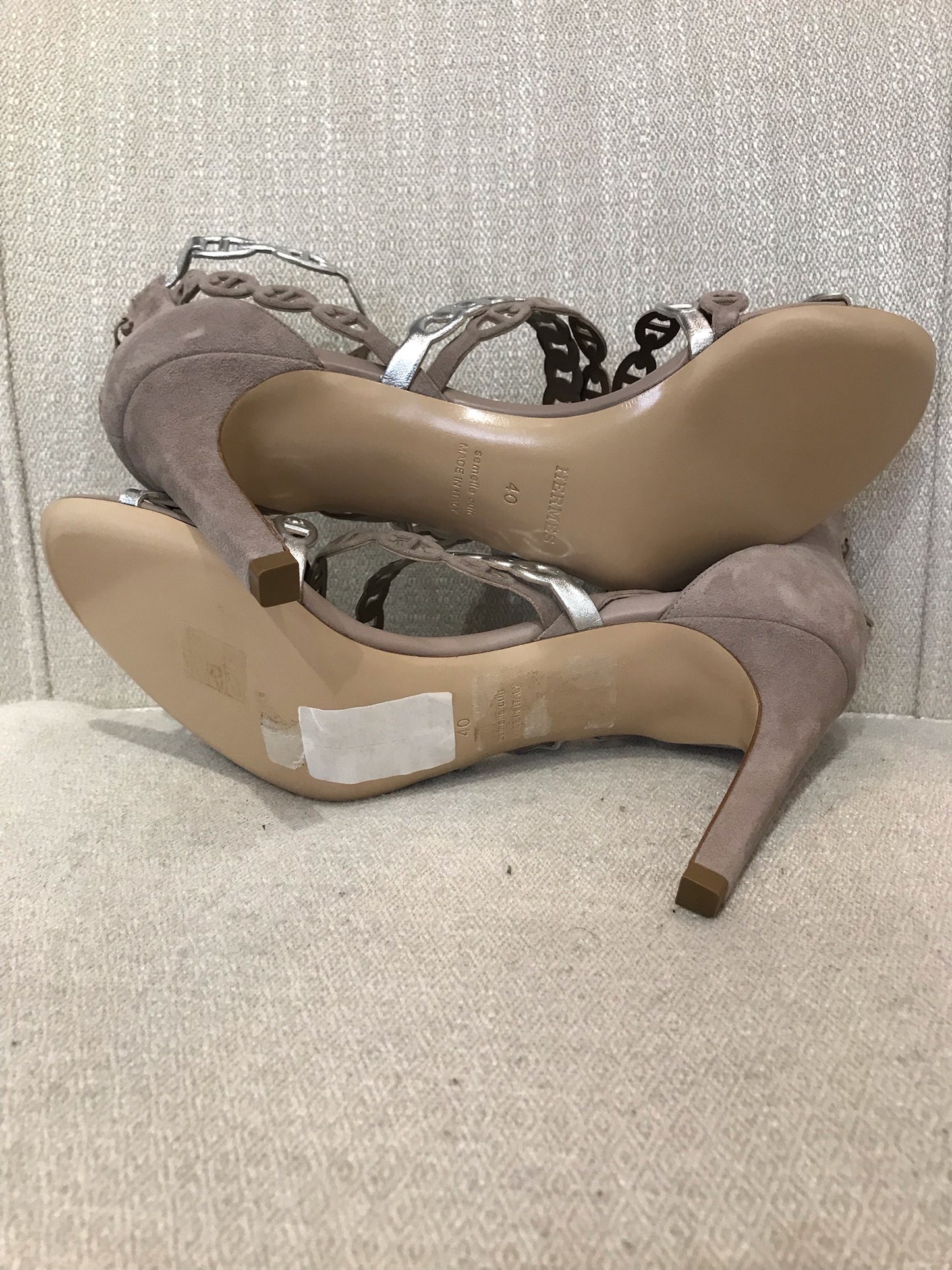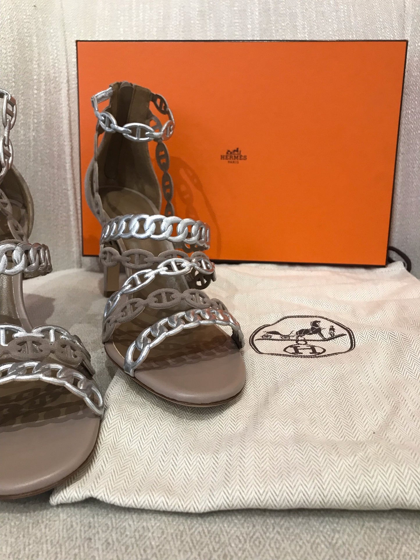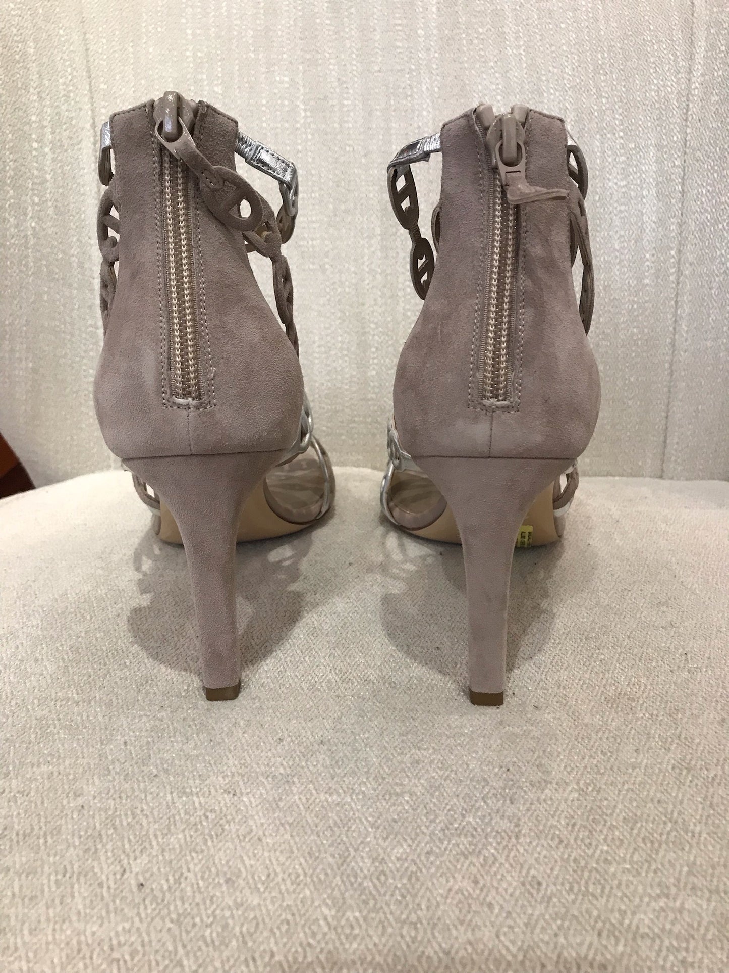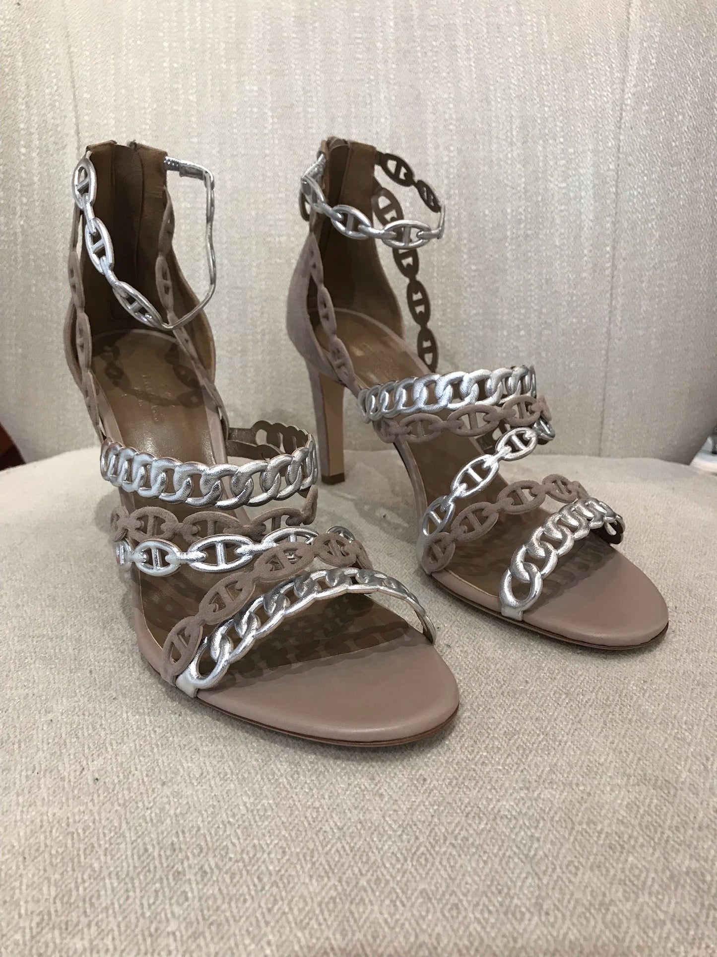 Sandales en daim beige et cuir argent à brides multiples "chaine d'ancre". Fermeture zip à l'arrière.