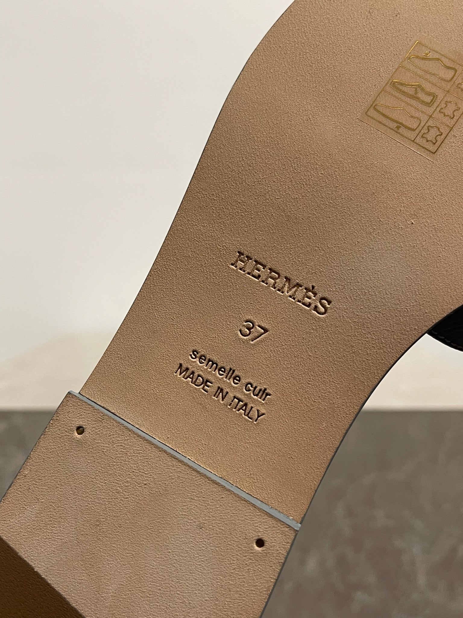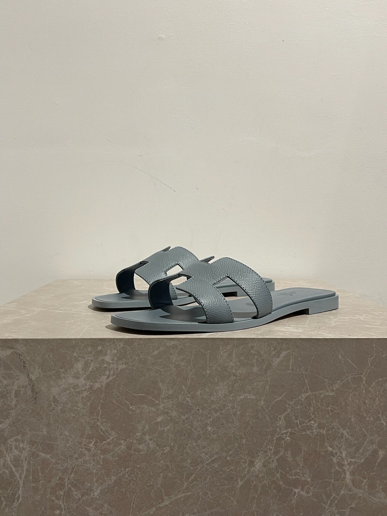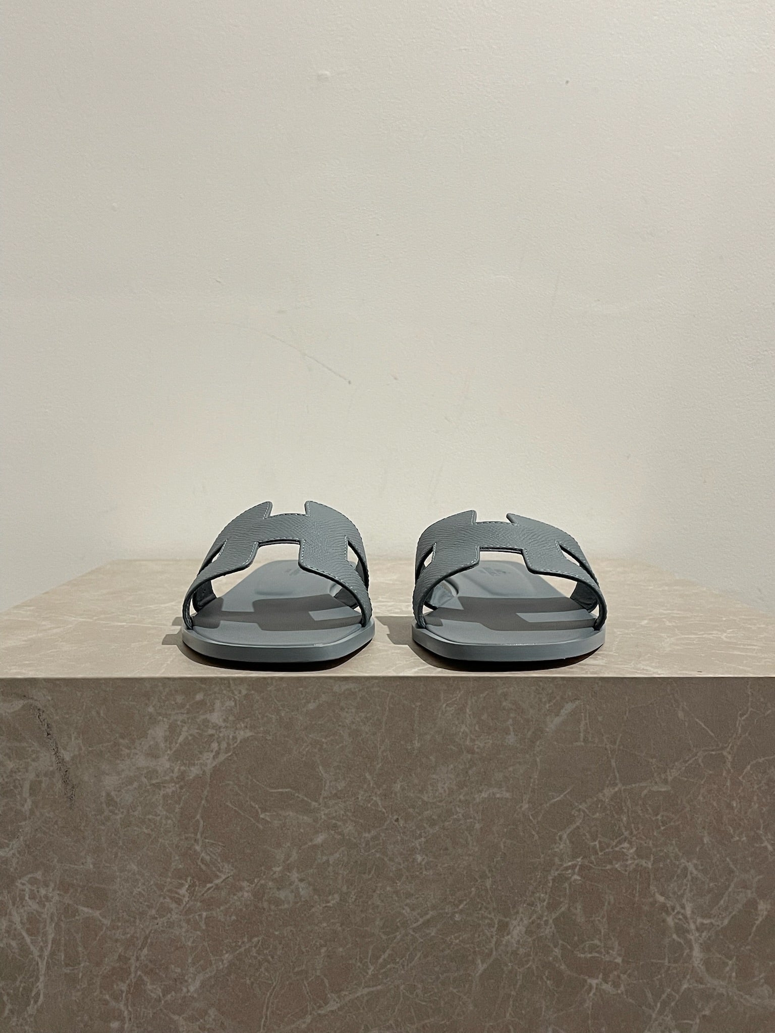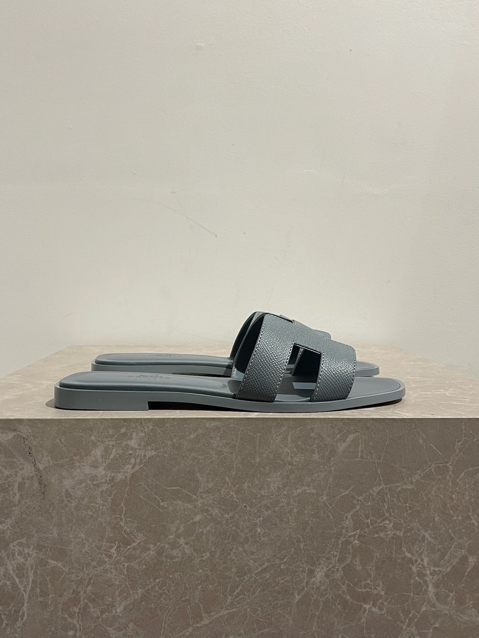 Mules en cuir grainé grise bleuté ornées du H à l'avant.