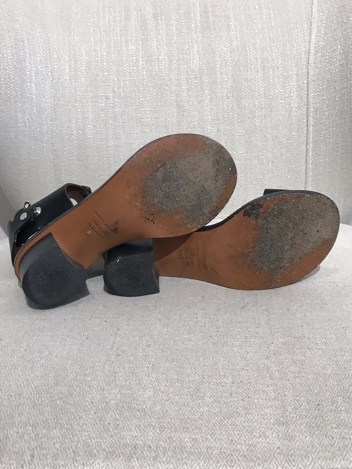 Sandales en cuir noir avec boucle aux chevilles. Petits talons confortables.
