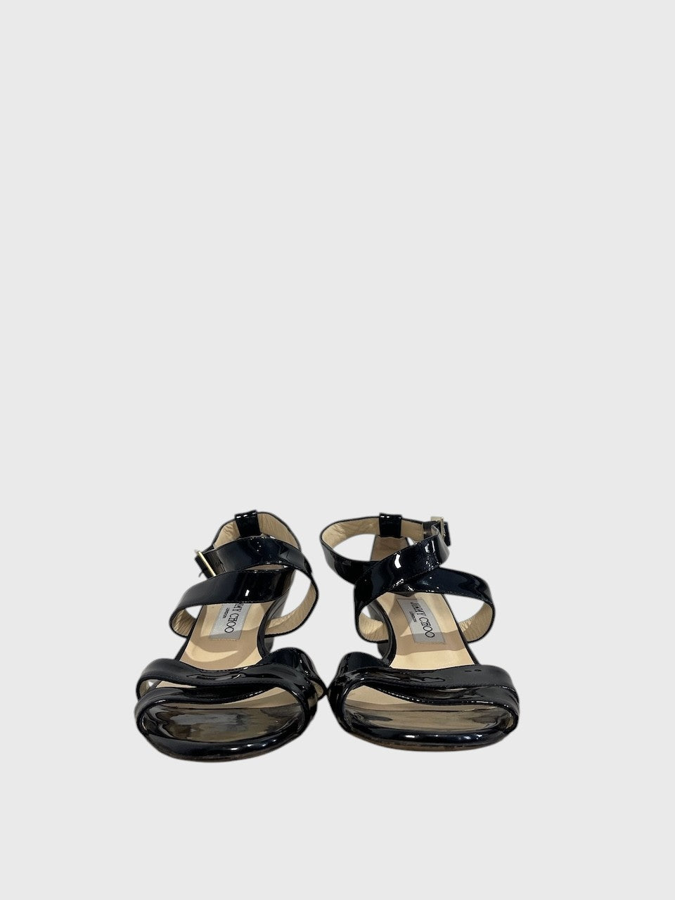 Sandales à talons compensés en cuir verni noir avec double bride croisées à l'avant et sur la cheville. Boucle ajustable signée Jimmy Choo.