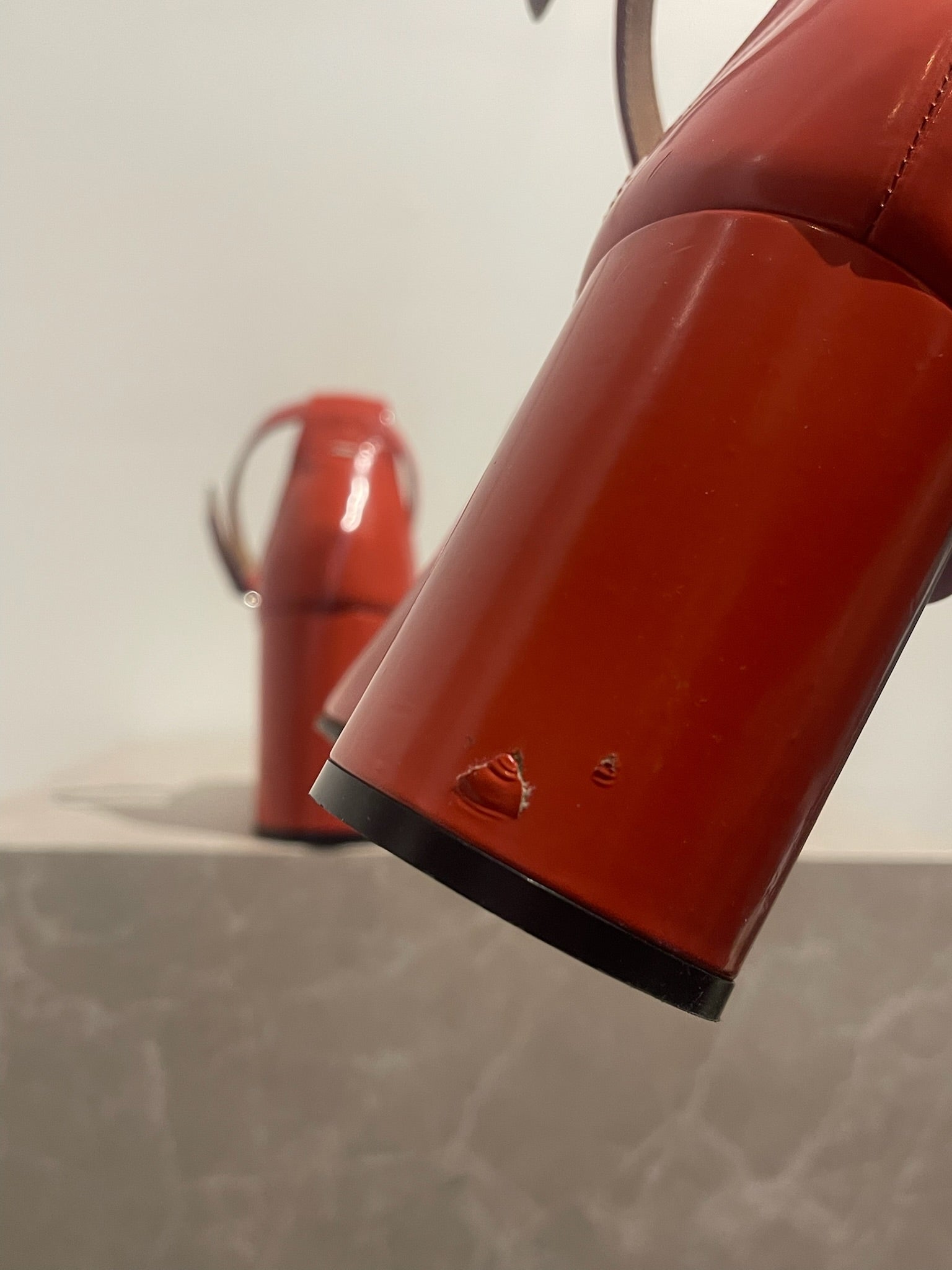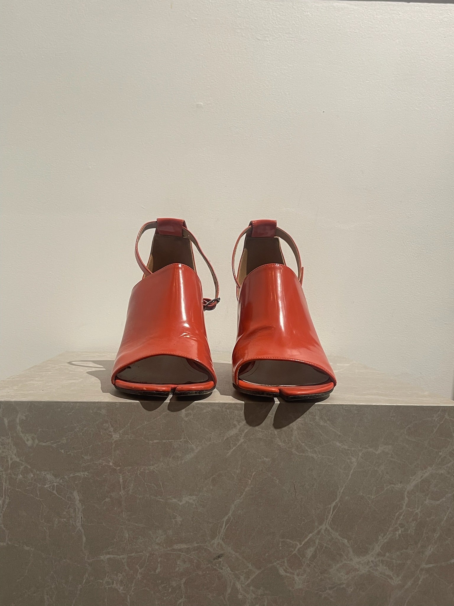 Sandales à talon en cuir orange avec bouts ouvert fendus, boucle ajustable aux chevilles et talons ronds. Hauteur des talons : 9cm.