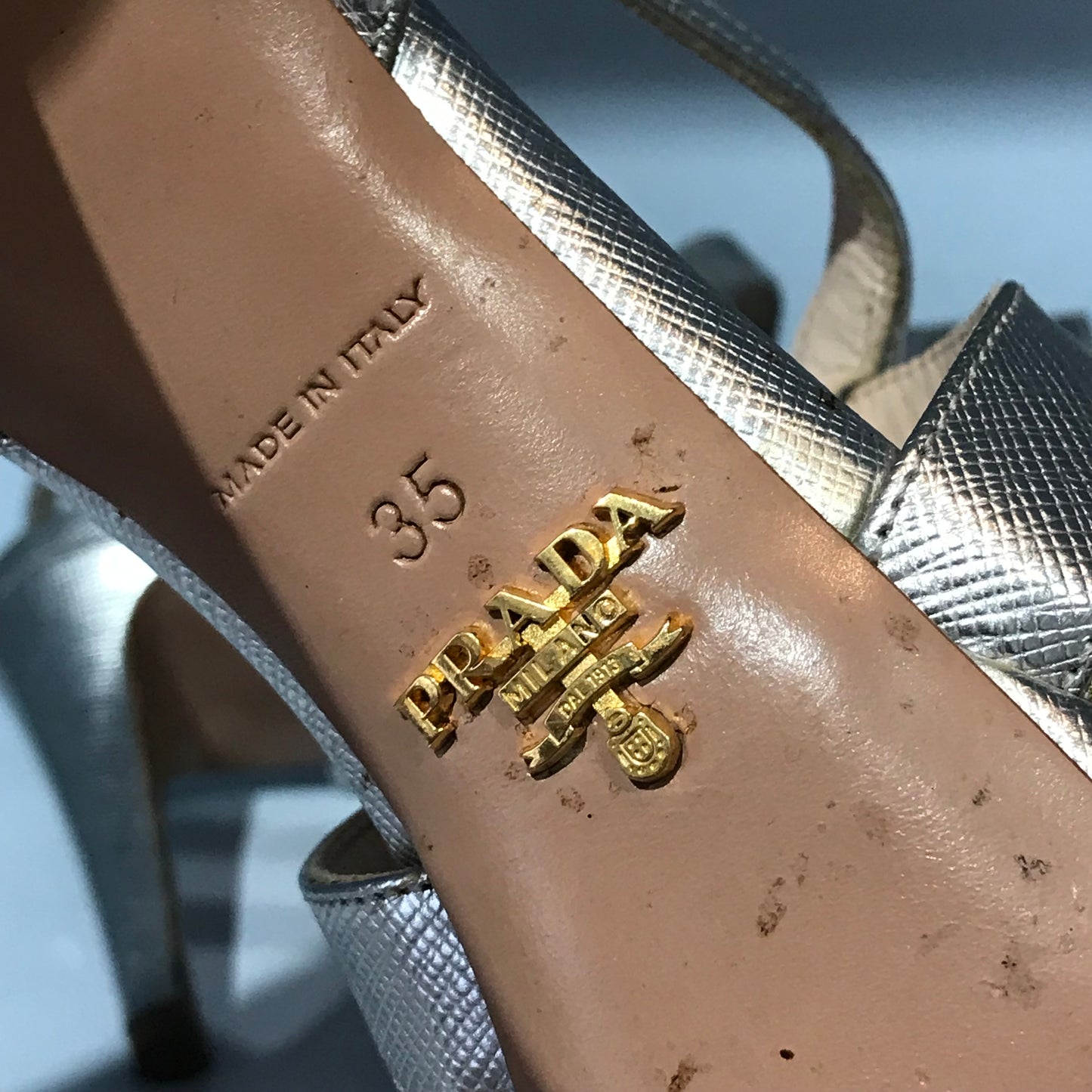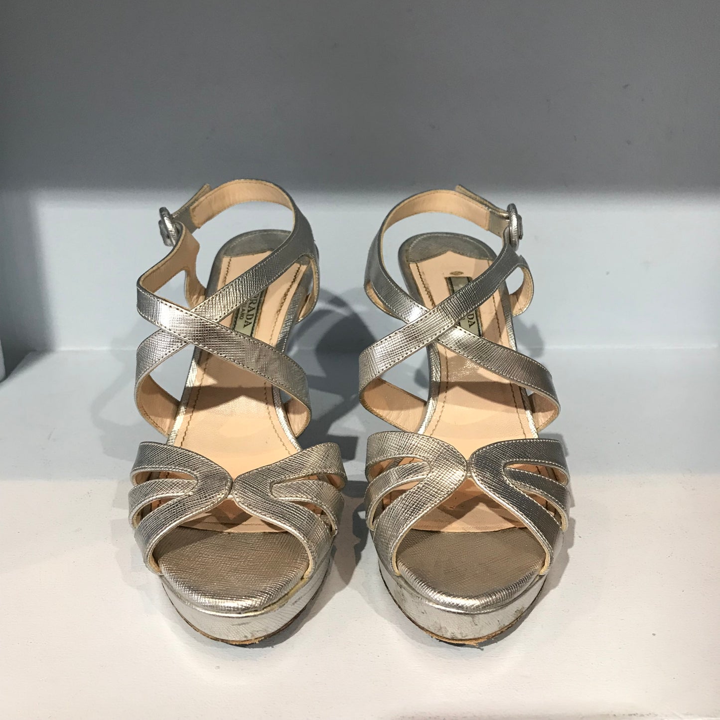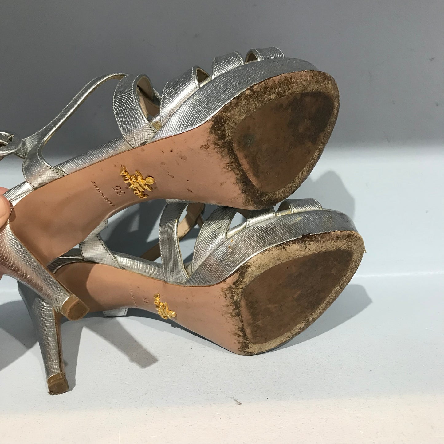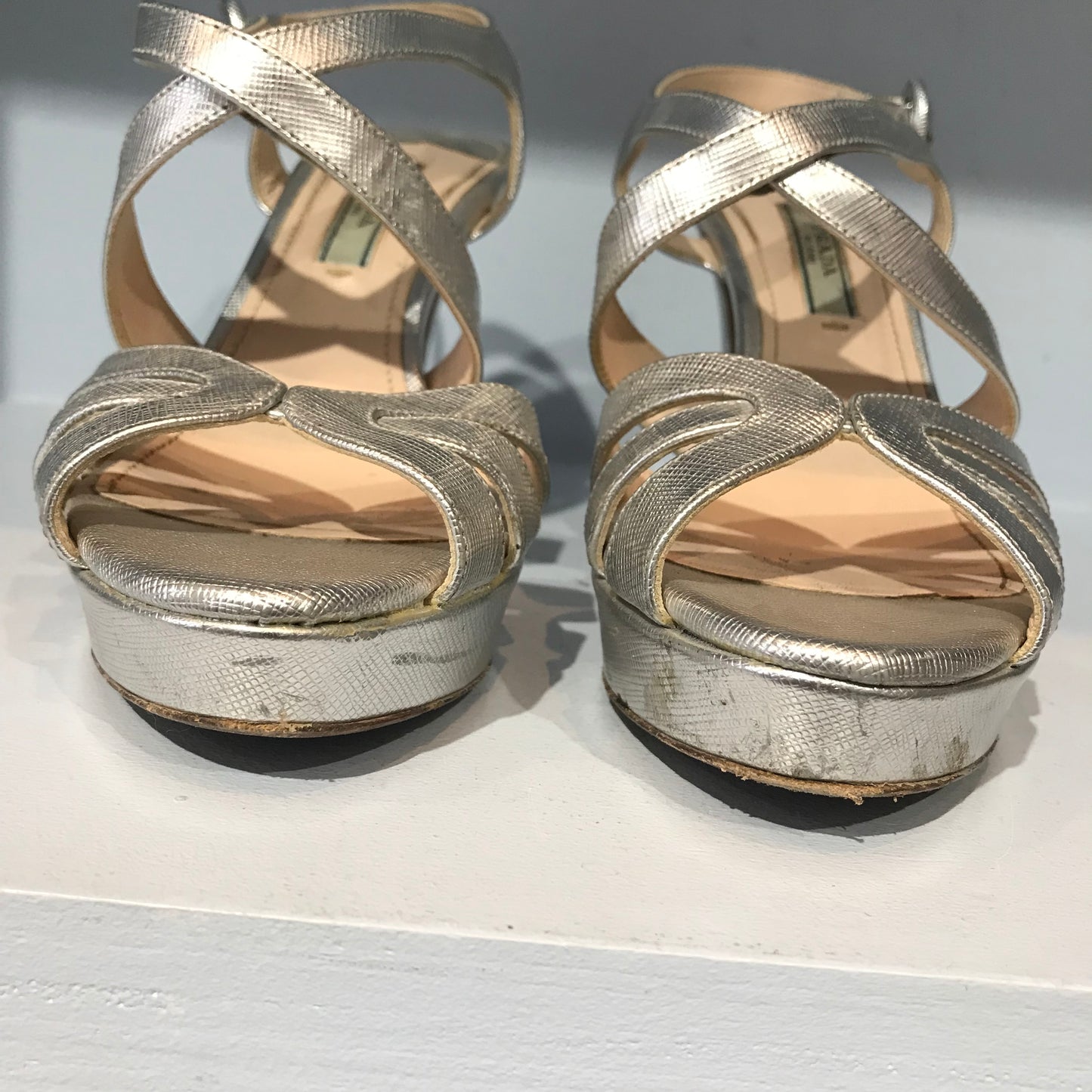 Sandales à découpes en cuir argenté. Boucle ajustable à la cheville.