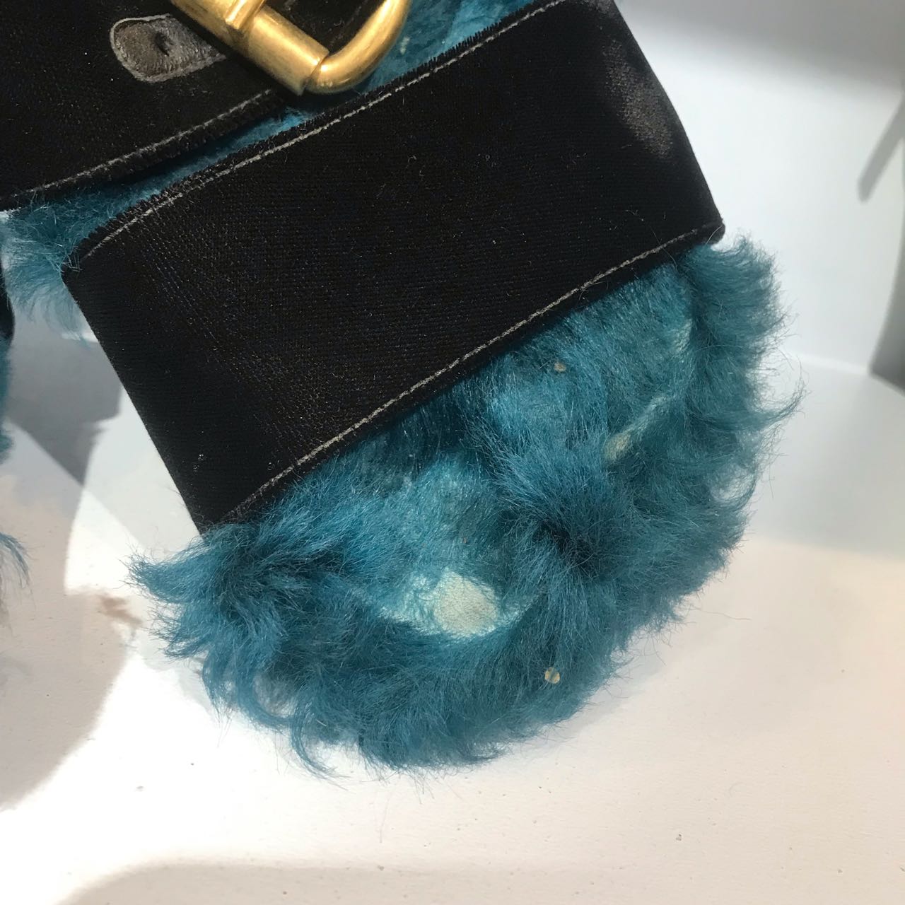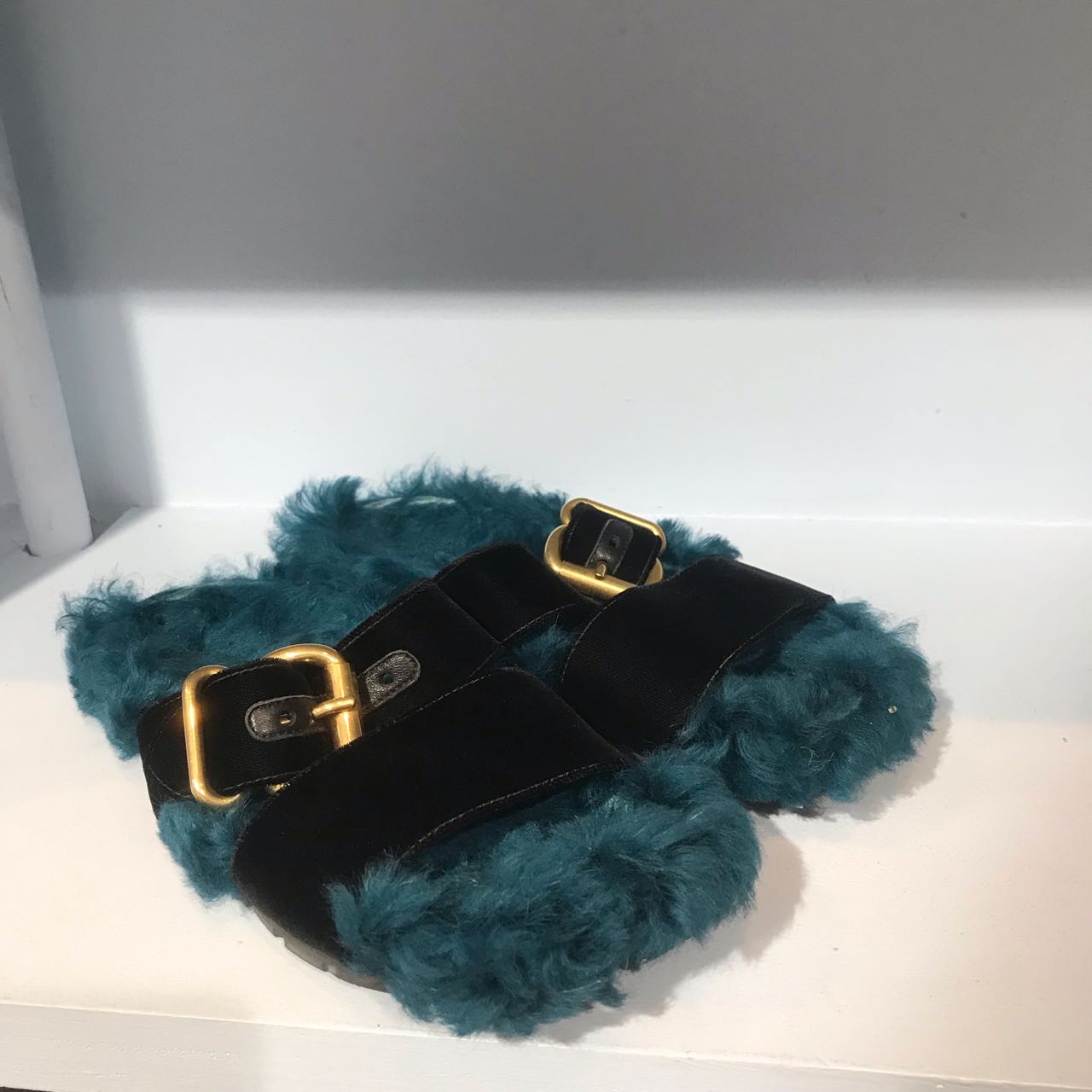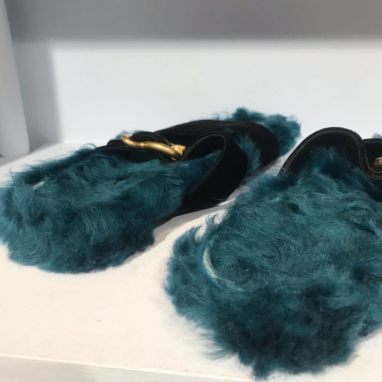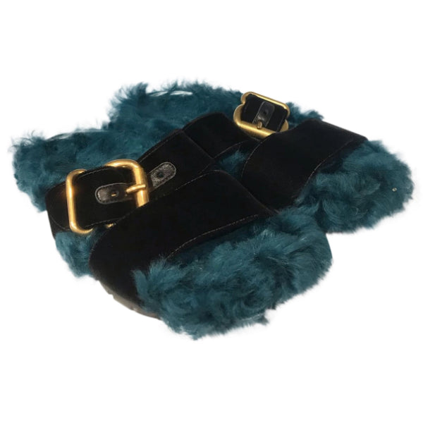 Sandales plates en fourrure bleu et velours noir avec un boucle doré. Fourrure véritable.