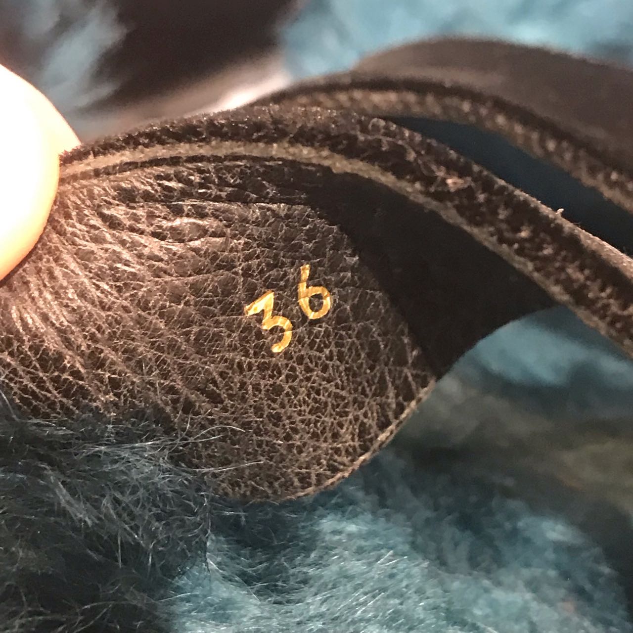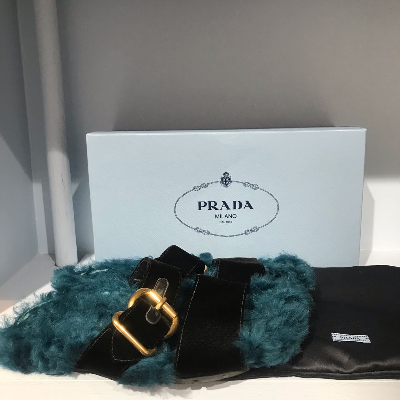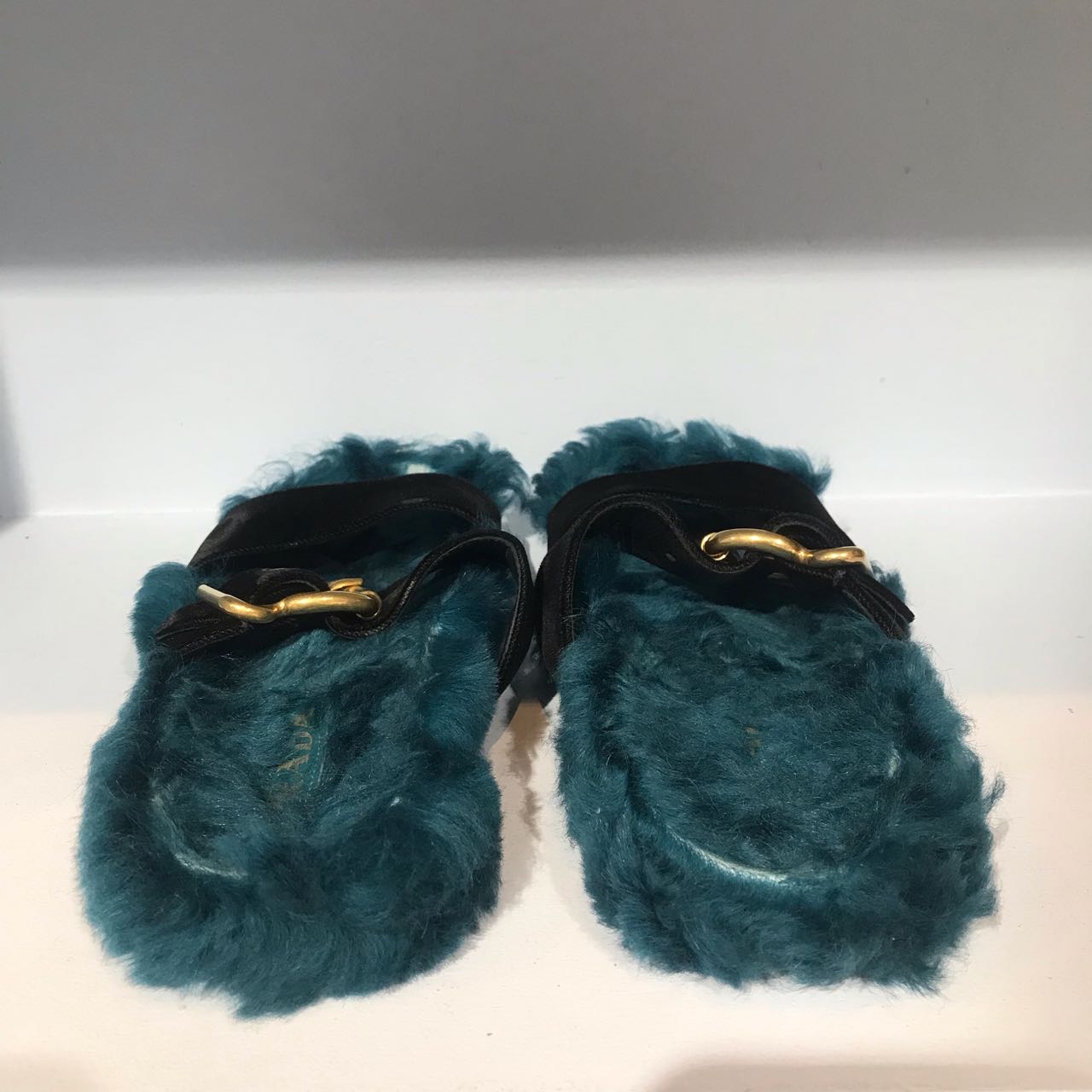 Sandales plates en fourrure bleu et velours noir avec un boucle doré. Fourrure véritable.