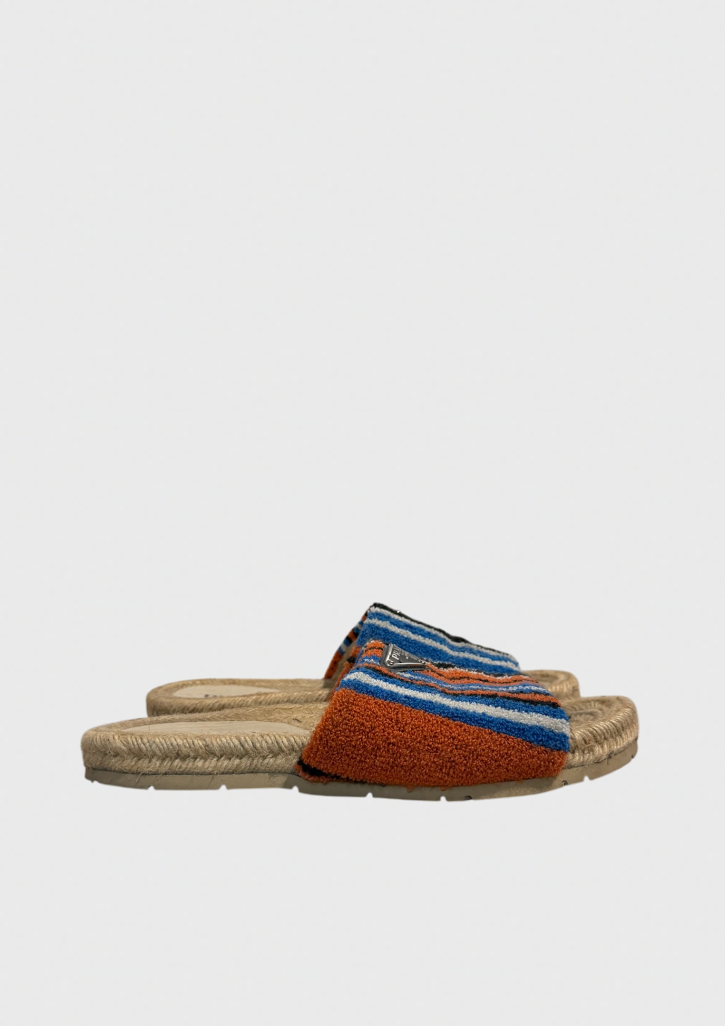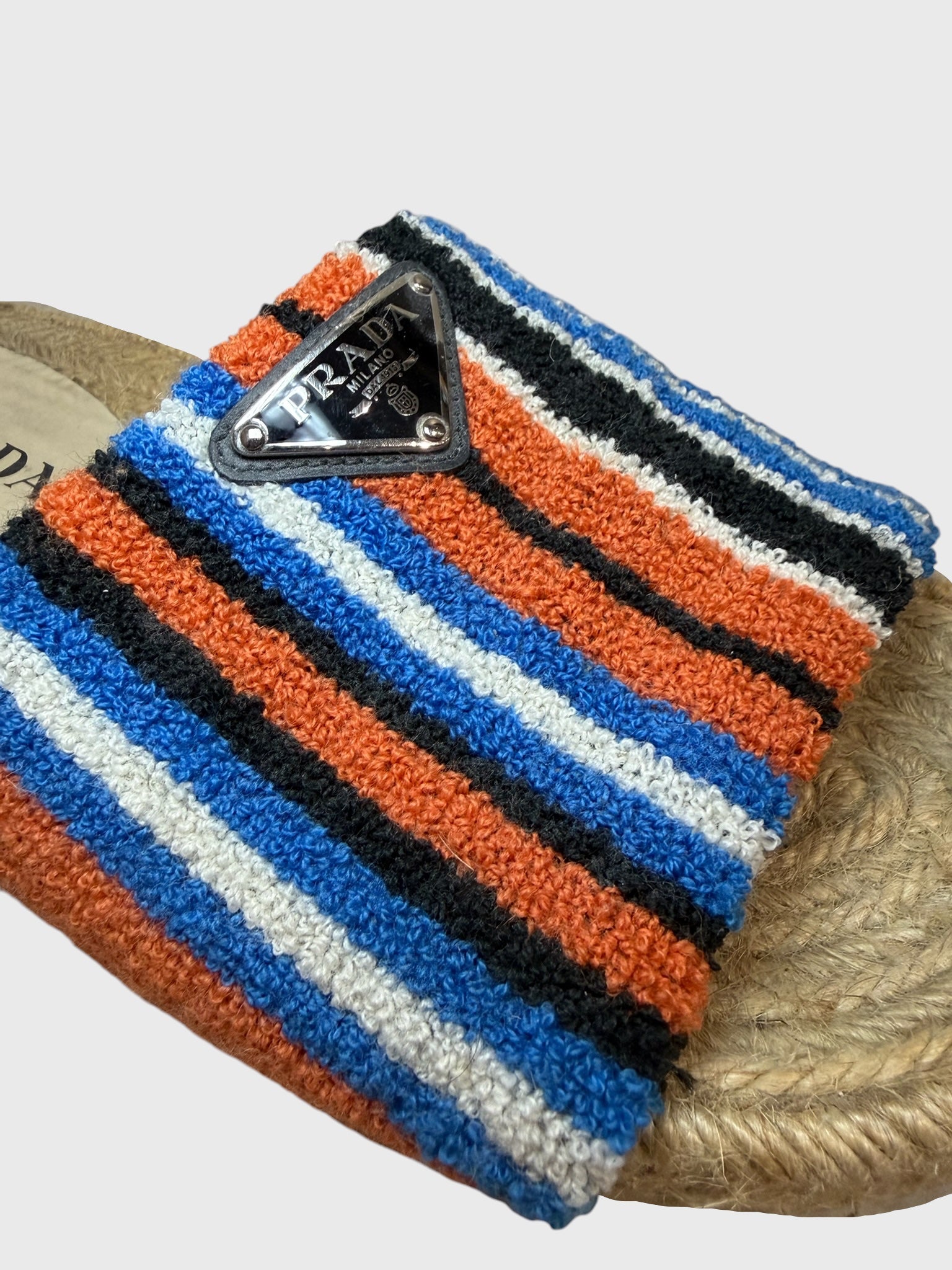 Sandales plate en tissu éponge rayé bleu, noir et orange avec la semelle en corde. Plaque Prada en métal à l'avant.