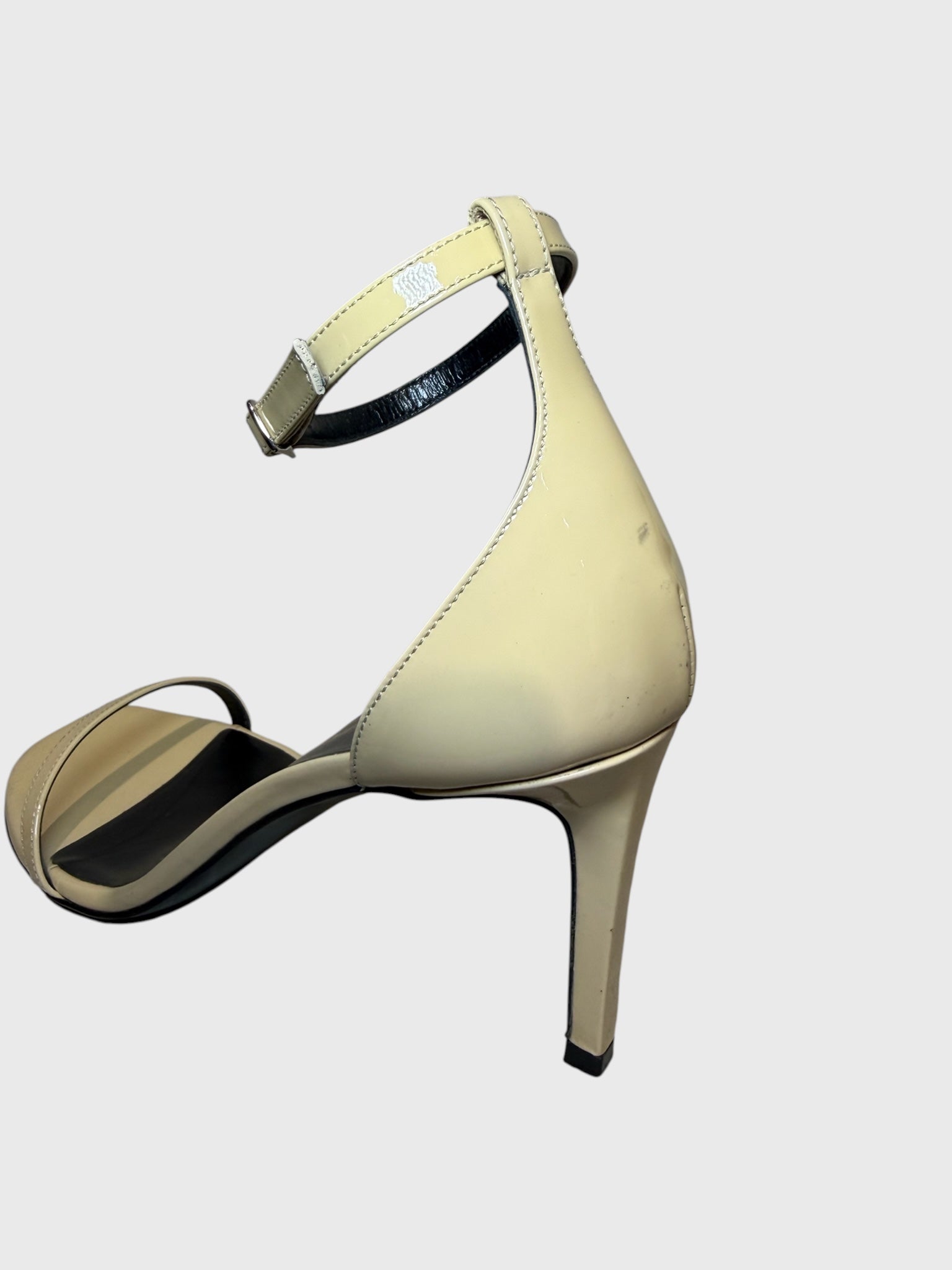 Sandales en cuir verni beige avec bride fine sur le pied et bride ajustable à la cheville.