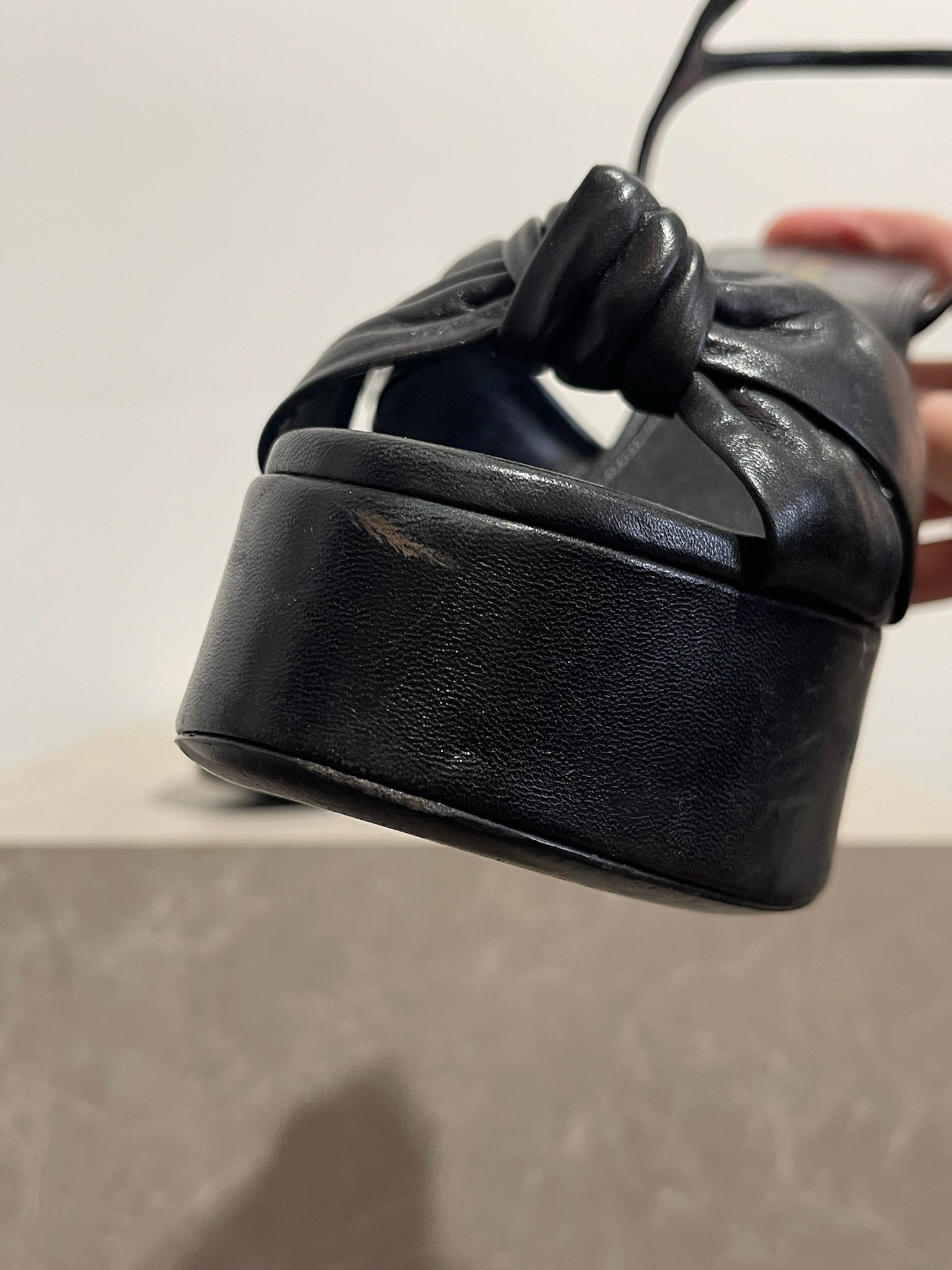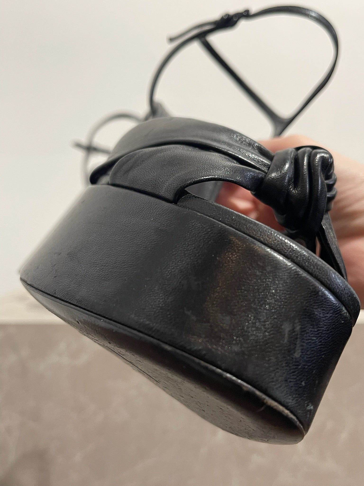 Sandales à talons compensés en cuir noir. Boucle ajustable à la cheville.