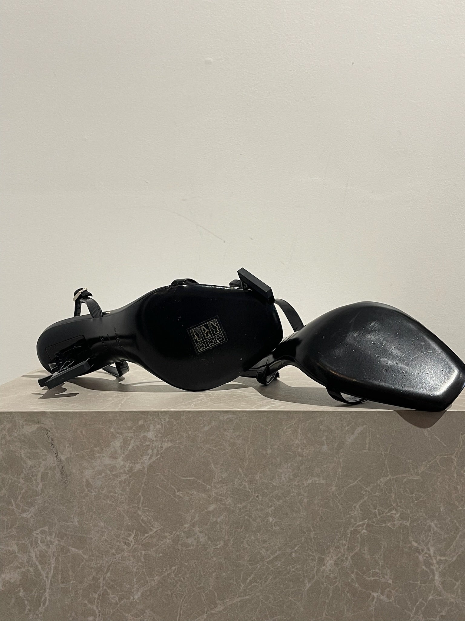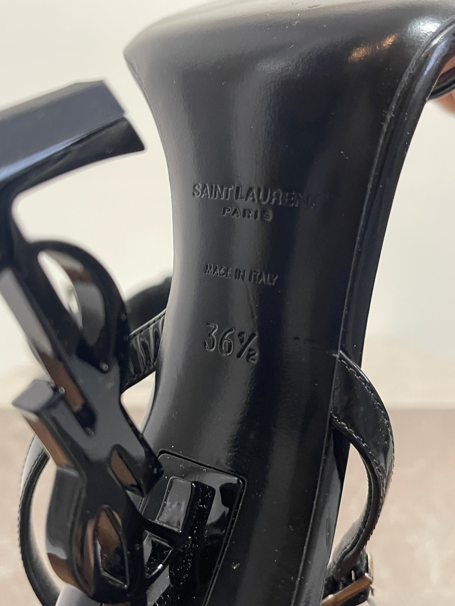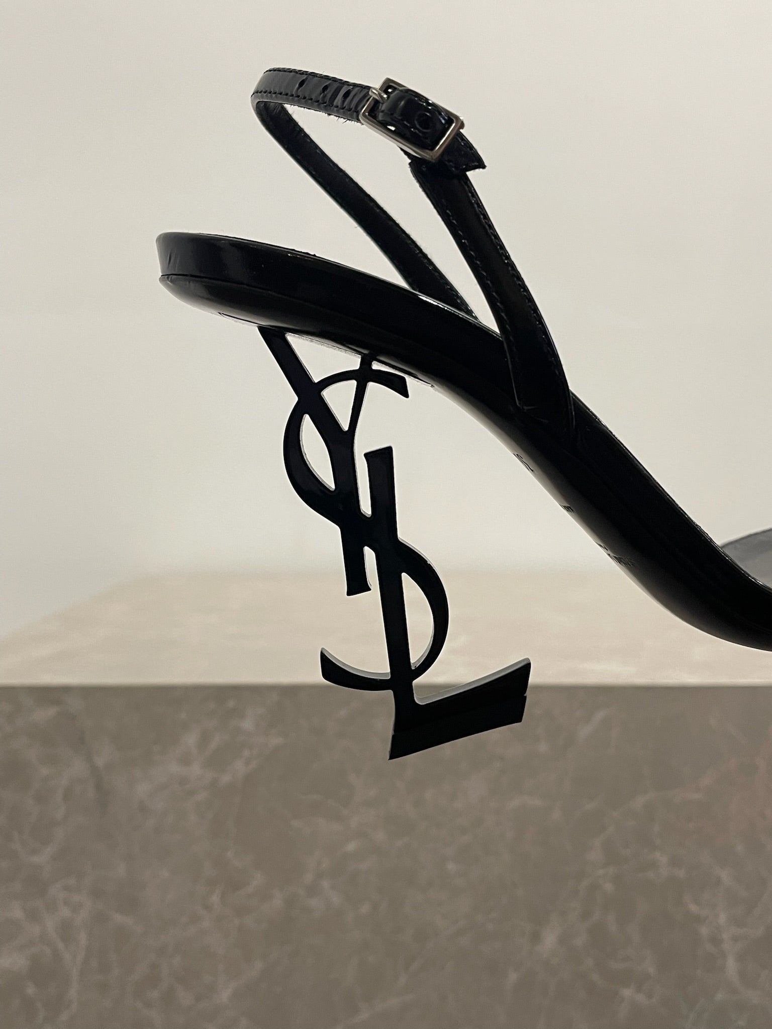Sandales en cuir de veau vernis noir. Talon YSL en métal noir.