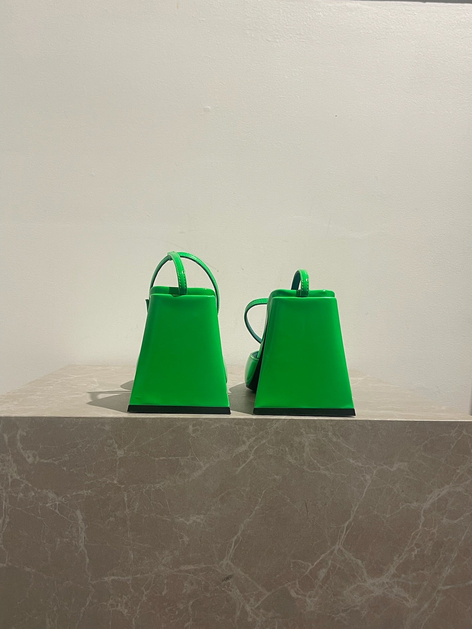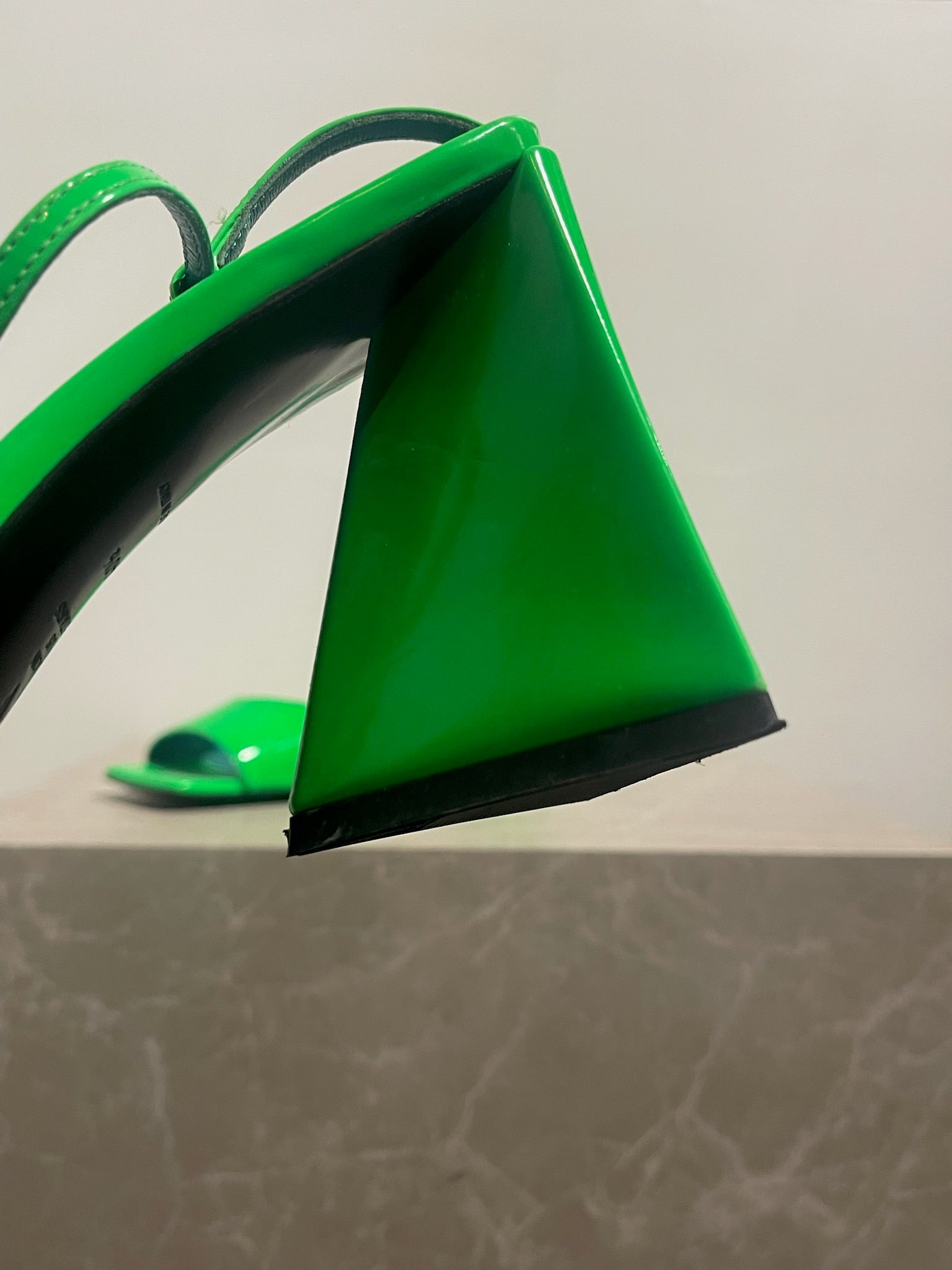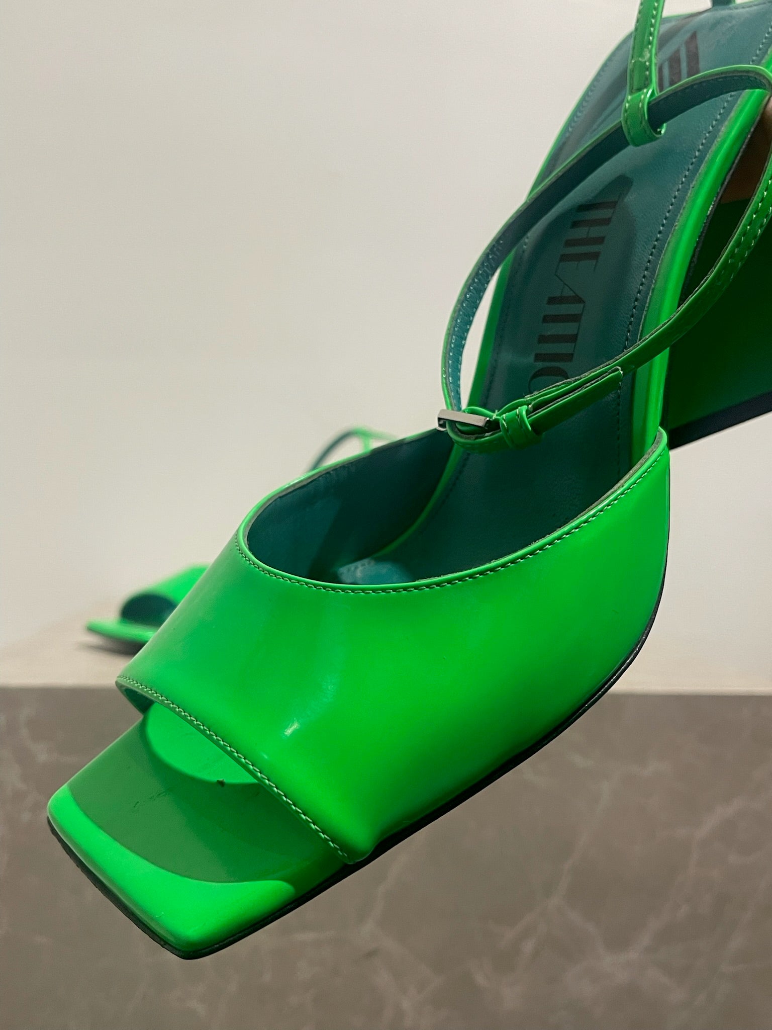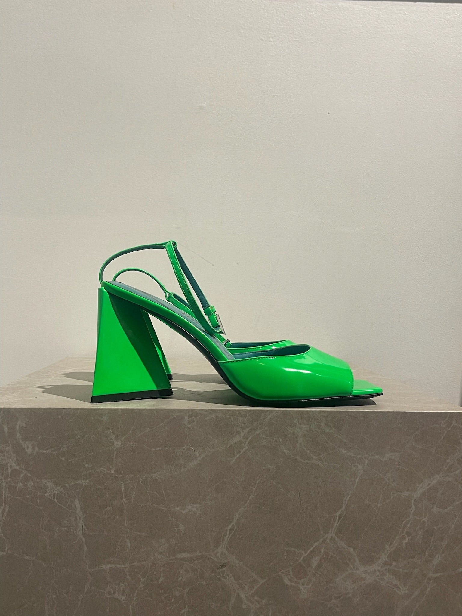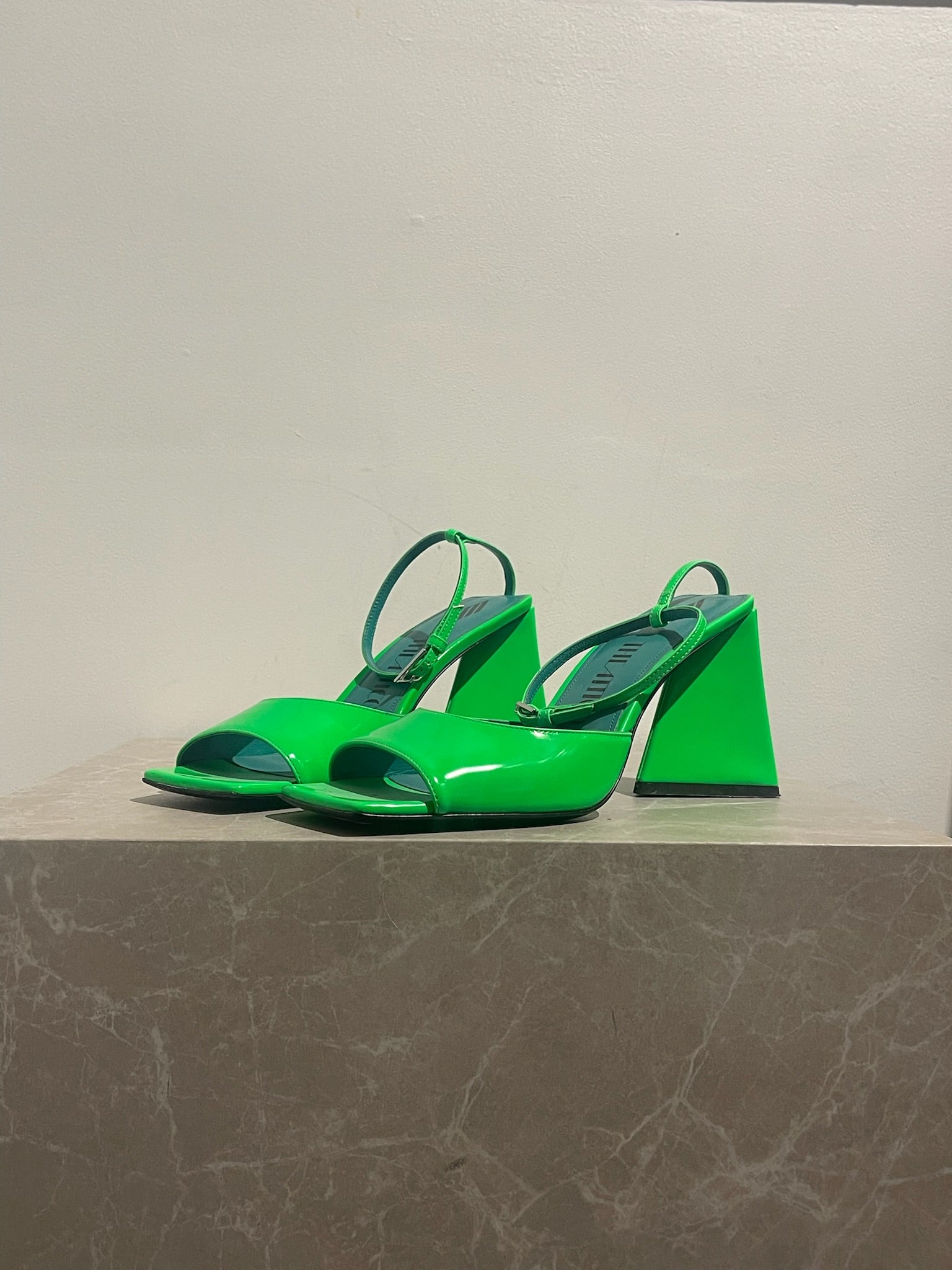 Sandales à talons en cuir verni vert fluo. Fermeture par boucle ajustable à la cheville. Bouts ouverts carrés. Talons triangulaire.