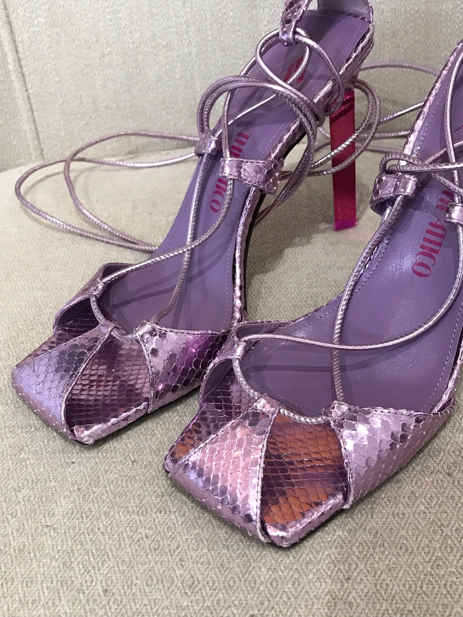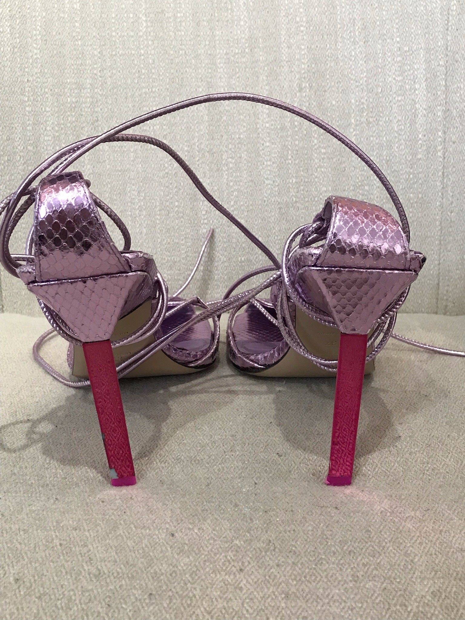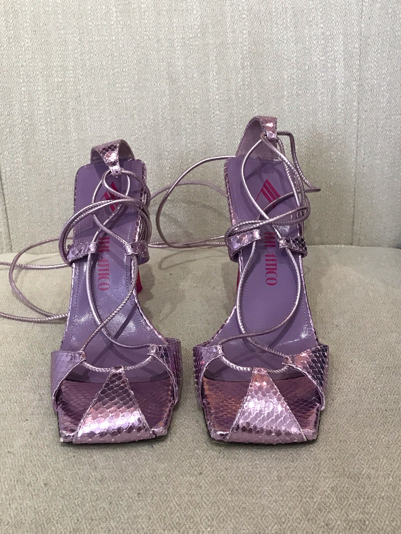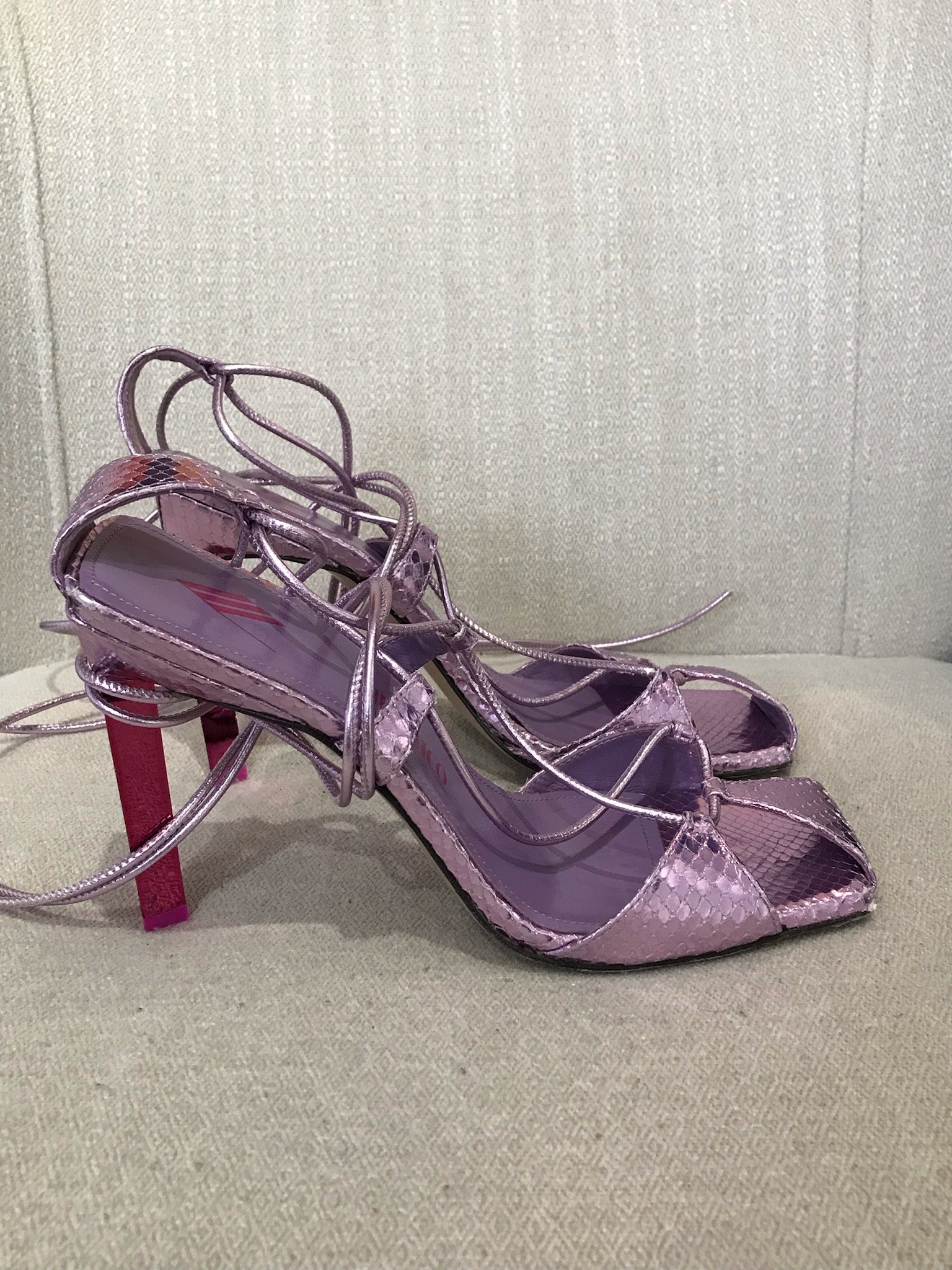 Sandales en cuir métallisé embossé façon serpent violet avec liens à nouer autour de la cheville. Bouts carrés ouverts.