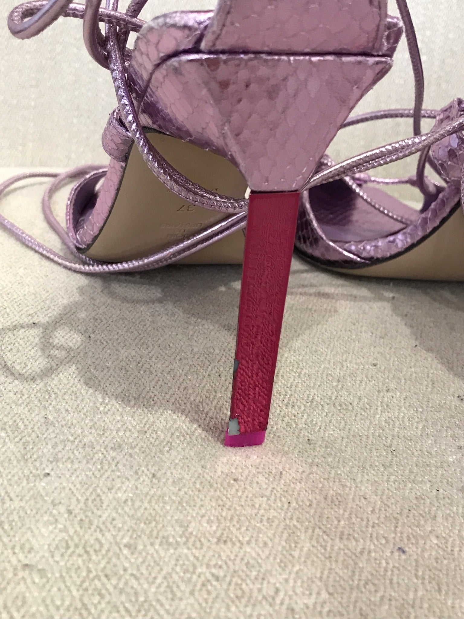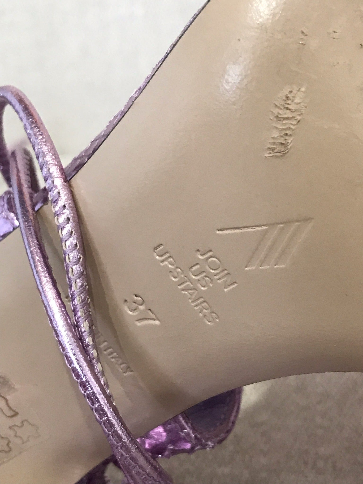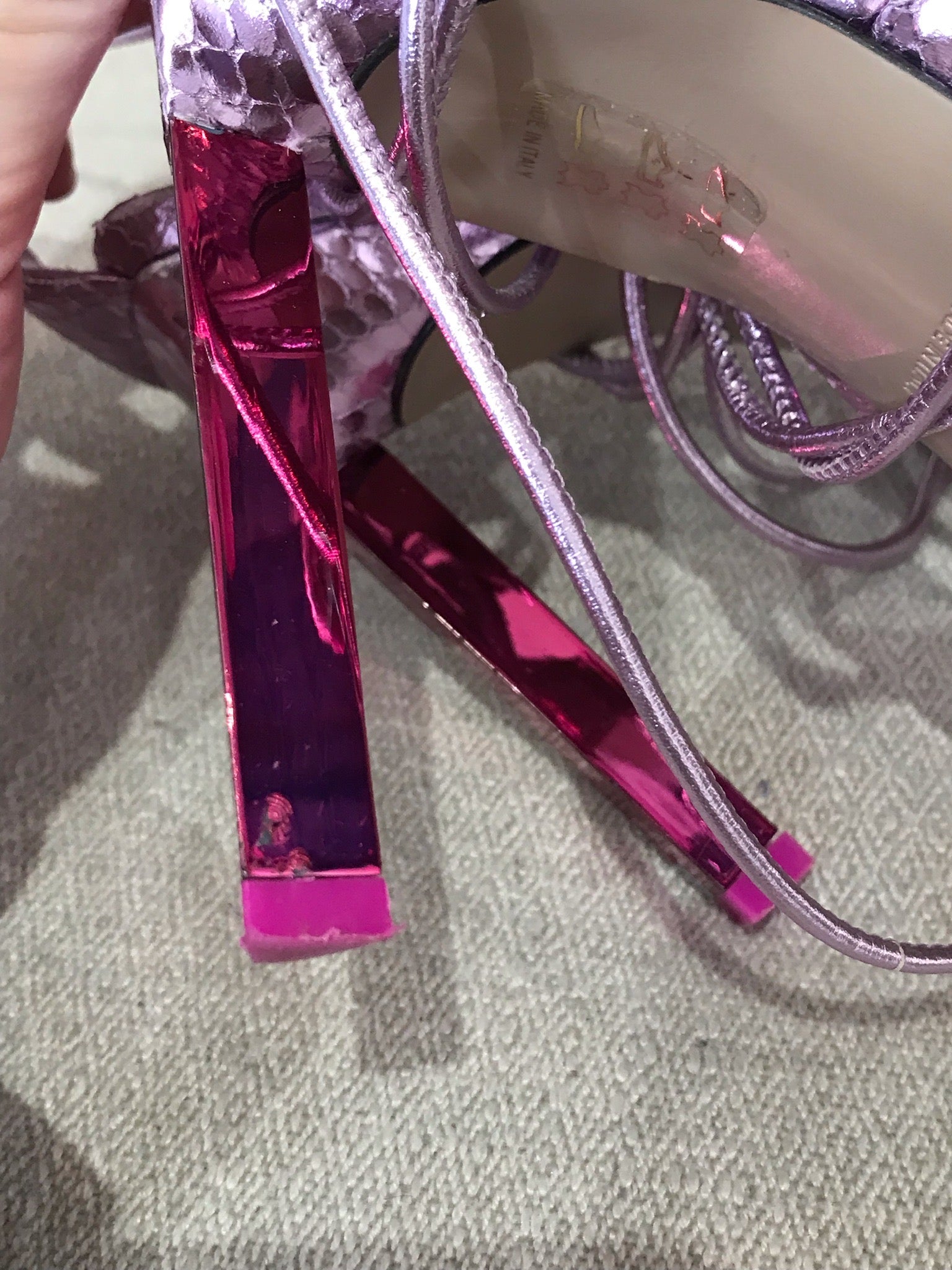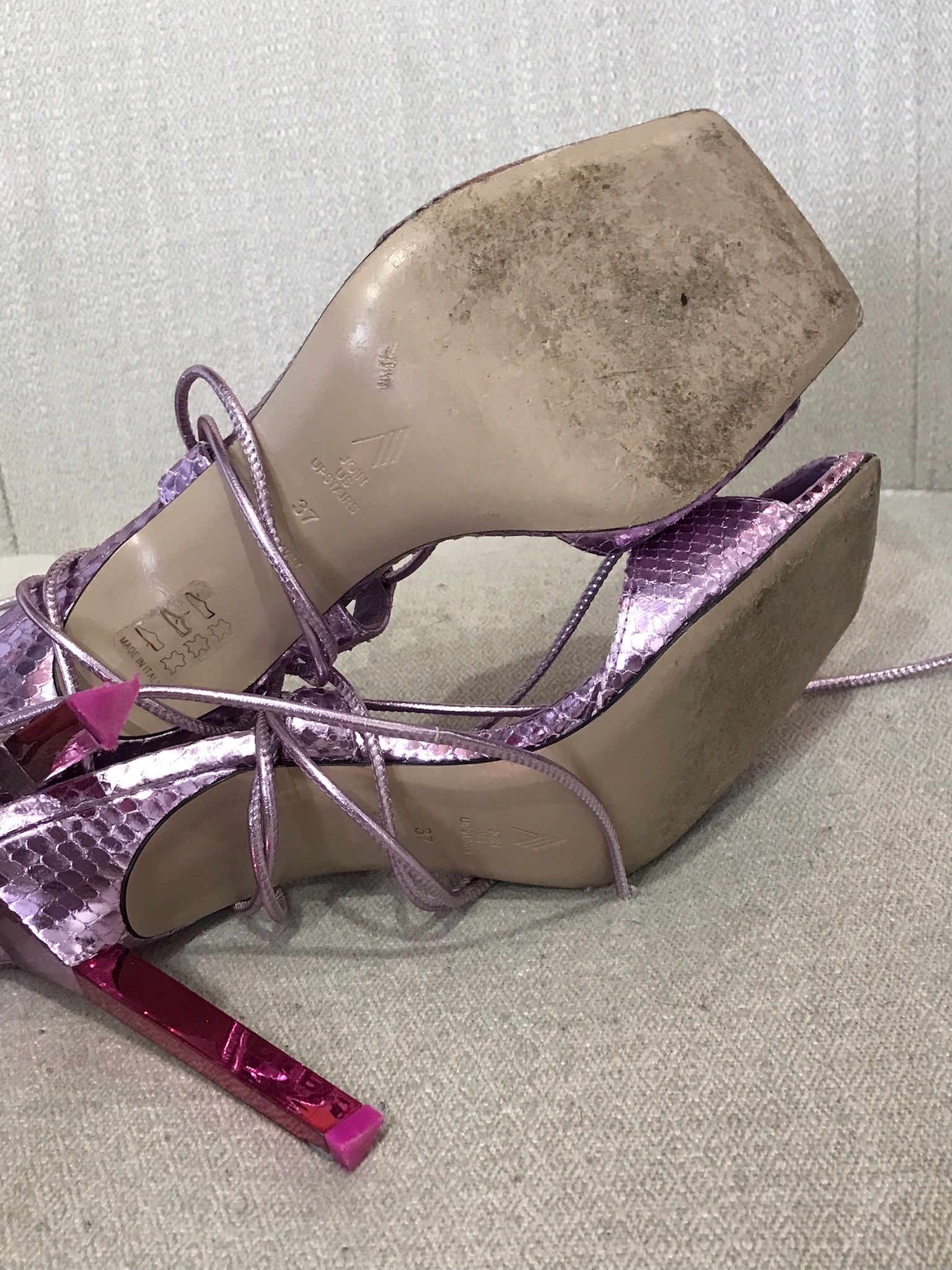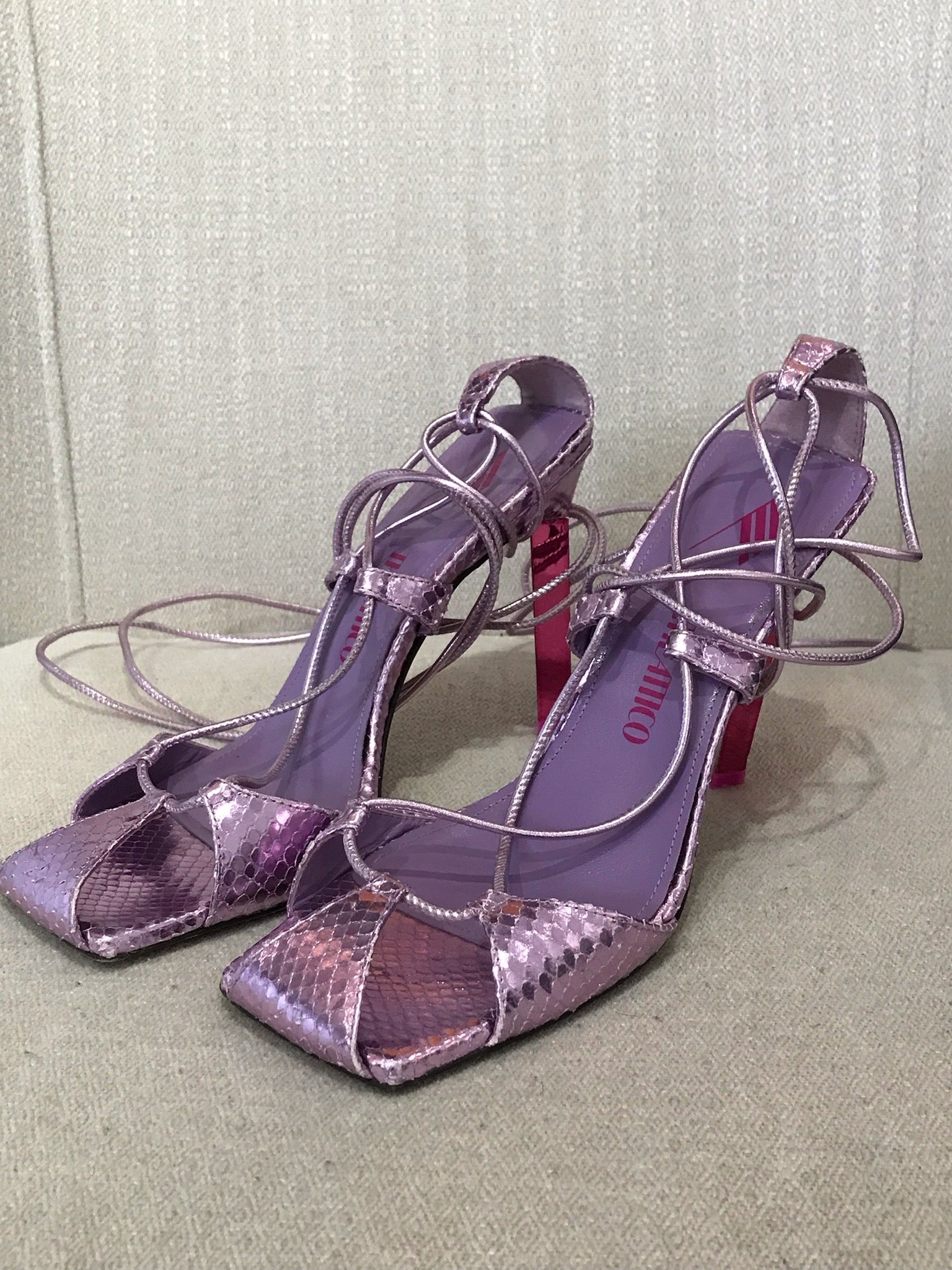 Sandales en cuir métallisé embossé façon serpent violet avec liens à nouer autour de la cheville. Bouts carrés ouverts.