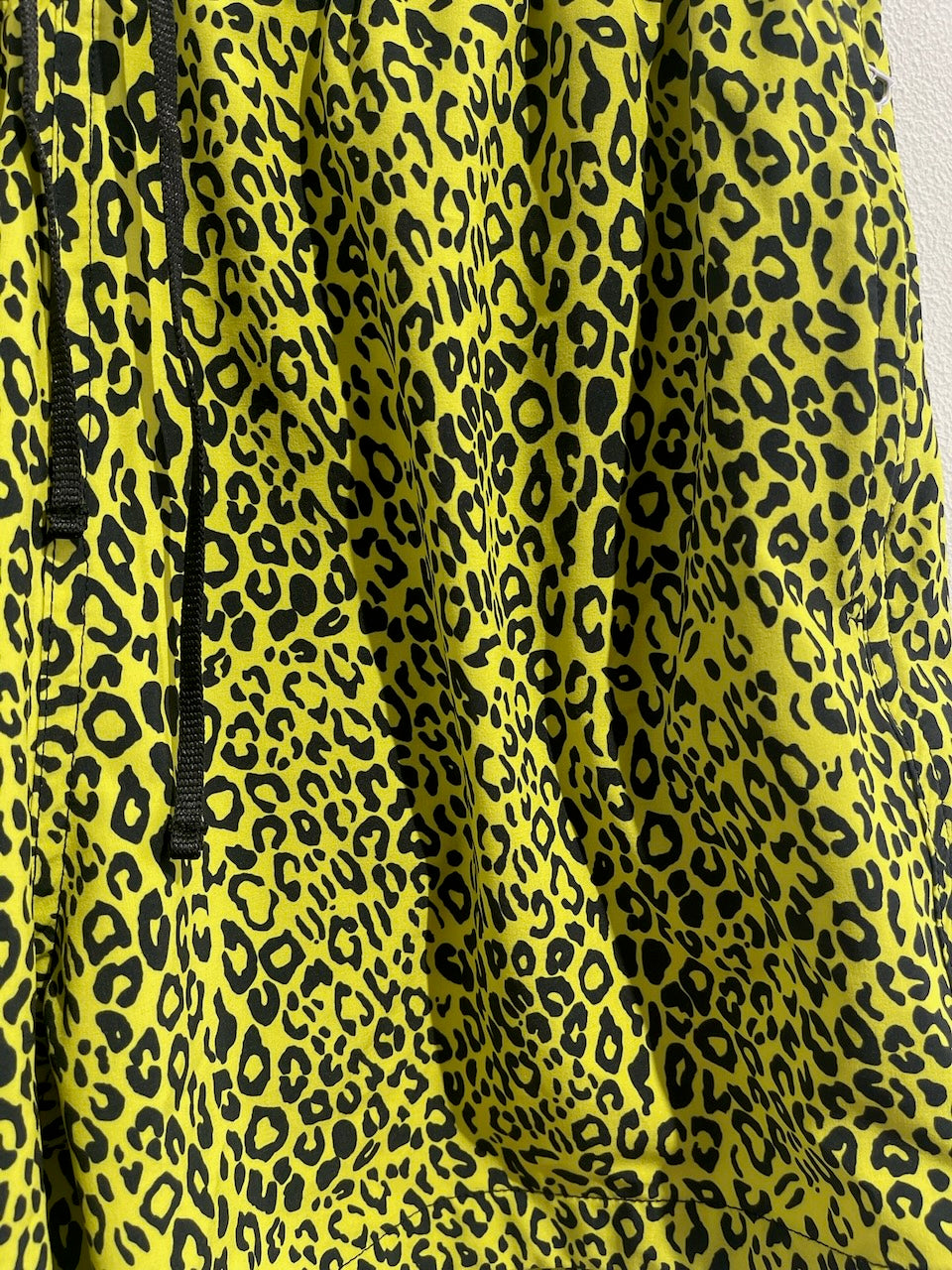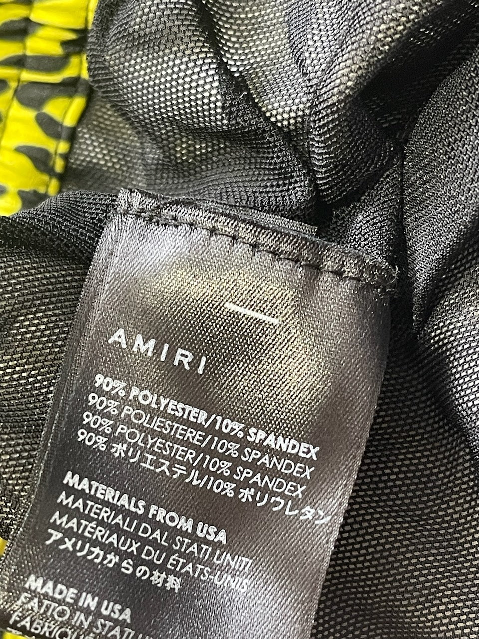 Short de bain court en polyester à motif léopard jaune, lien de serrage à la taille, poches latérales zippées et poche arrière. Logo Amiri sur cuir noir à l'arrière.
