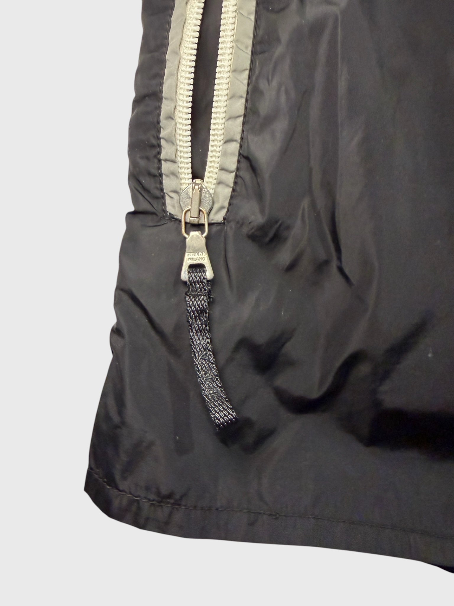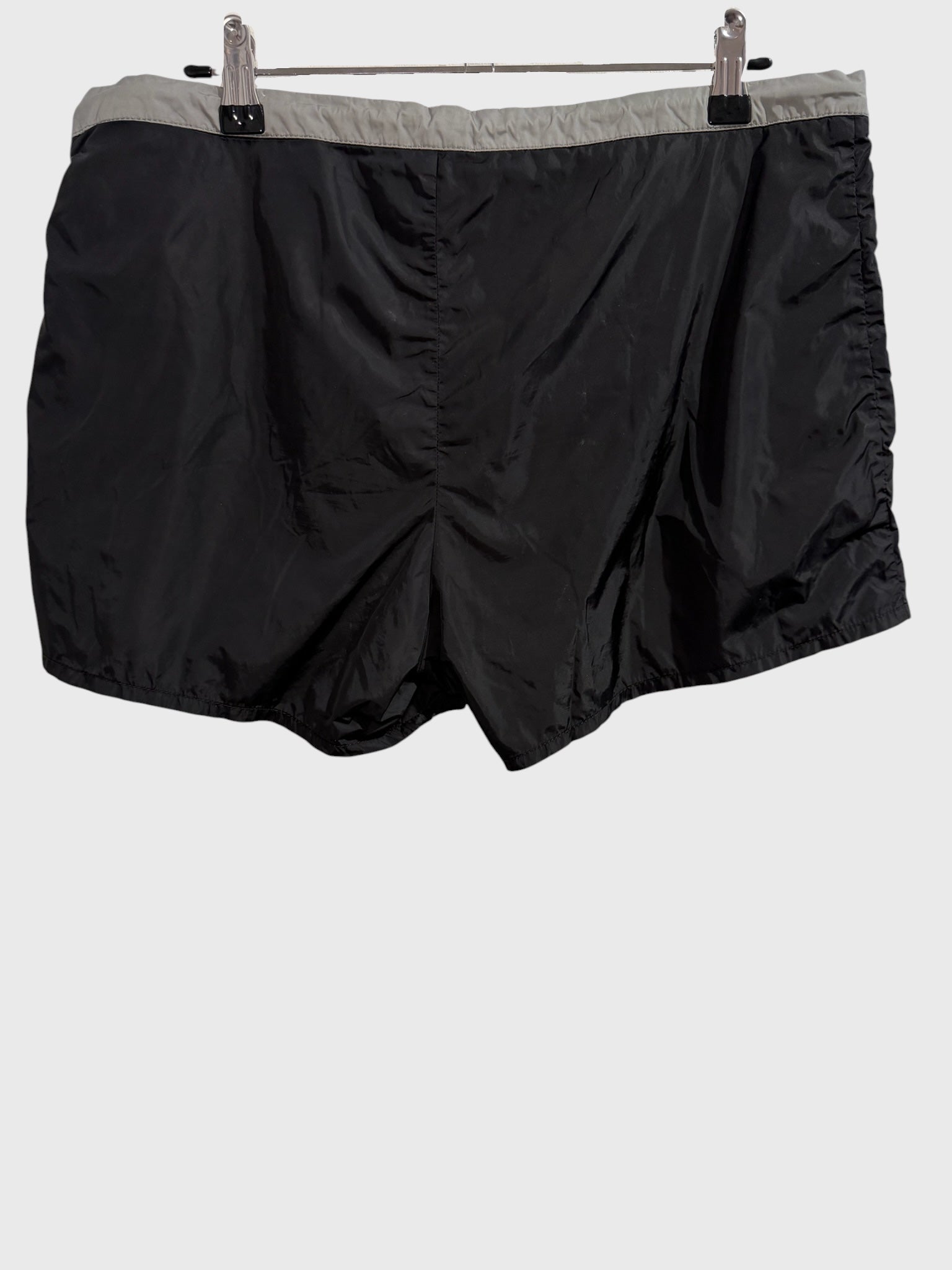 Short de bain en polyamide noir avec taille élastique à lien de serrage gris, poches latérales.