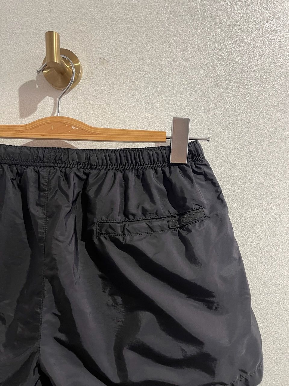 Short de bain court en polyamide noir avec taille élastique à lien de serrage, poches latérales et poche arrière signée Prada.
