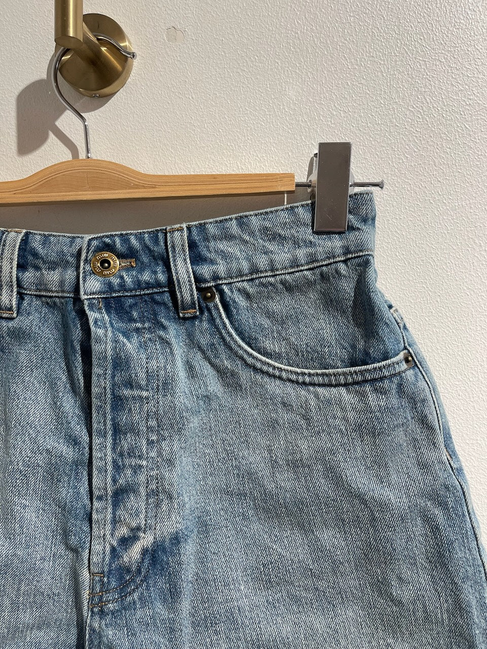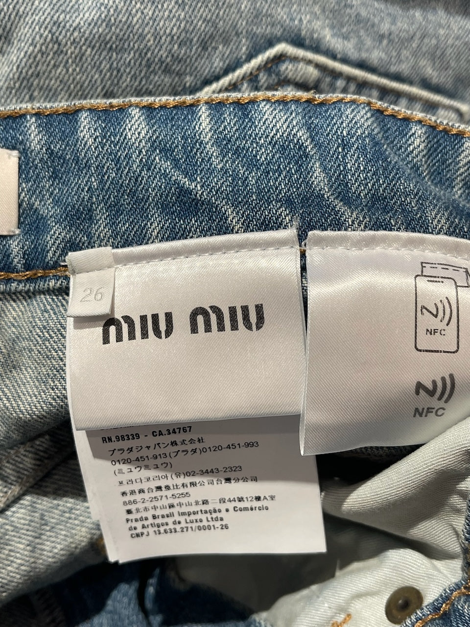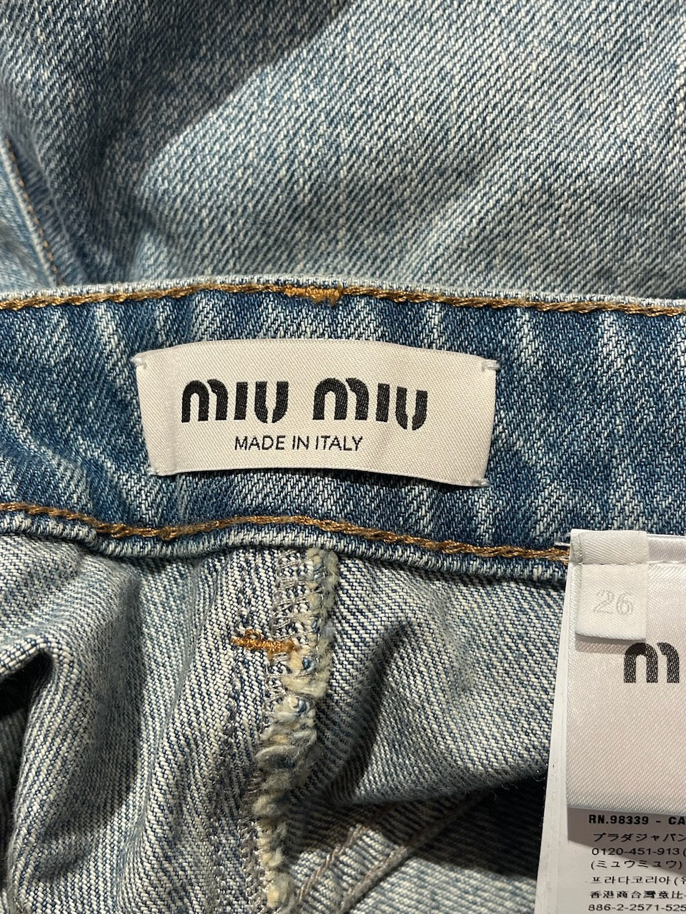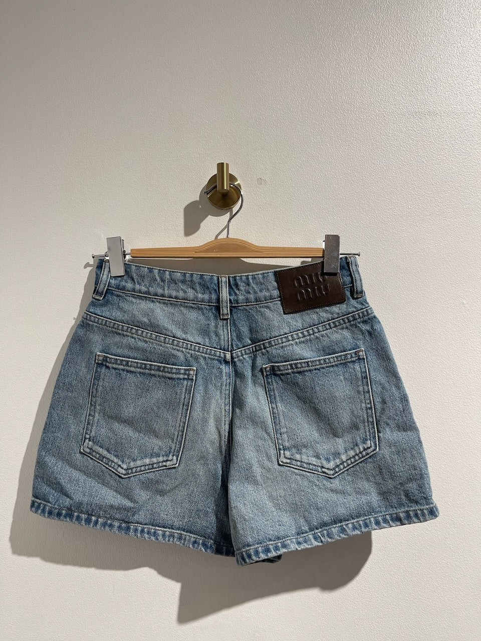 Short en jeans taille haute en coton bleu avec passant de ceinture en cuir signé Miu Miu. Fermeture zippée et bouton à la taille.