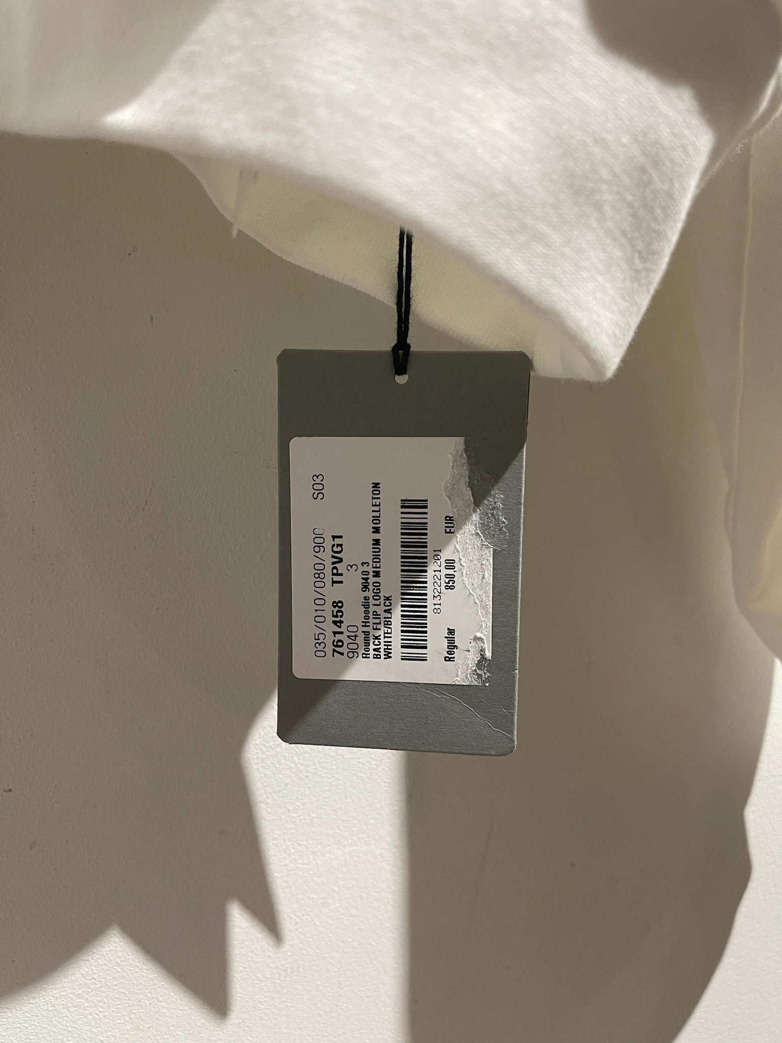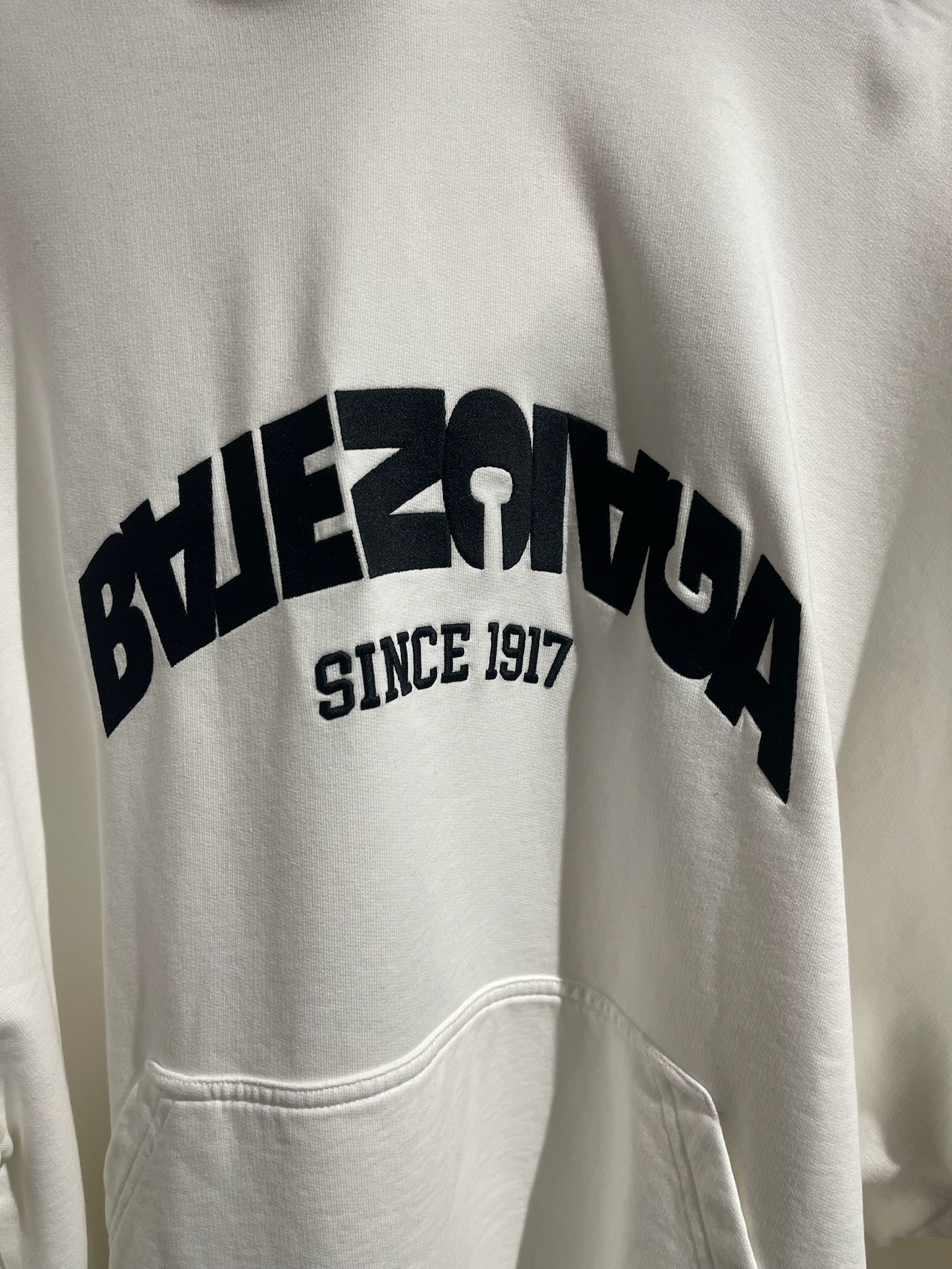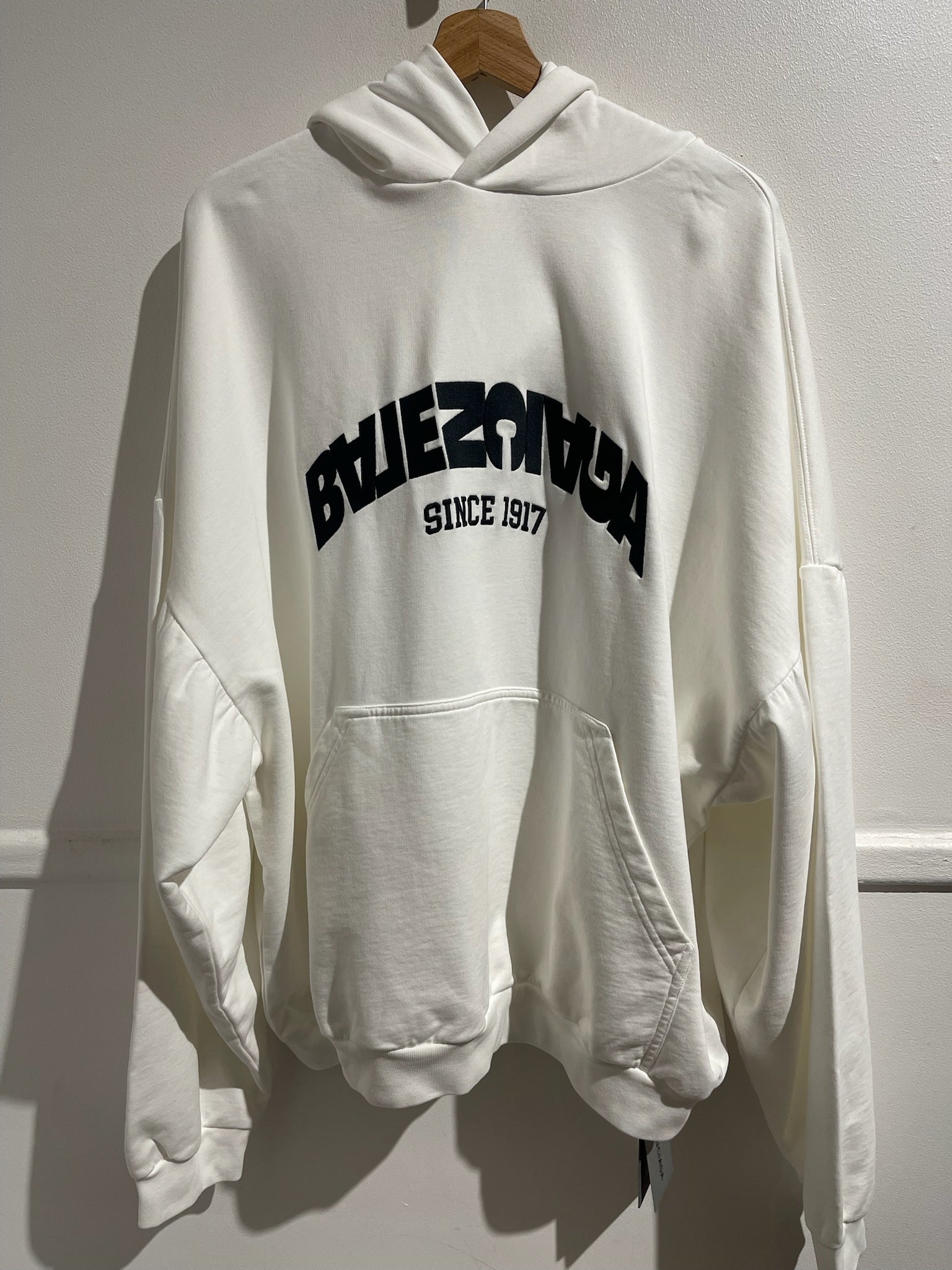 Sweatshirt en polyester blanc avec logo Balenciaga au centre à l'envers. Coupe oversize avec capuche, manches larges et poche avant.