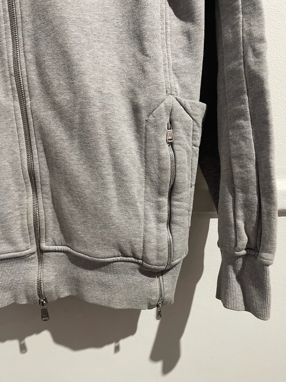 Sweat à capuche en coton gris avec fermeture zippée, poches latérales zippées et ourlets zippés sur les côtés. Effet matelassé au dos. Bords en maille côtelée.