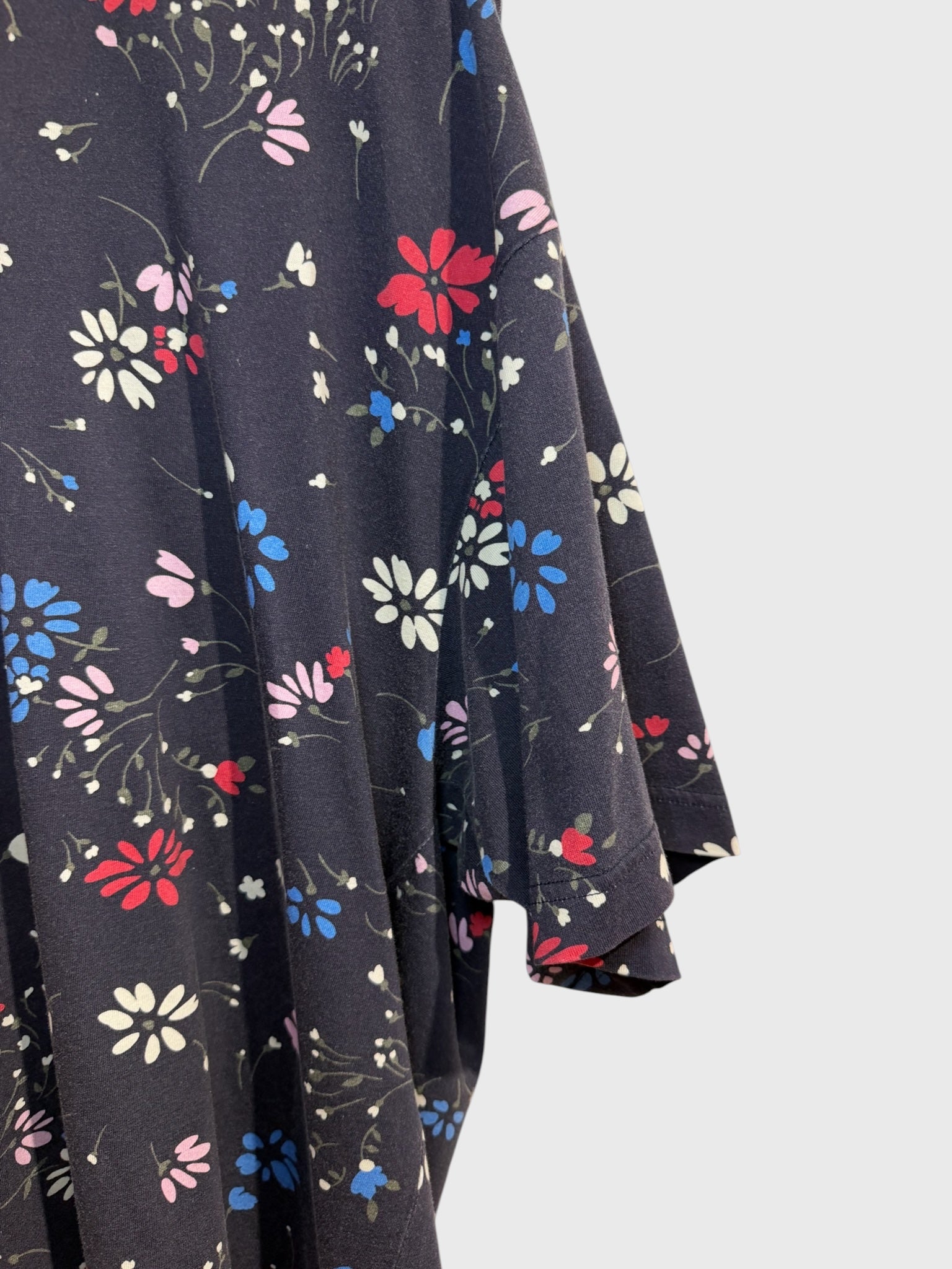 T-shirt en 100 % coton bleu nuit avec imprimé floral multicolore. Col rond et manches courtes. Découpe au dos. Coupe ample.