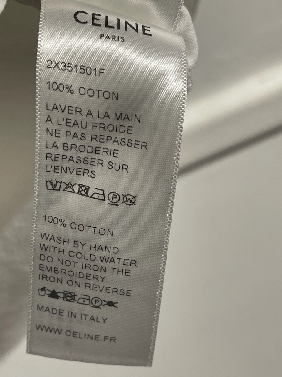 T-shirt en coton blanc avec broderie Celine à la poitrine, col rond et manches courtes.