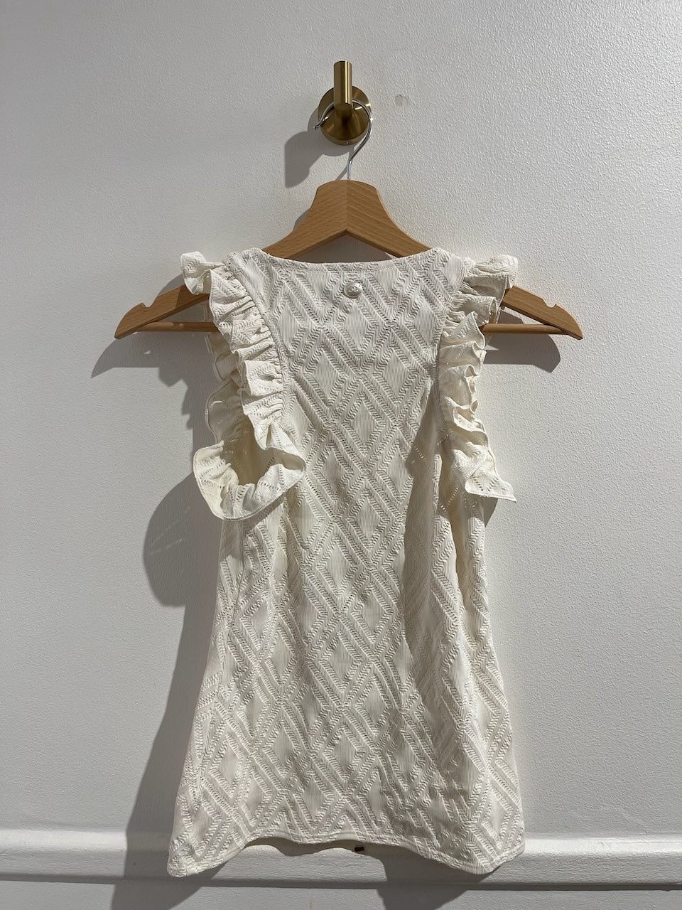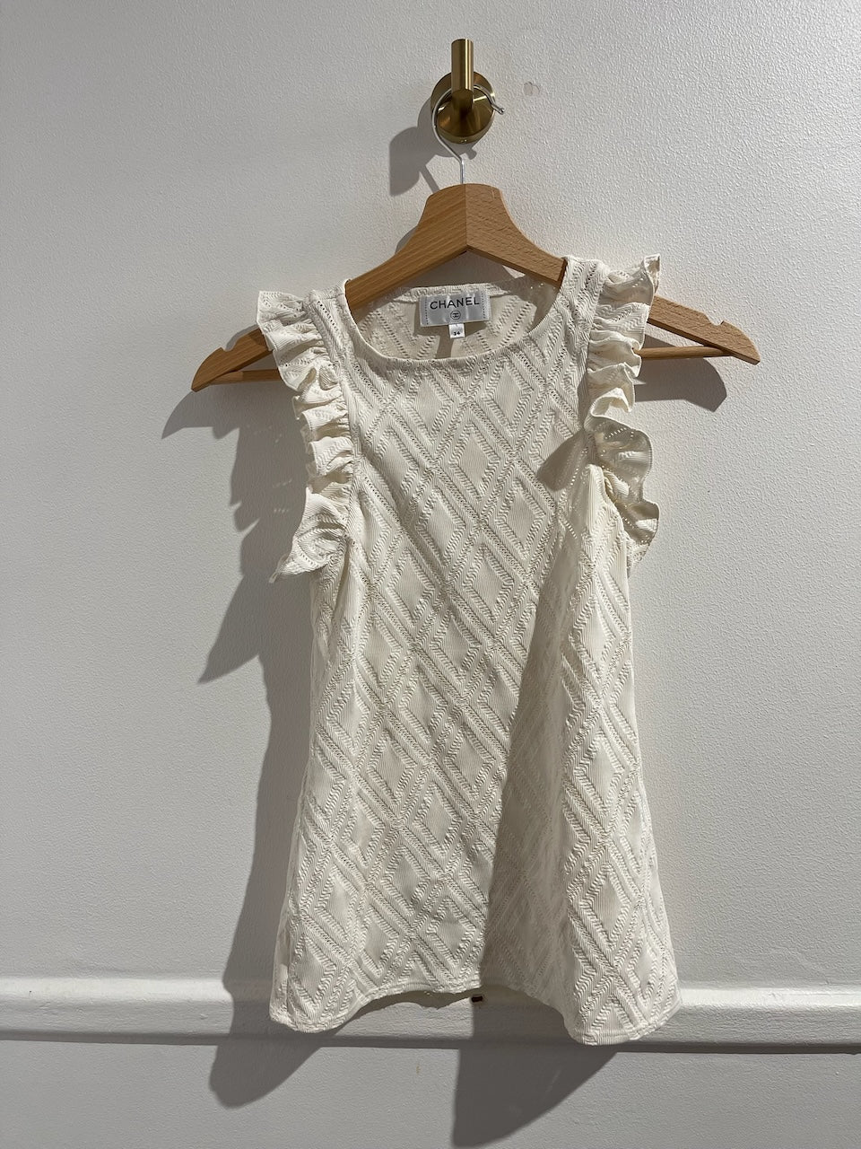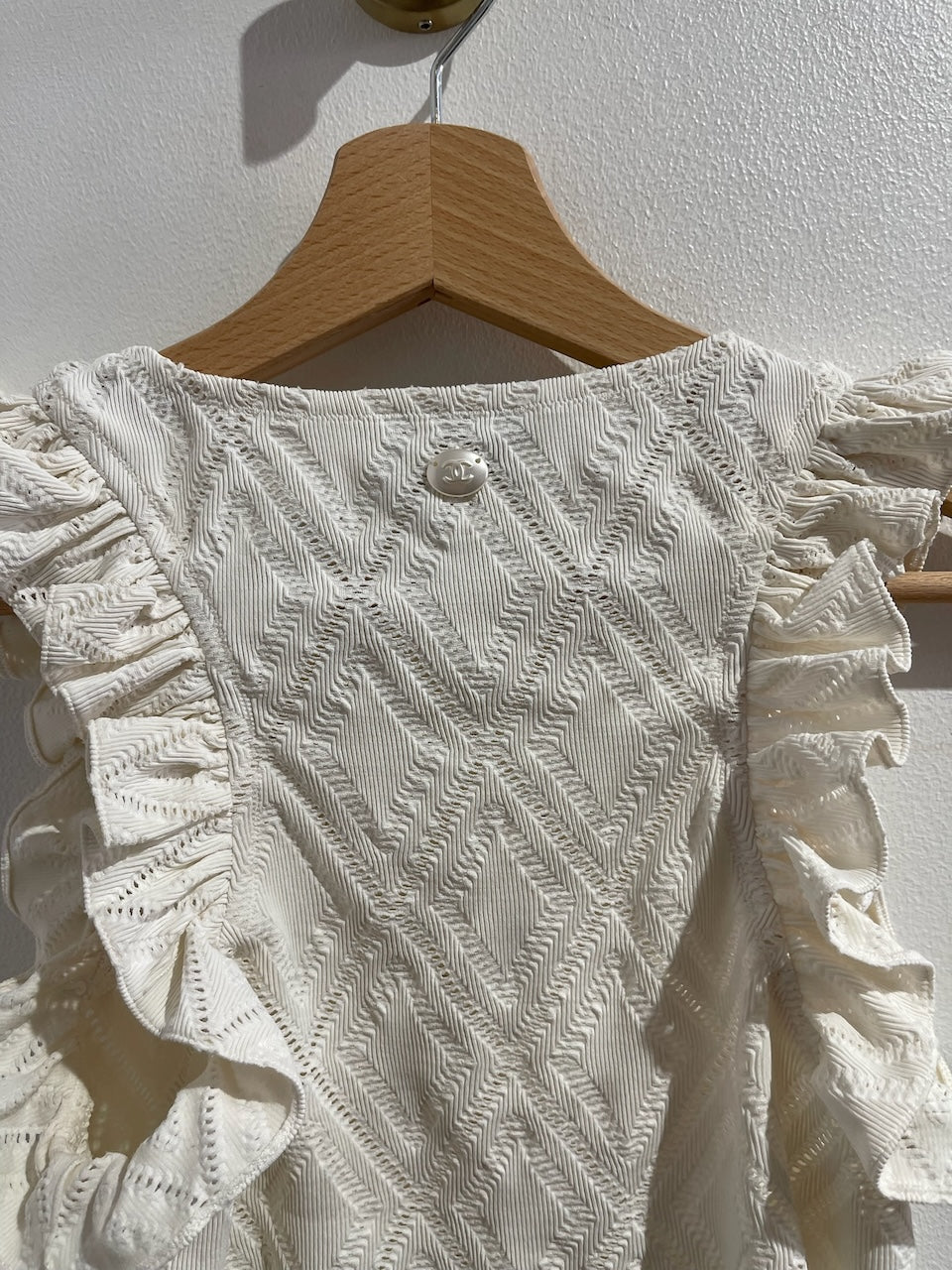 Top en maille ajourée blanc avec volants aux manches. Perle signé CC brodé au dos du col. Coupe près du corps.