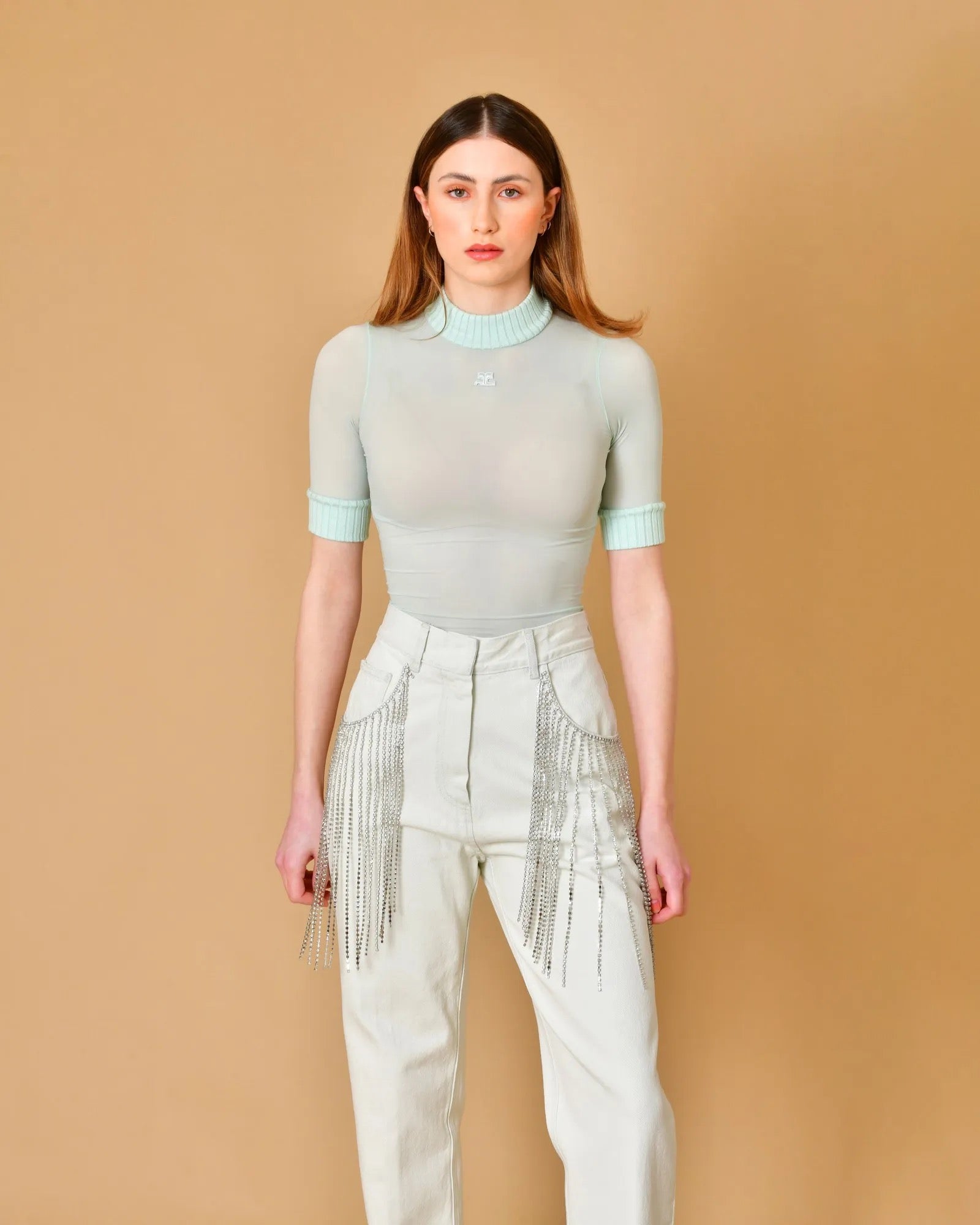 T-shirt en cupro transparent bleu ciel avec col rond et bord des manches courtes en maille côtelée. Coupe près du corps.