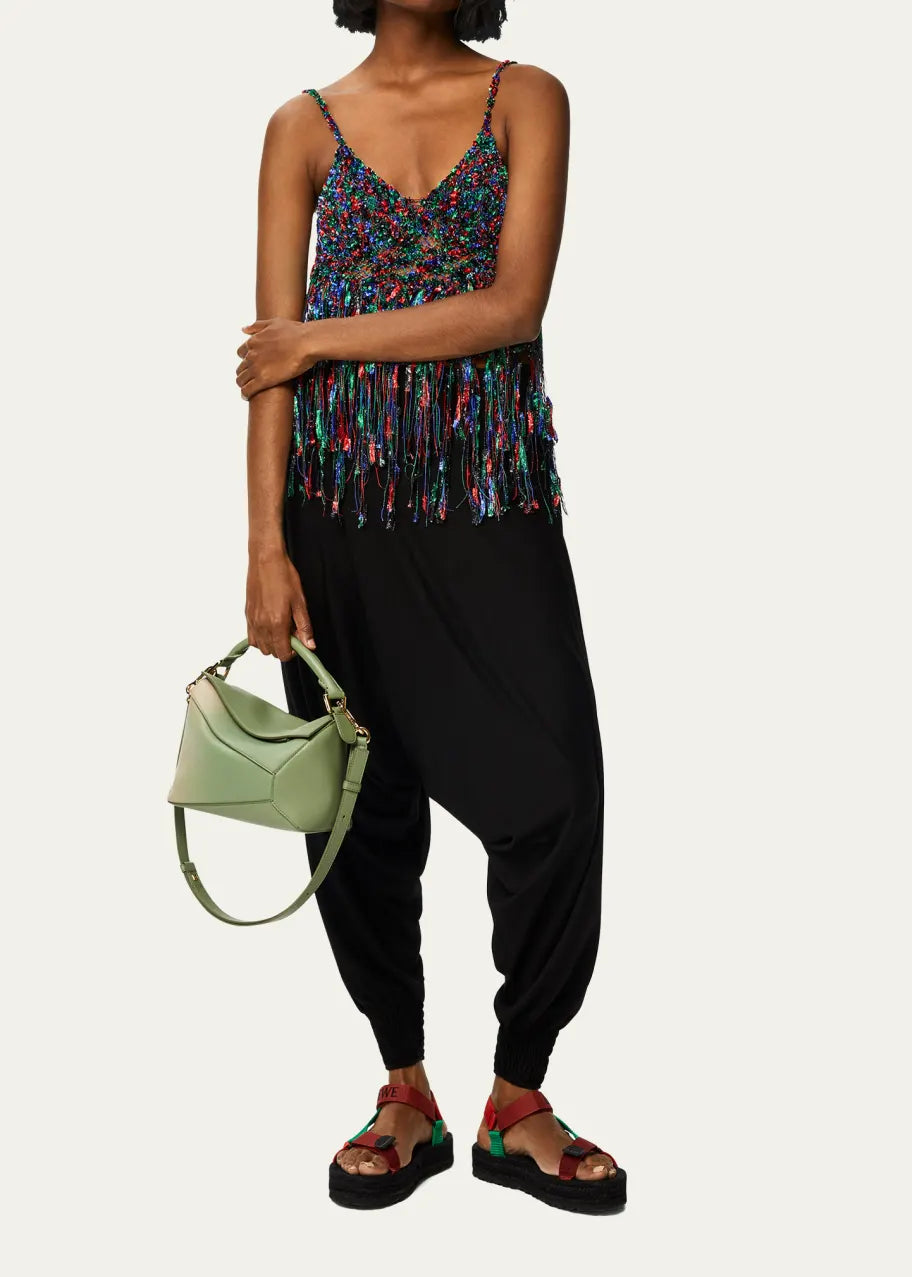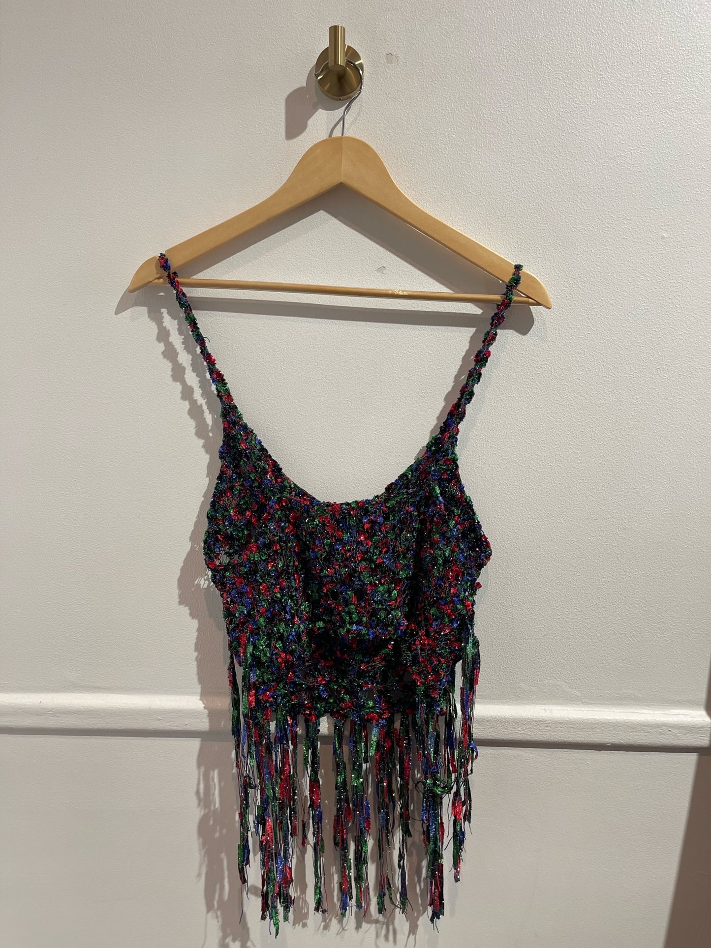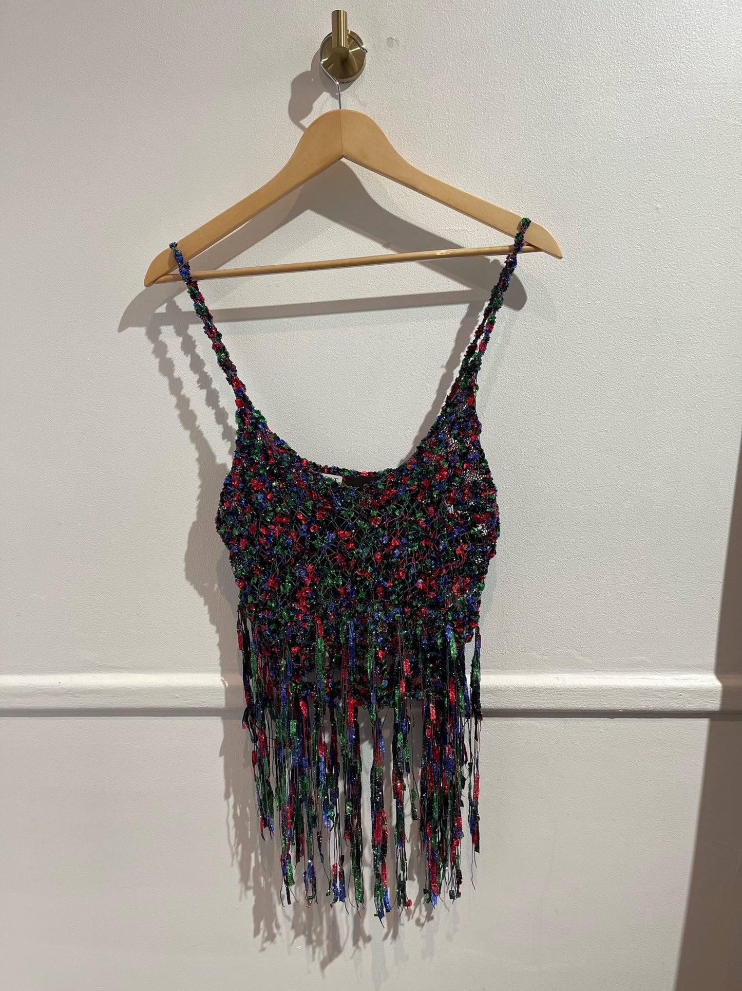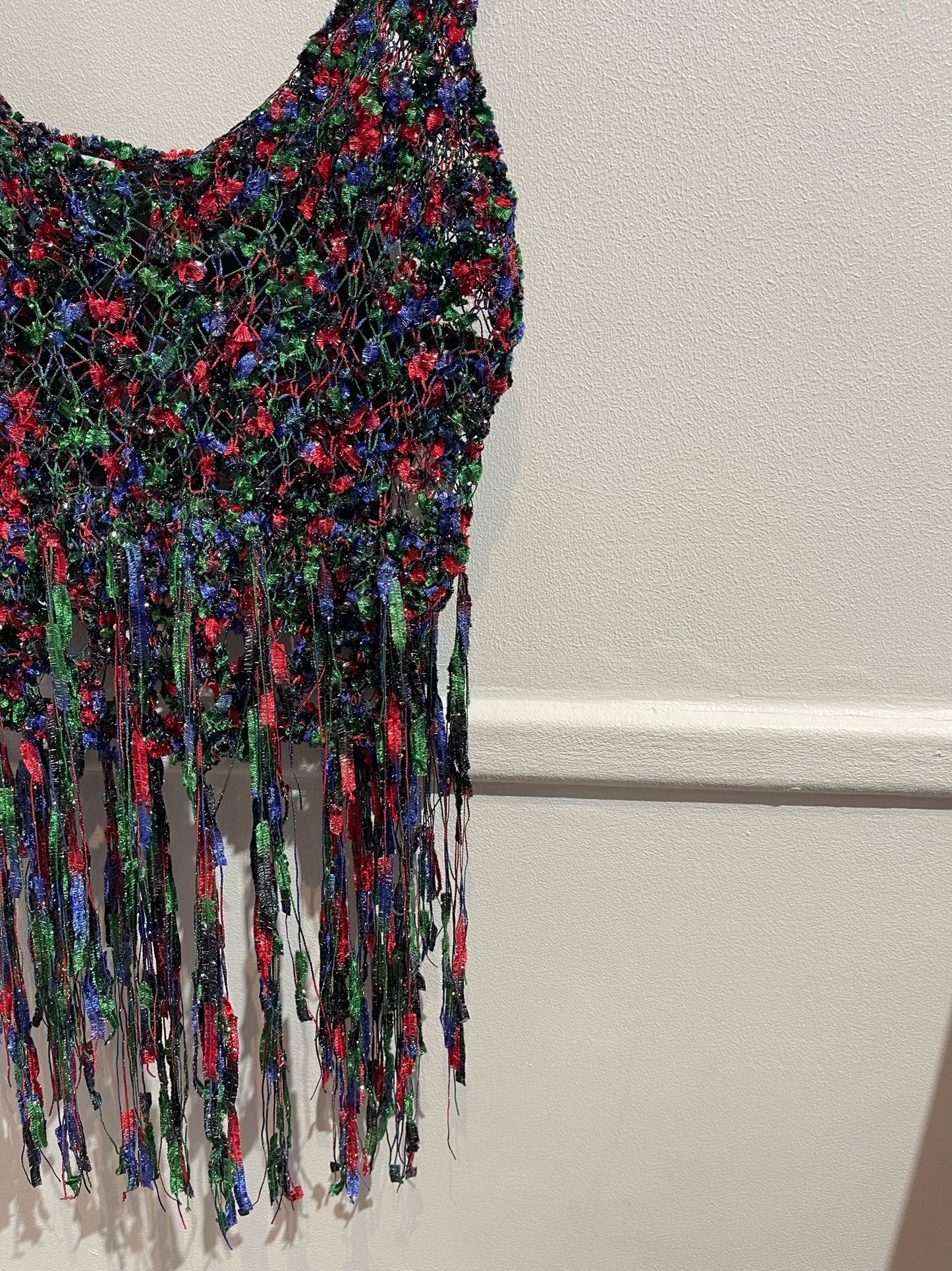 Top en polyamide et lurex rouge, bleu, violet et vert à fines bretelles et franges asymétriques à l'ourlet. Maille effet crochet.