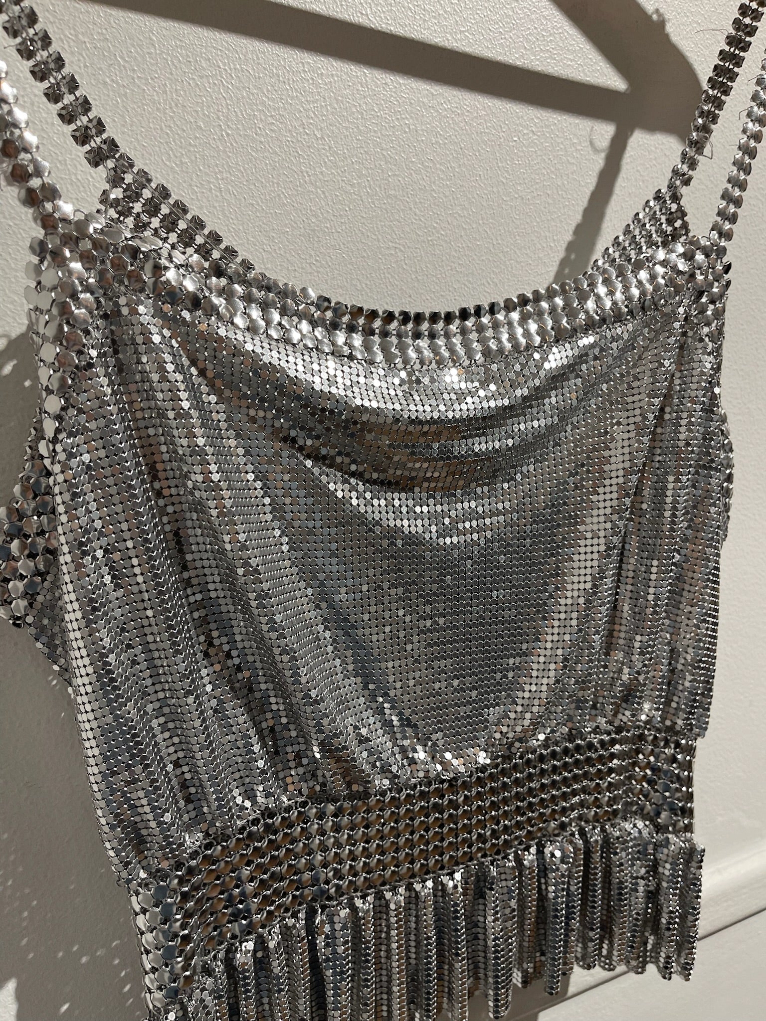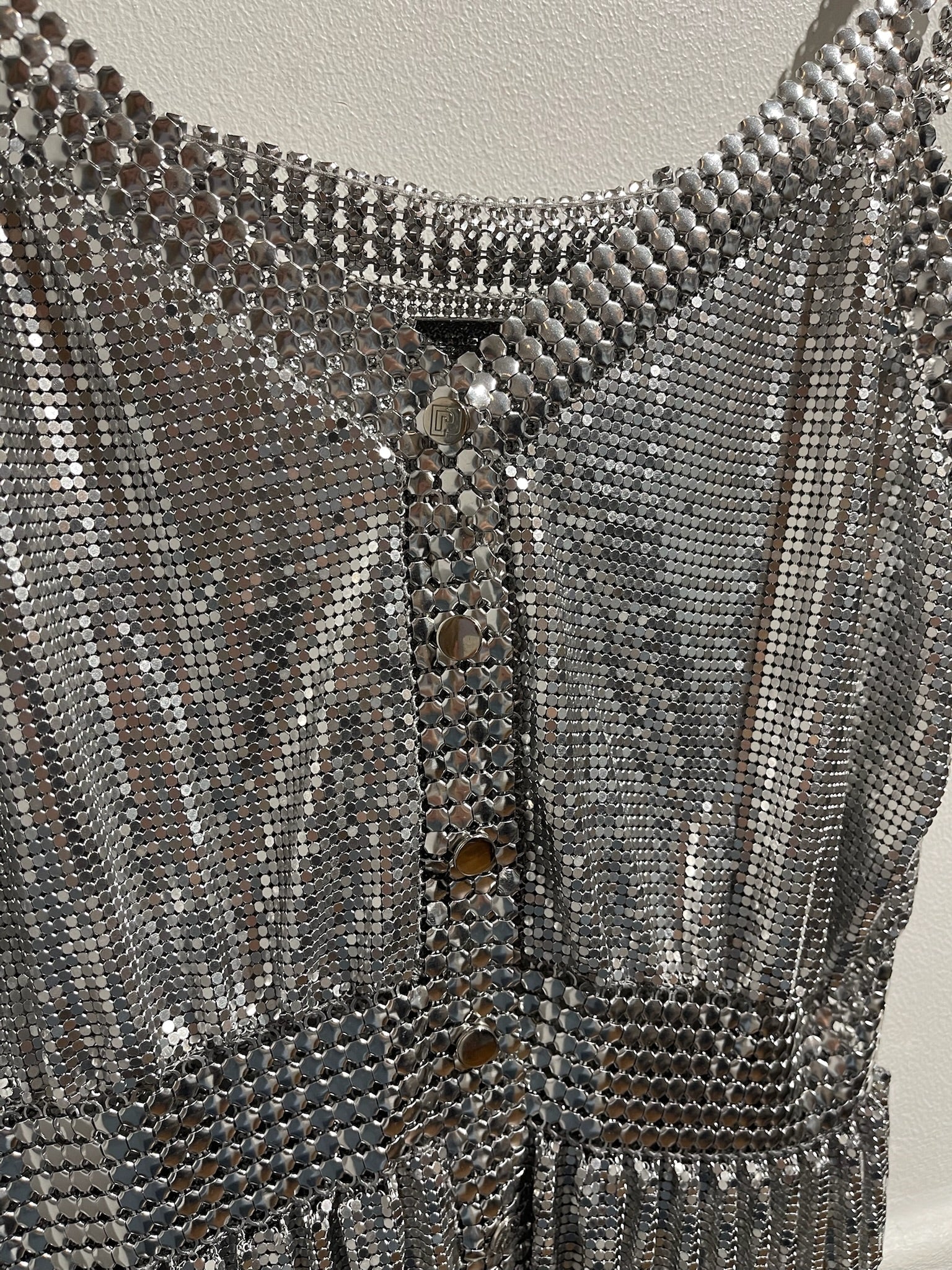 Top emblématique réinventé pour la capsule Endless Summer. Fabriqué à partir d'un tissu en maille argentée. Bretelles fines et col V. Fermeture bouton pression signé Rabanne.