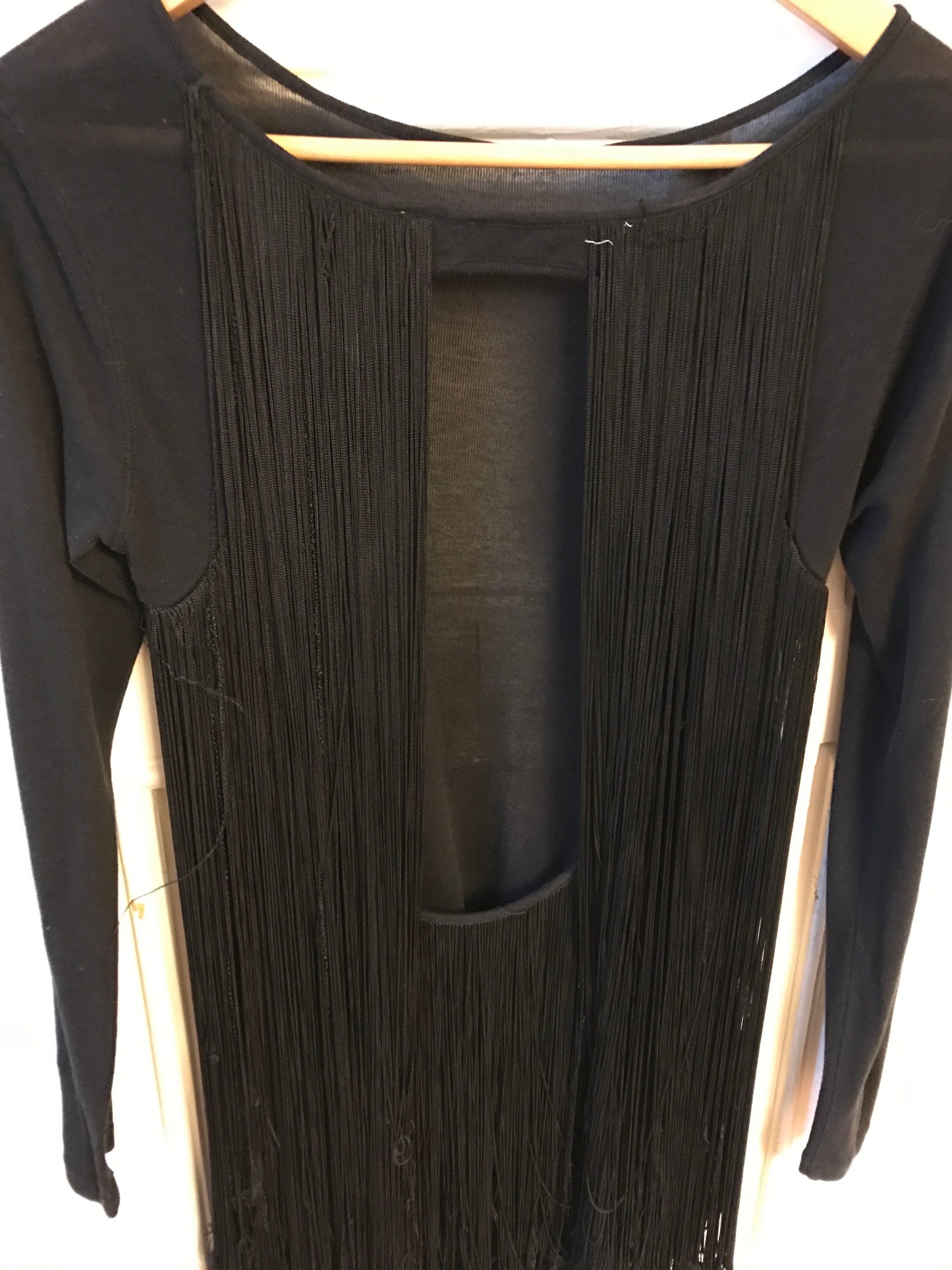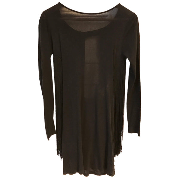 Tunique en coton et soie noire, ouverte dans le dos et agrémentée de franges noires.